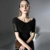 Primavera e Verão Nova Manga Curta Malha Grande V-neck Off-shoulder T-shirt elegante base interna