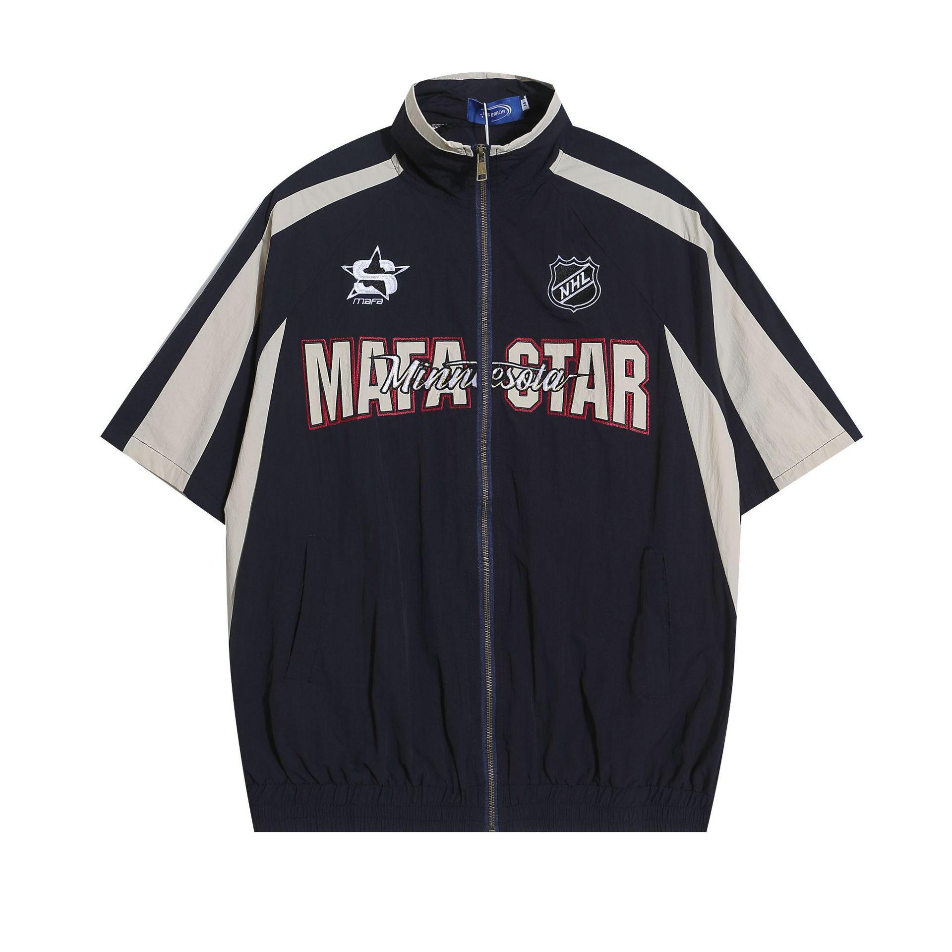 American Retro Contrast Stitching Bordado Short Top para homens e mulheres Street Couple Sports Casual Loose Short-sleeved Thin Jacket