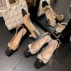 Elegante All-match Cor Combinando Arco Couro Completo 2022 Primavera Novo Estilo Fino Salto Médio Bico Quadrado Bico Arredondado Sandálias Femininas Costas Vazias Sapatos de Camada Única