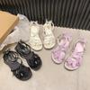 Sandálias de moda de arco de vestido estilo fada feminino verão 2024 novo estilo coreano fivela de cunha sapatos romanos