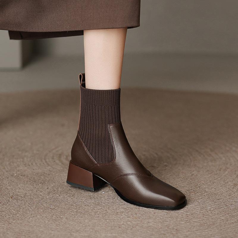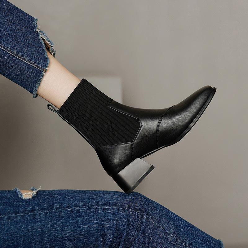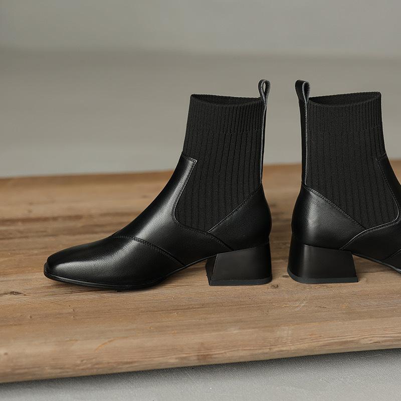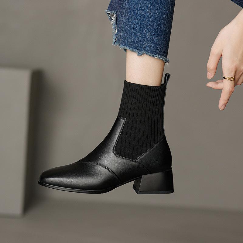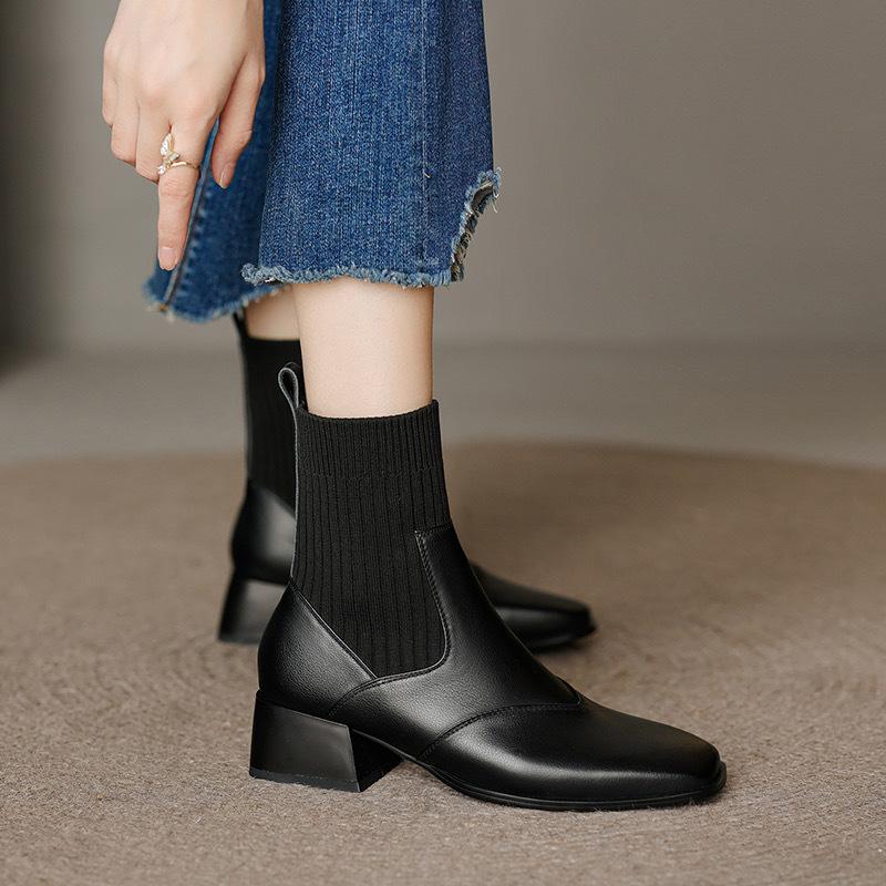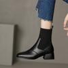Manga de malha meias finas elásticas vintage dedo quadrado botas curtas de salto médio grosso para mulheres outono e inverno Novos botins