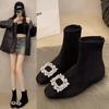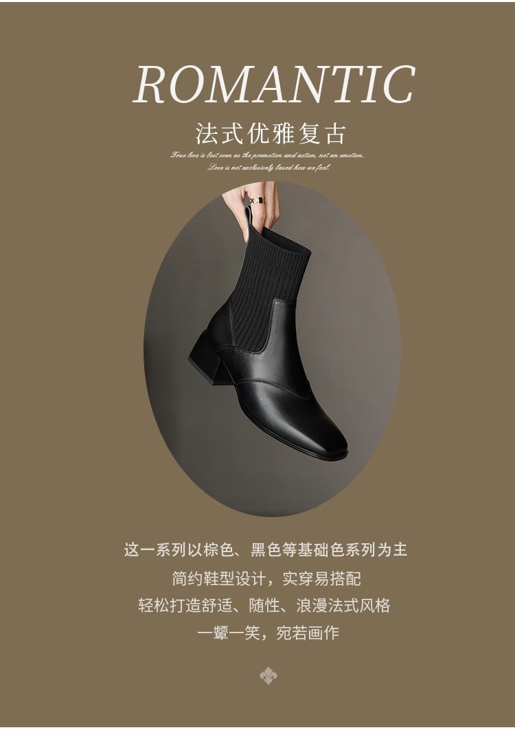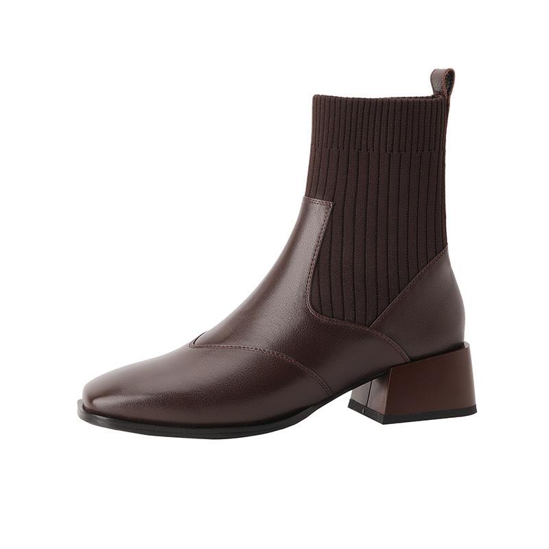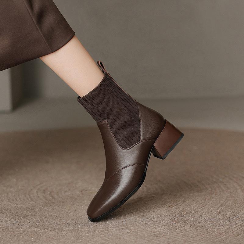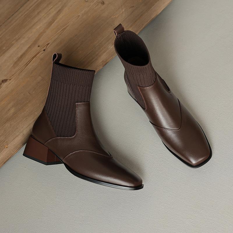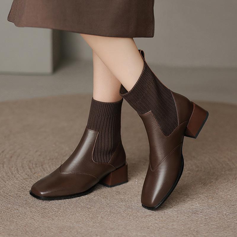 Manga de malha meias finas elásticas vintage dedo quadrado botas curtas de salto médio grosso para mulheres outono e inverno Novos botins