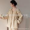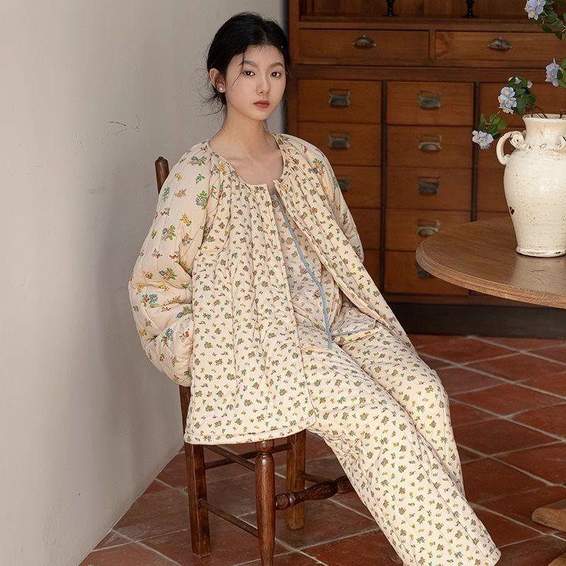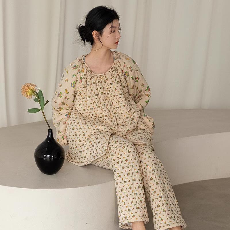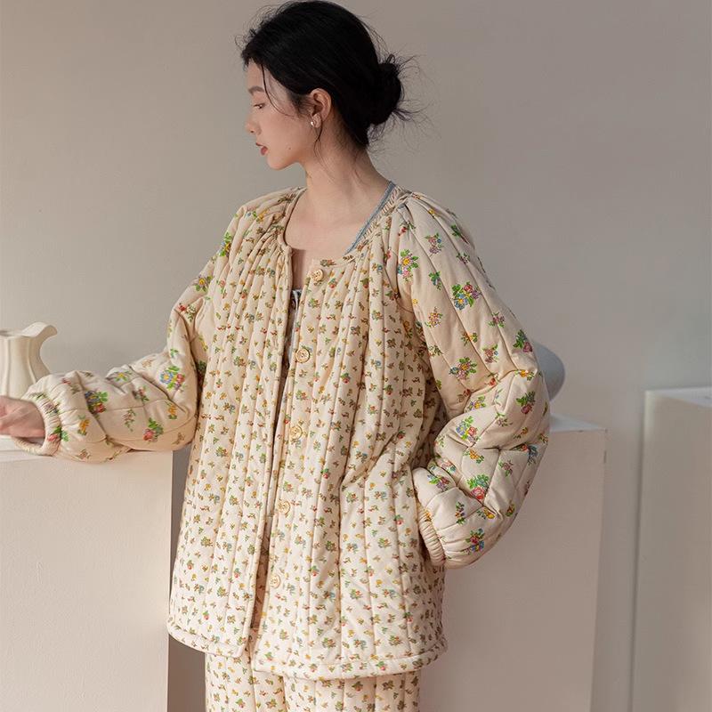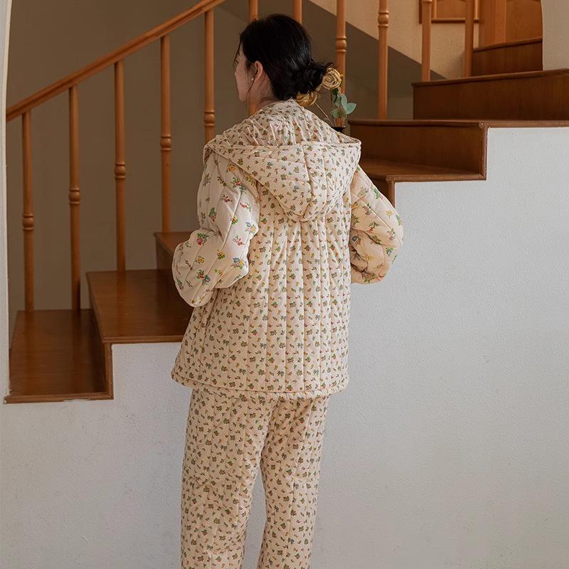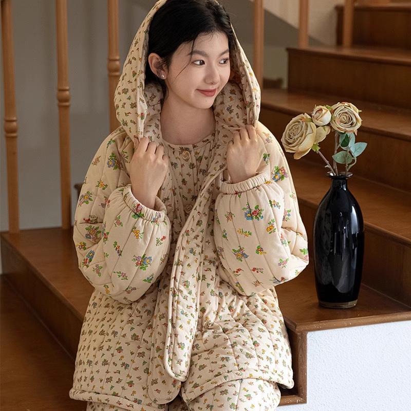 Pijama de Outono e Inverno Zumashi para Mulheres, Estilo Doce Floral com Capuz, Acolchoada Espessa Quente Tamanho Grande Roupa de Descanso 8205