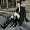 Lin Xiangwan 2023 novo estilo botas de cano alto femininas botas de cavaleiro de salto alto pontiagudo botas de couro envernizado botas de nicho