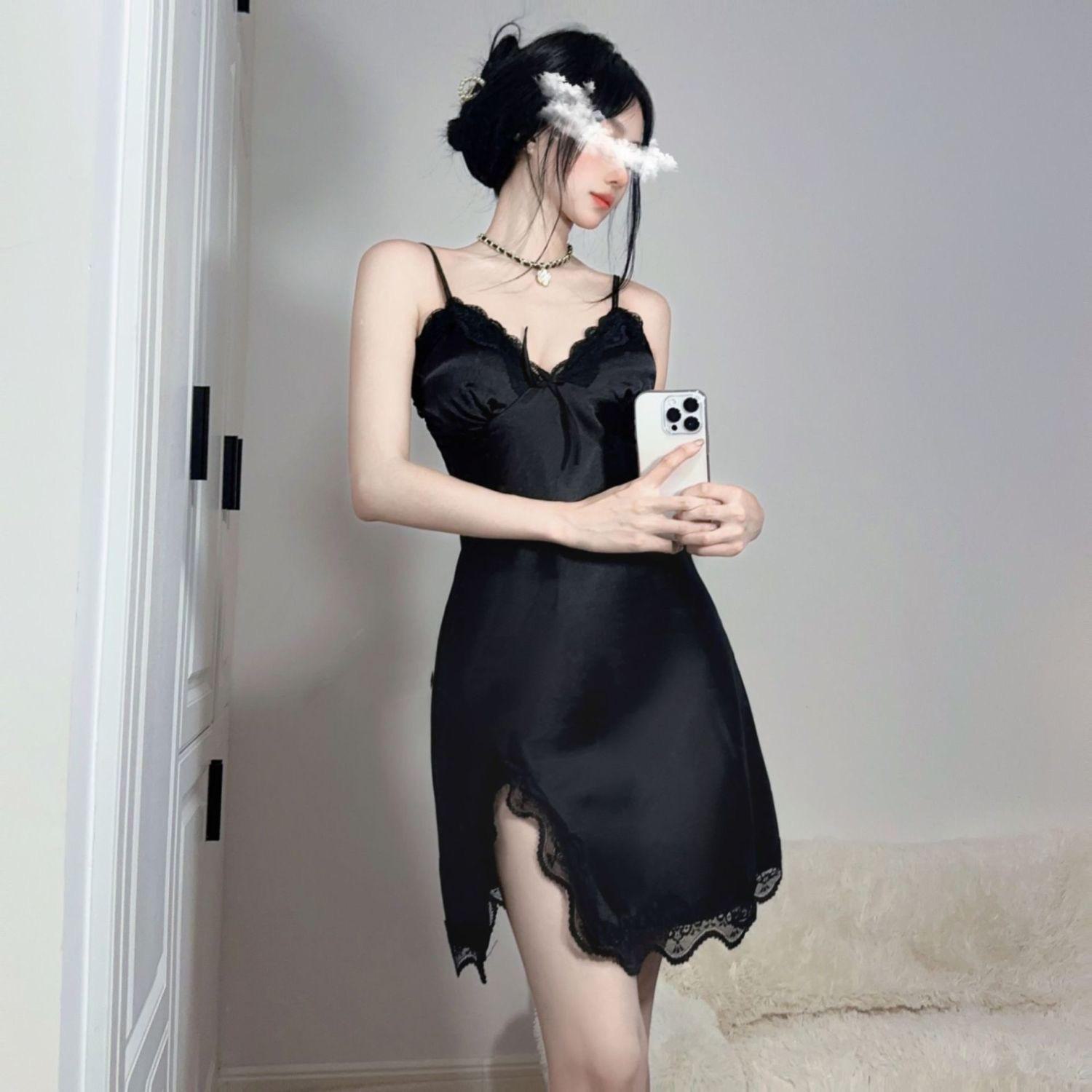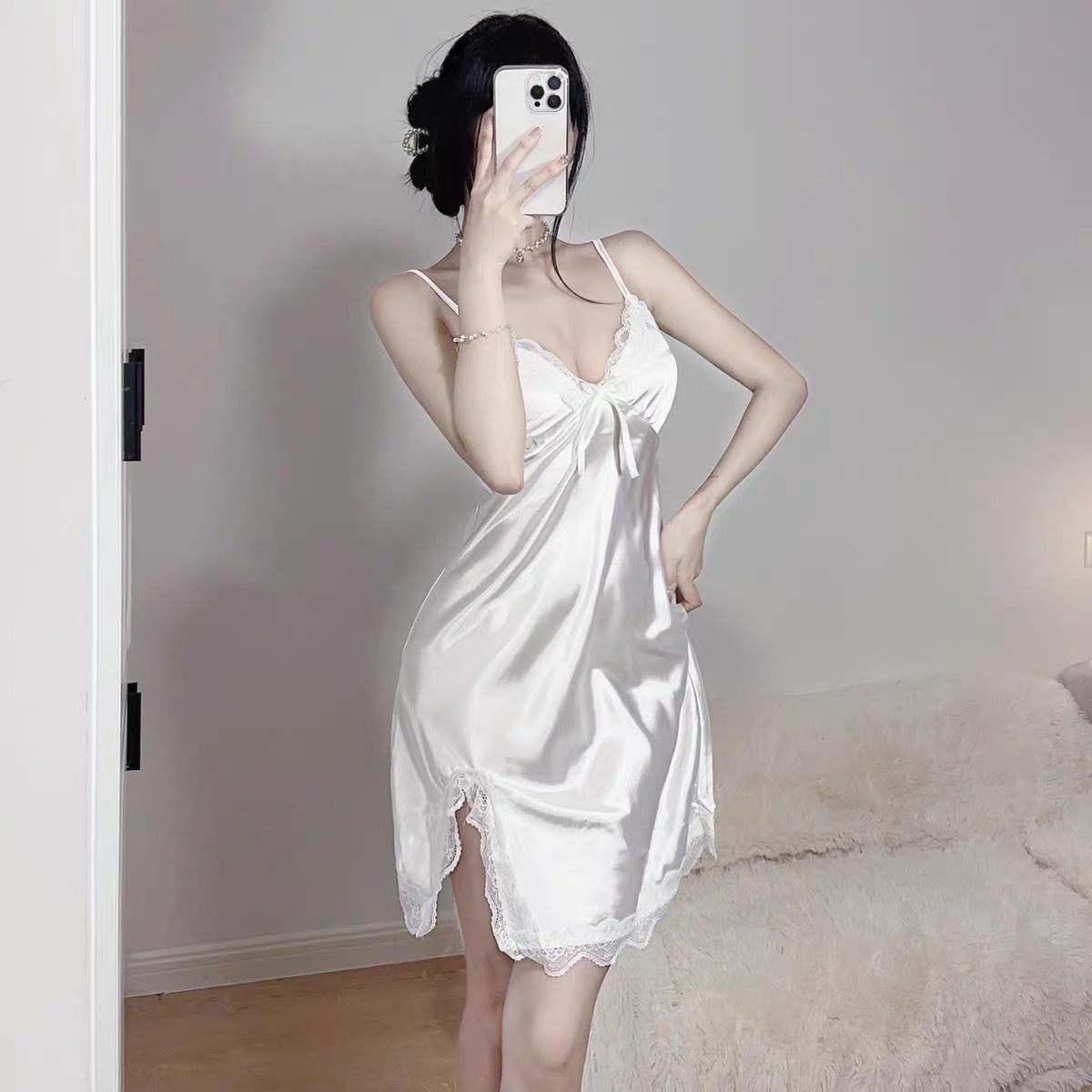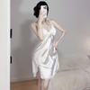 Verão sexy mulheres rendas split Ice Silk pijamas V-neck sling fino outerwear vestido de noite para mulheres ins