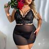 2024 nova lingerie sexy europeia e americana transfronteiriça com decote em V preto perspectiva renda plus size camisola tanga