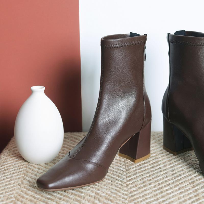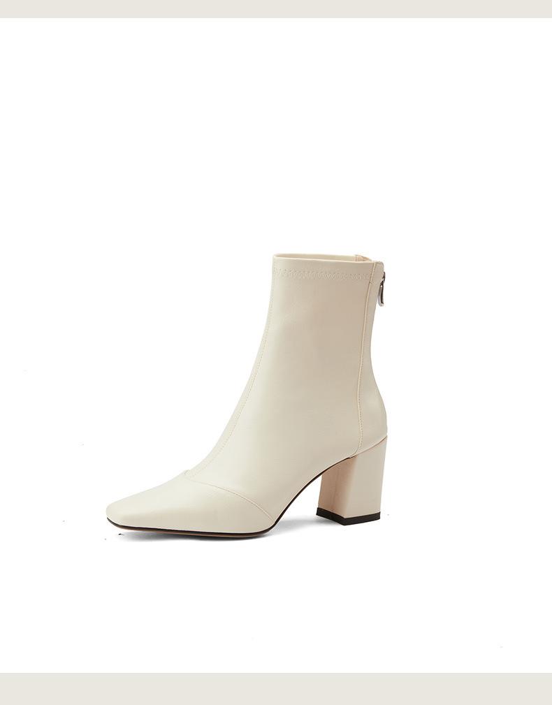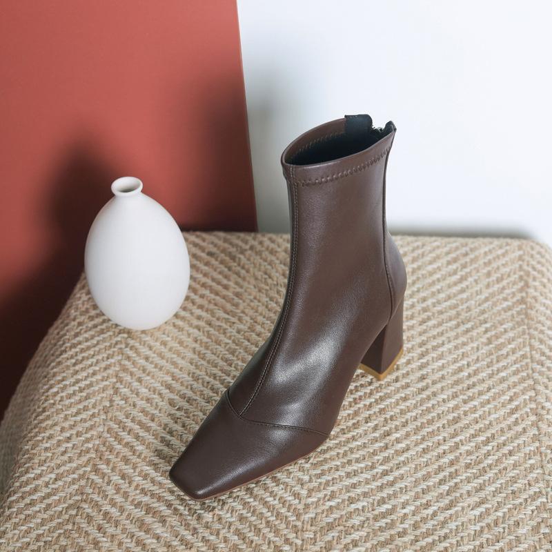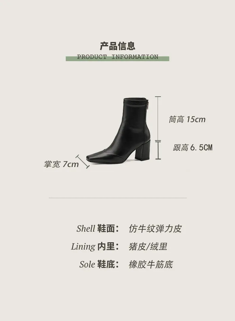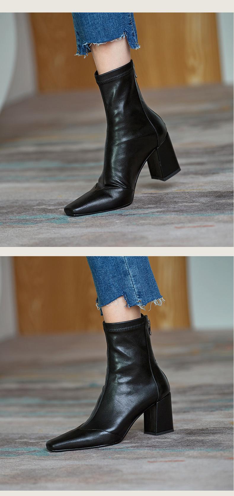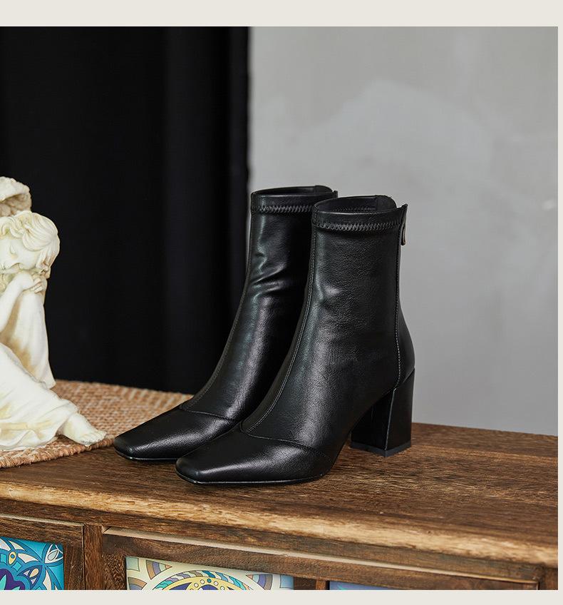 Botas francesas retrô de bico quadrado, justas, salto alto grosso, zíper traseiro, botas simples, outono e inverno, novas botas curtas elásticas de cano baixo para mulheres