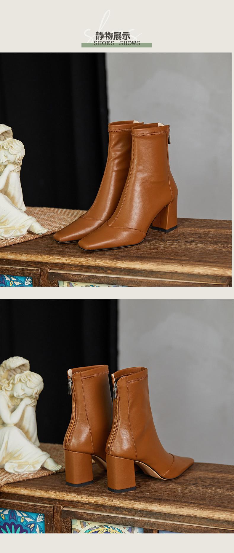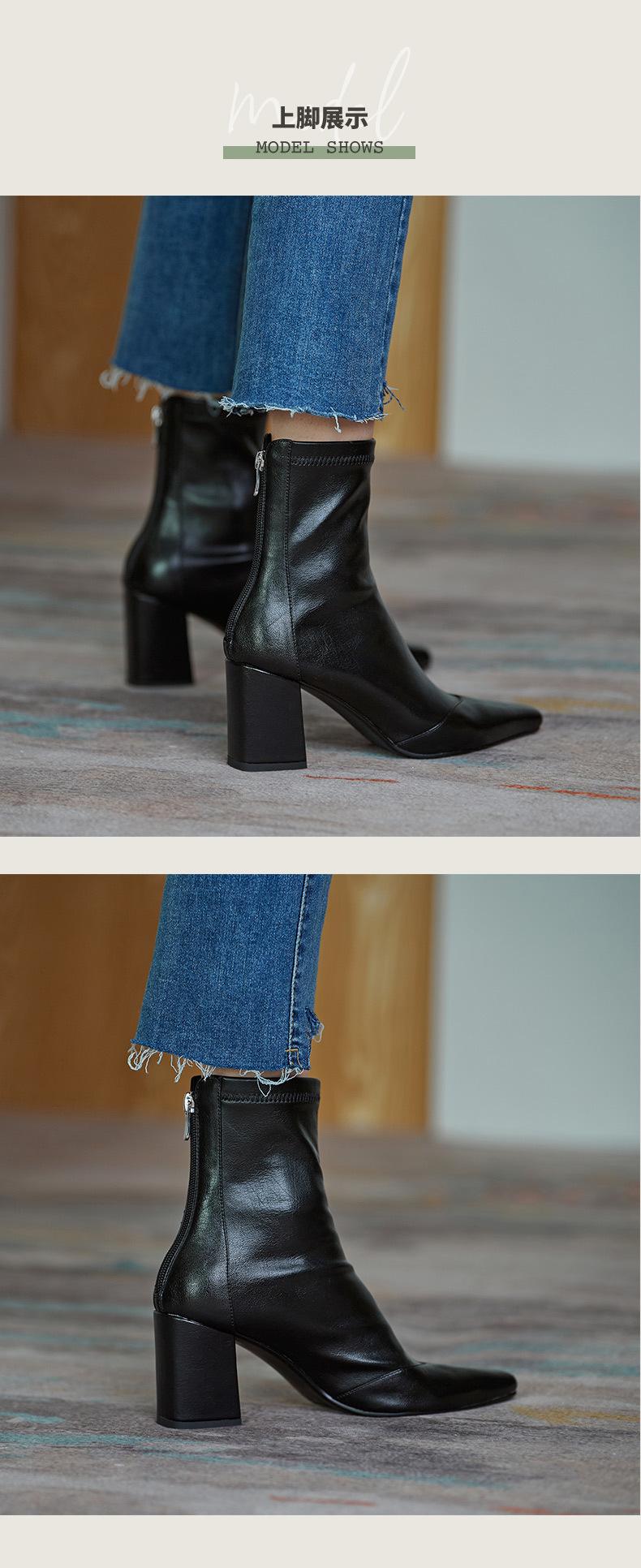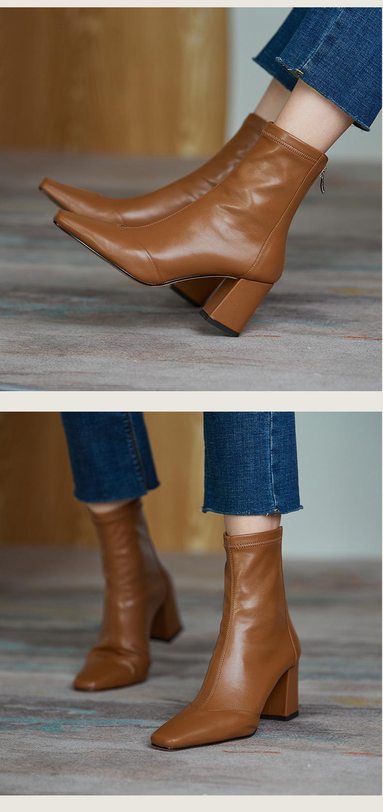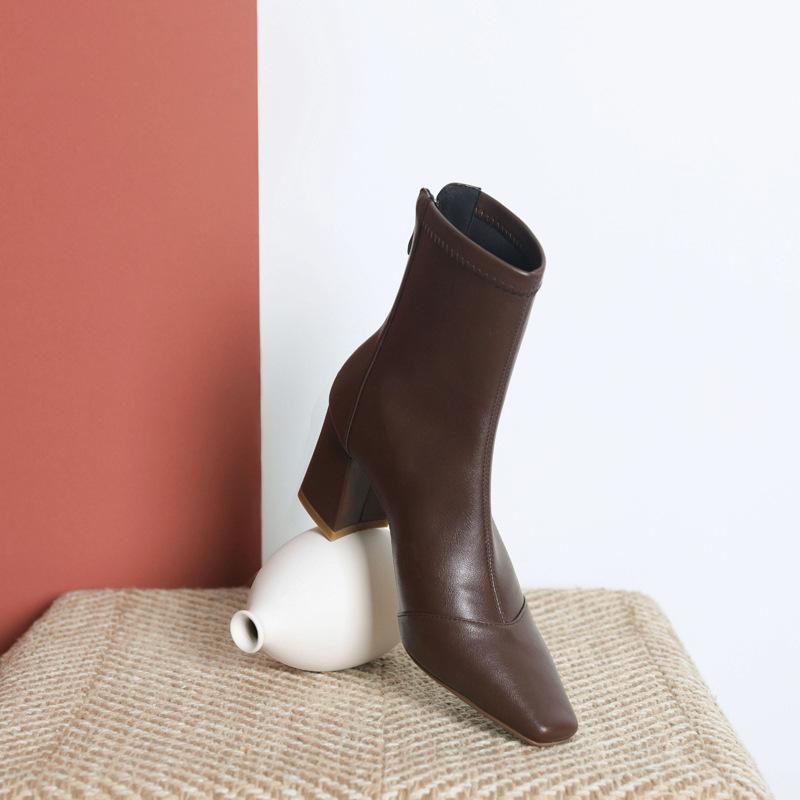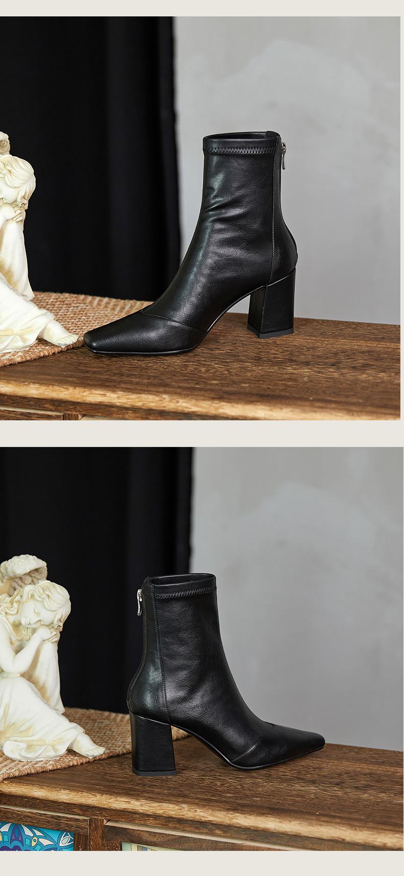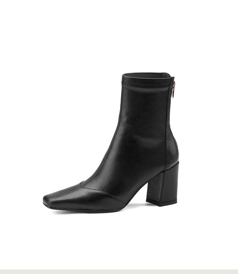Botas francesas retrô de bico quadrado, justas, salto alto grosso, zíper traseiro, botas simples, outono e inverno, novas botas curtas elásticas de cano baixo para mulheres