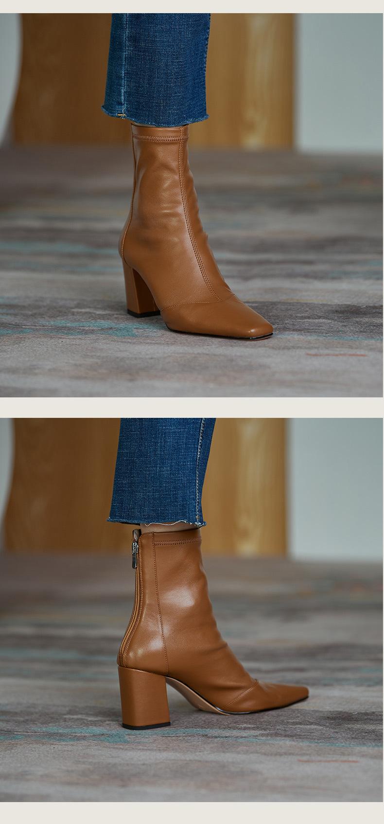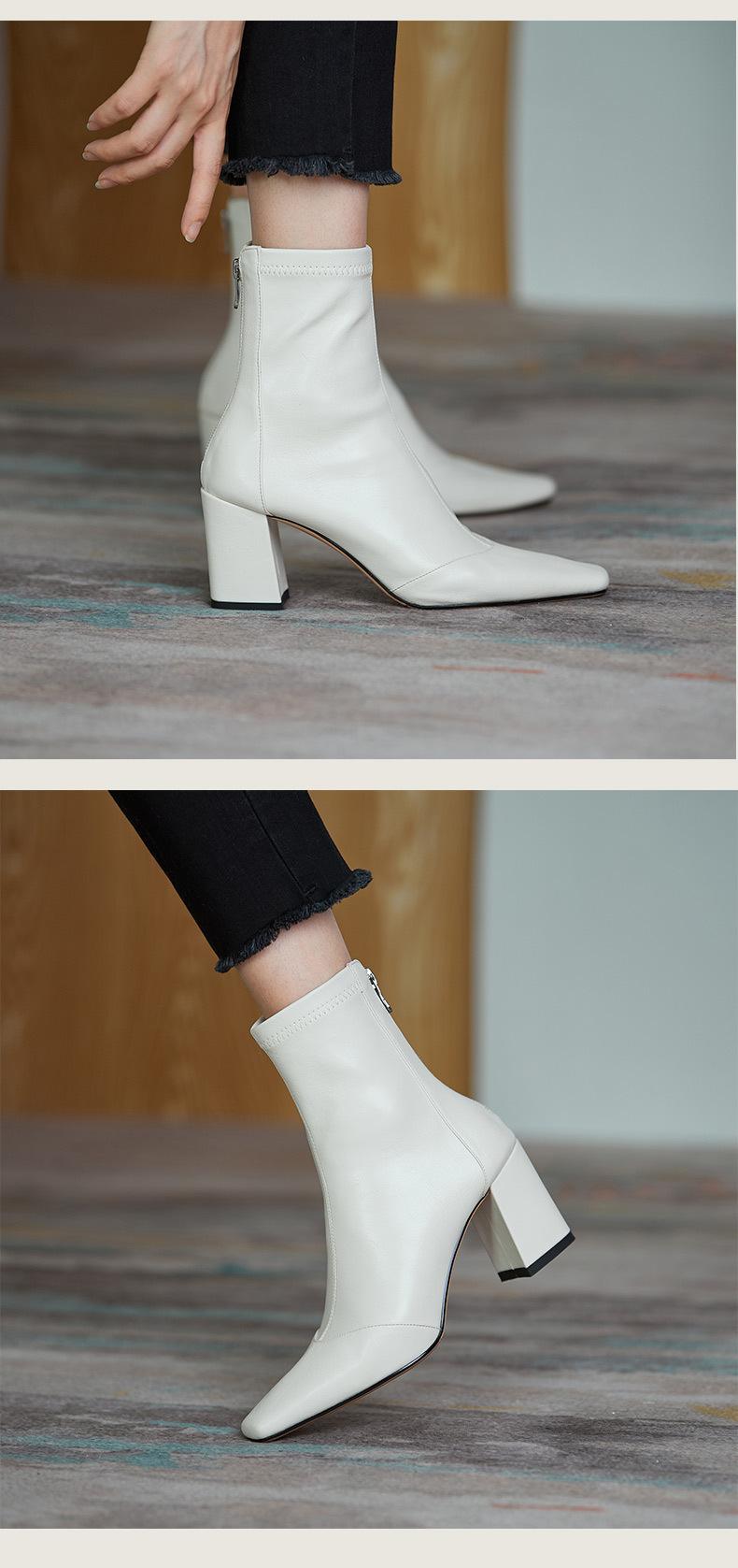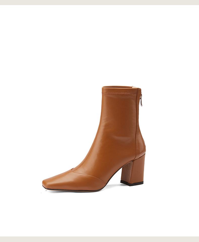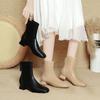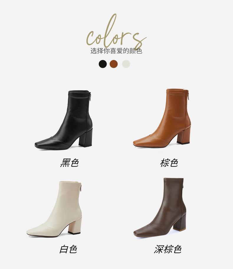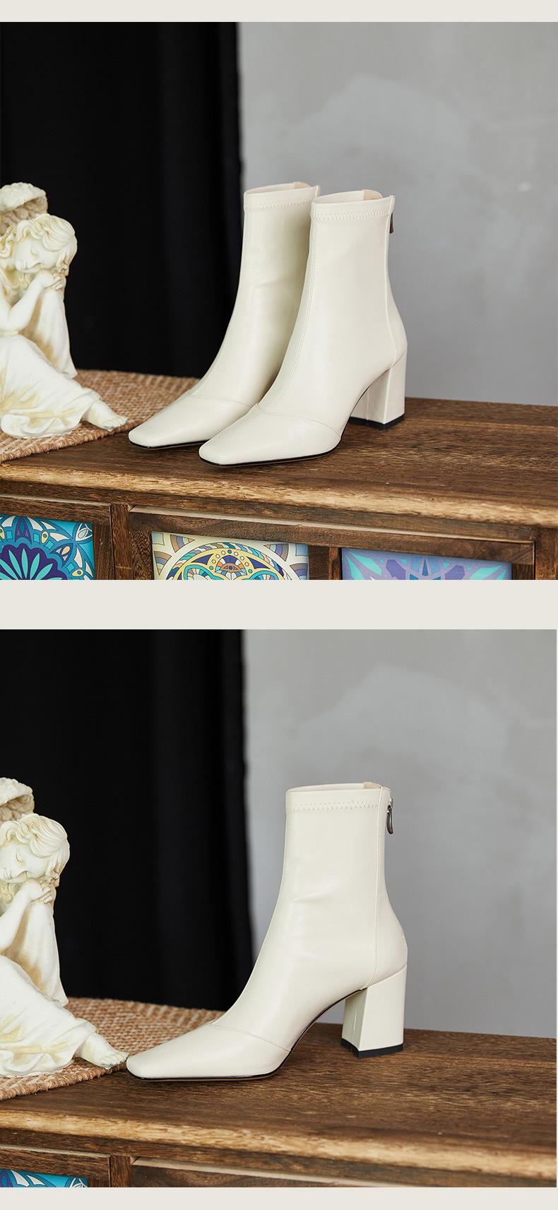 Botas francesas retrô de bico quadrado, justas, salto alto grosso, zíper traseiro, botas simples, outono e inverno, novas botas curtas elásticas de cano baixo para mulheres