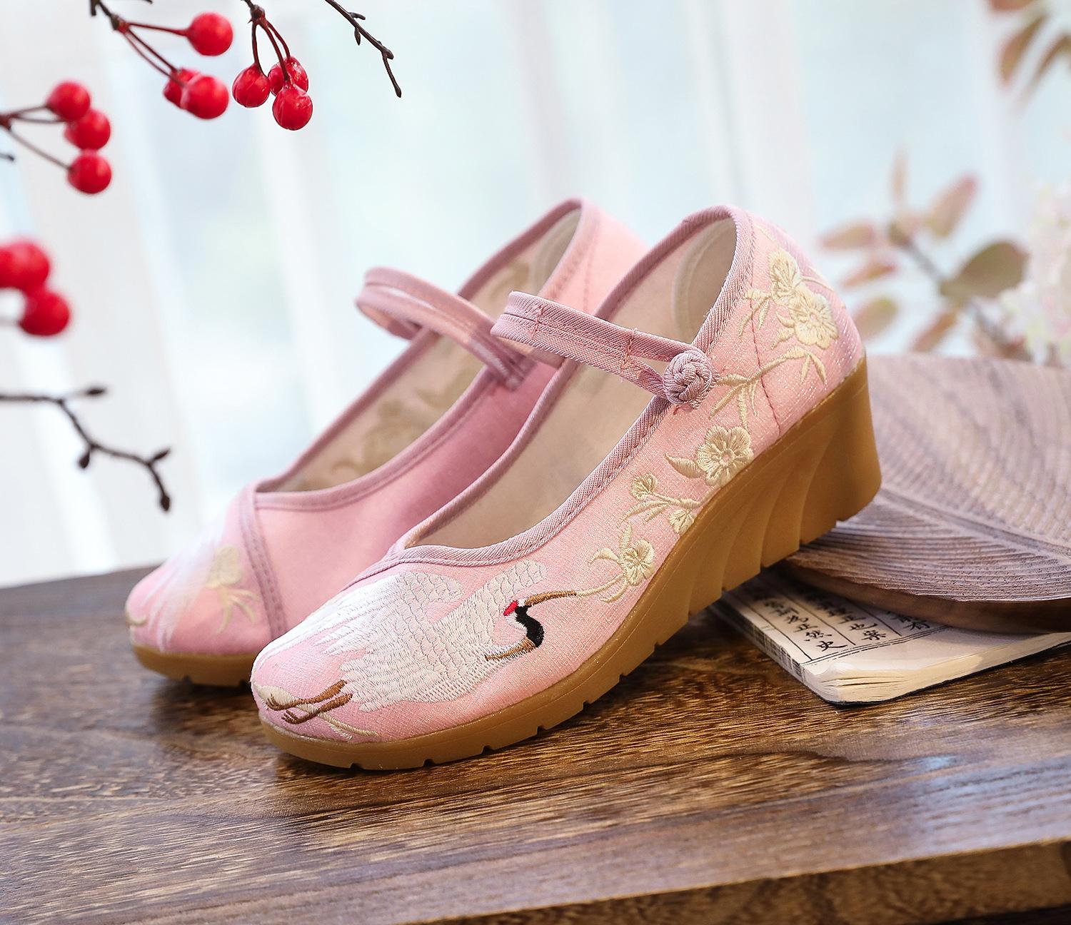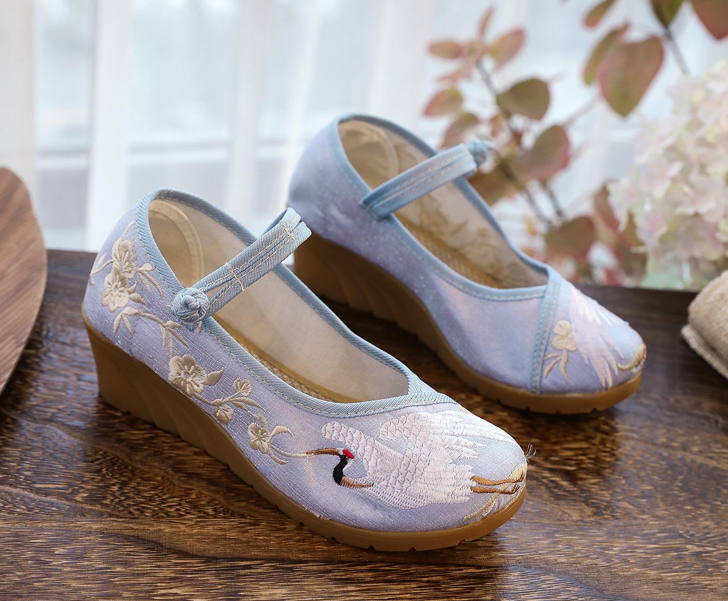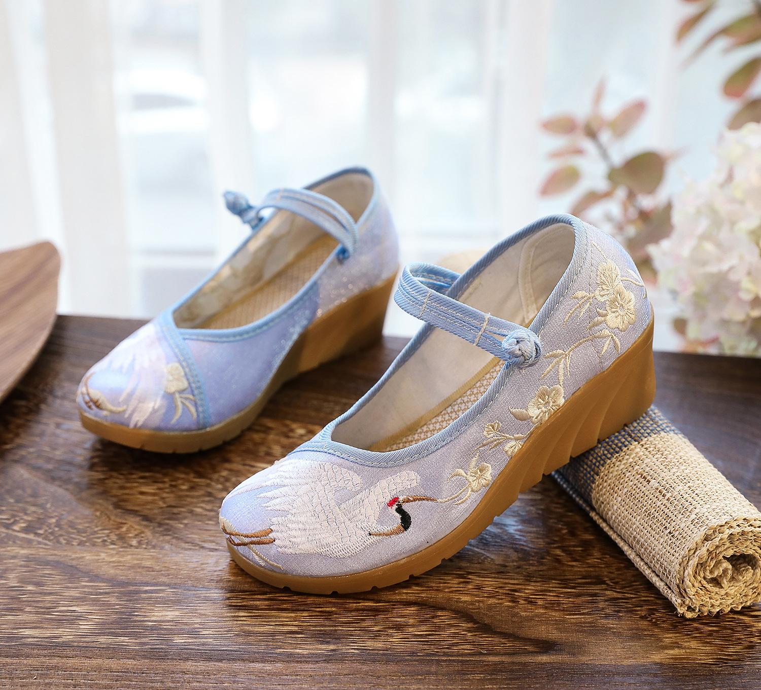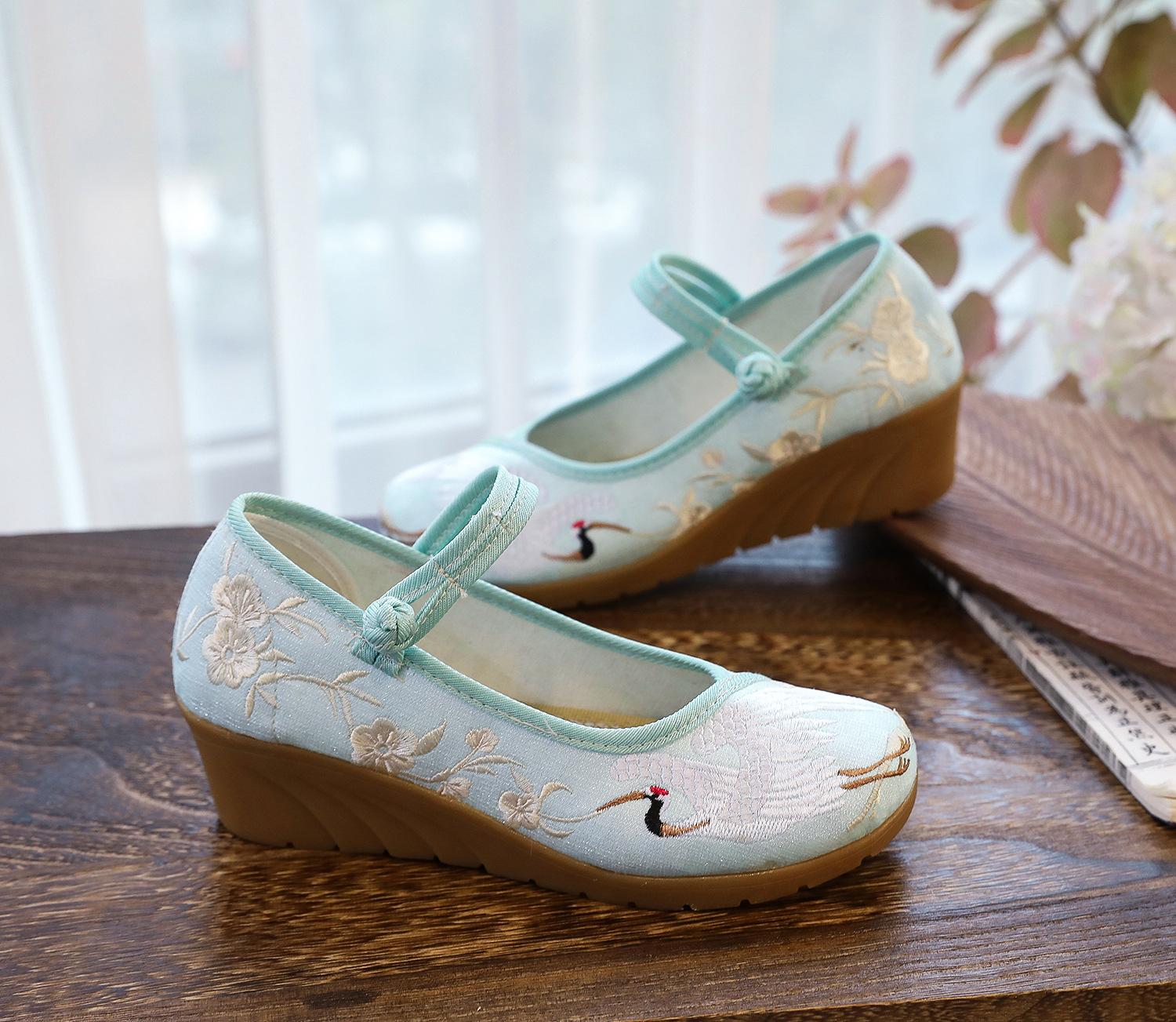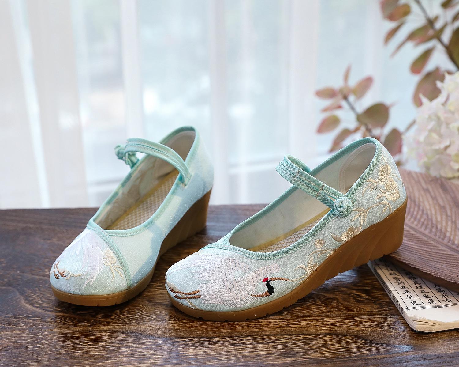 Sapatos de salto alto de camada única Hanfu sapatos guindaste bordado sapatos de pano estilo nacional traje antigo tendão inferior cunha sapatos femininos