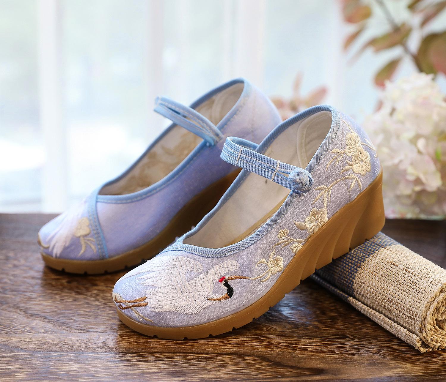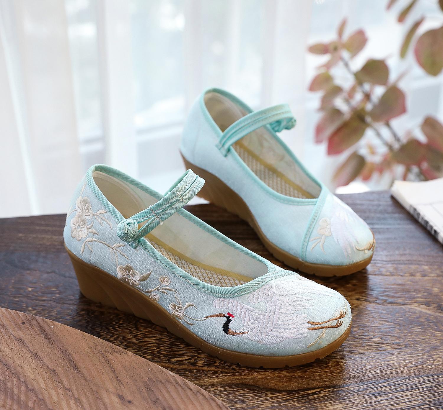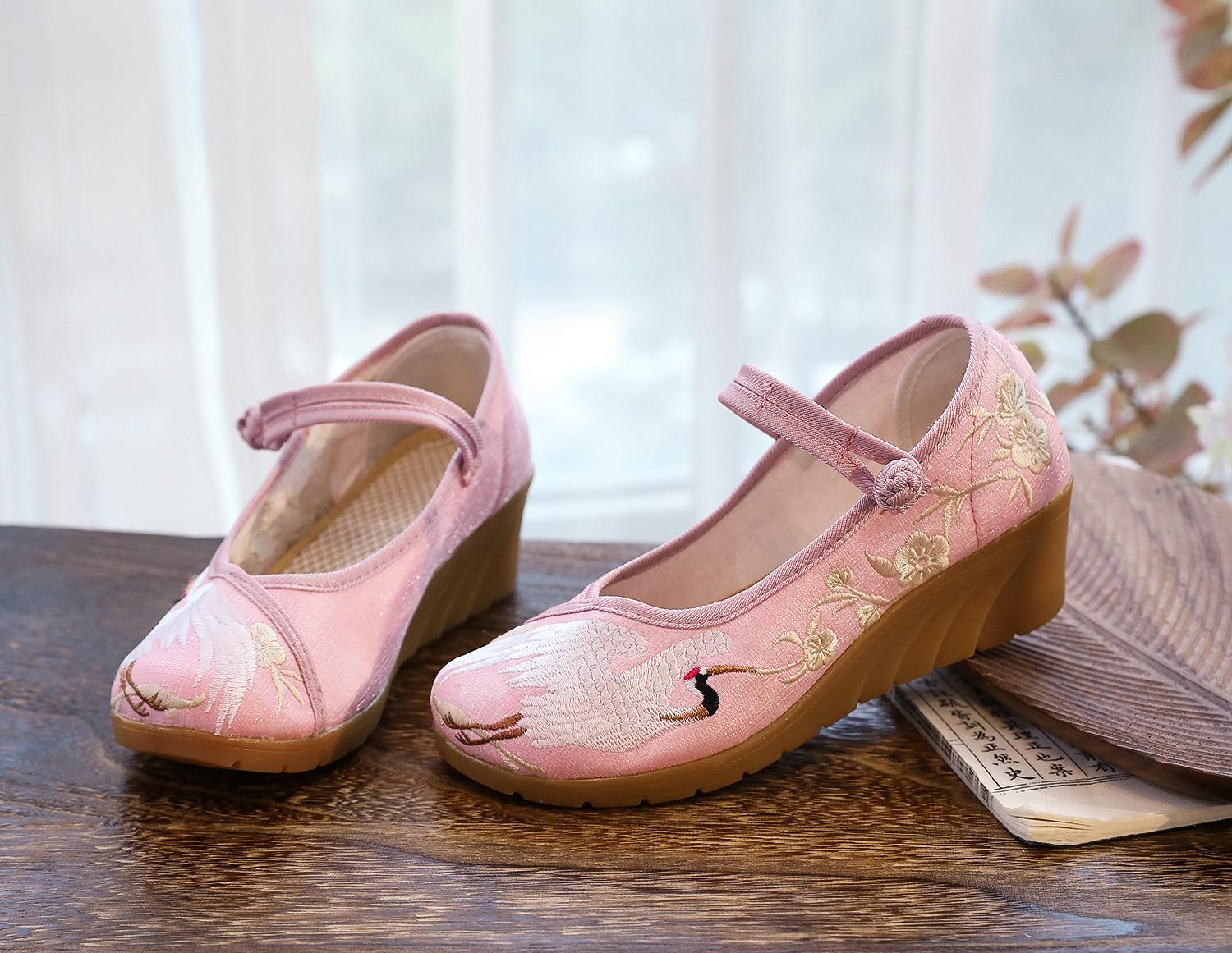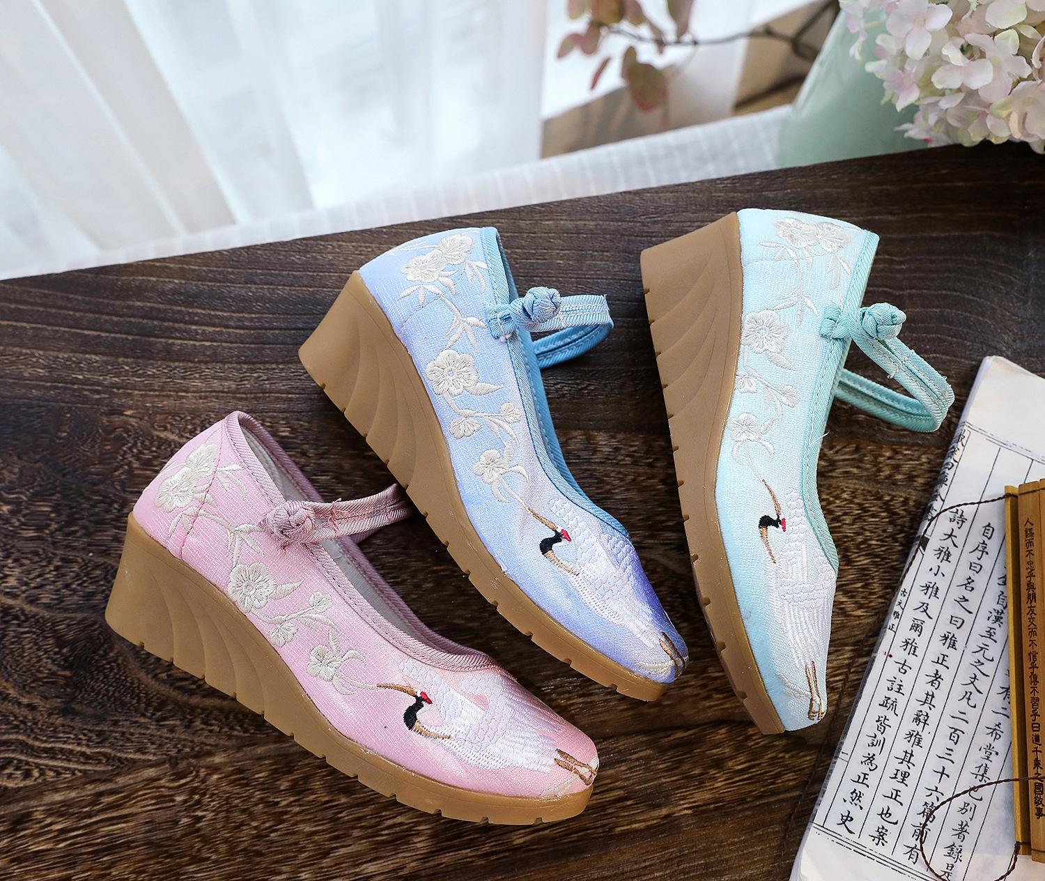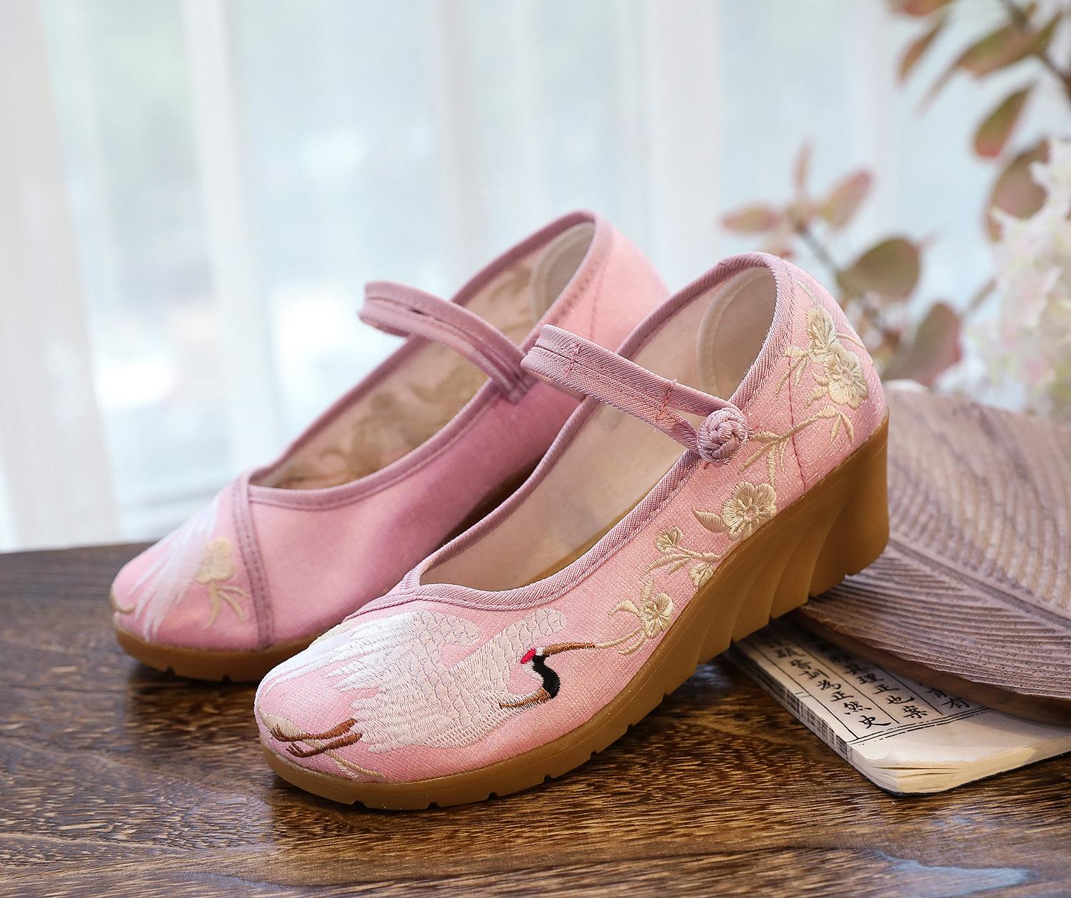 Sapatos de salto alto de camada única Hanfu sapatos guindaste bordado sapatos de pano estilo nacional traje antigo tendão inferior cunha sapatos femininos