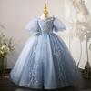 Vestido infantil azul com manga bolha e fio bufante para meninas, vestido de princesa, modelo de passarela, fantasia para apresentação de piano, atacado