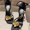 French Niche Design Sense Golden Rose Sapatos de salto agulha femininos de verão com bico quadrado e sandálias abertas
