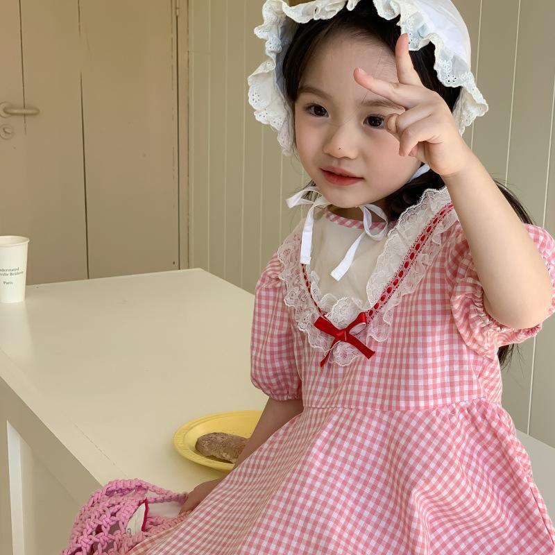 Vestido de Verão para Meninas 2025 Novo Estilo Coreano Estilo Ocidental Saia Infantil Doce Renda Xadrez Vestido de Princesa