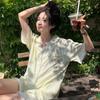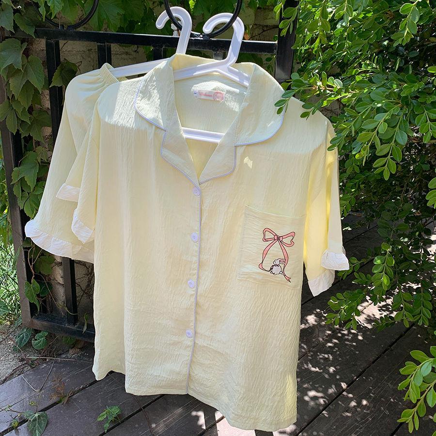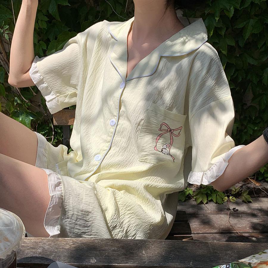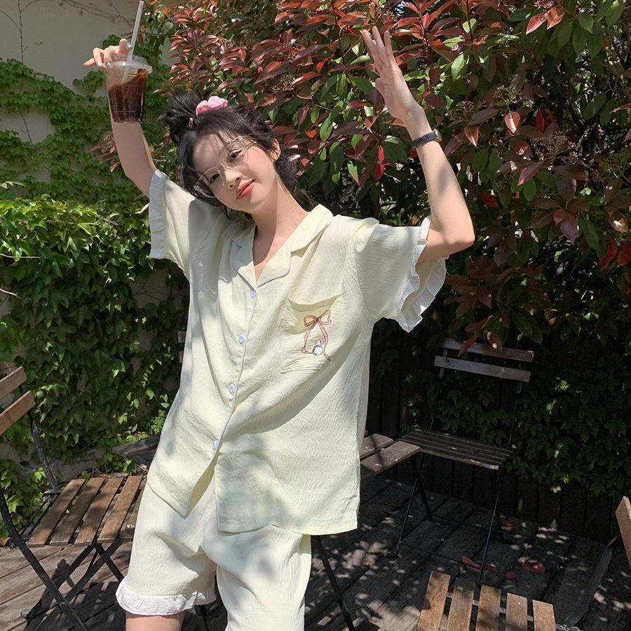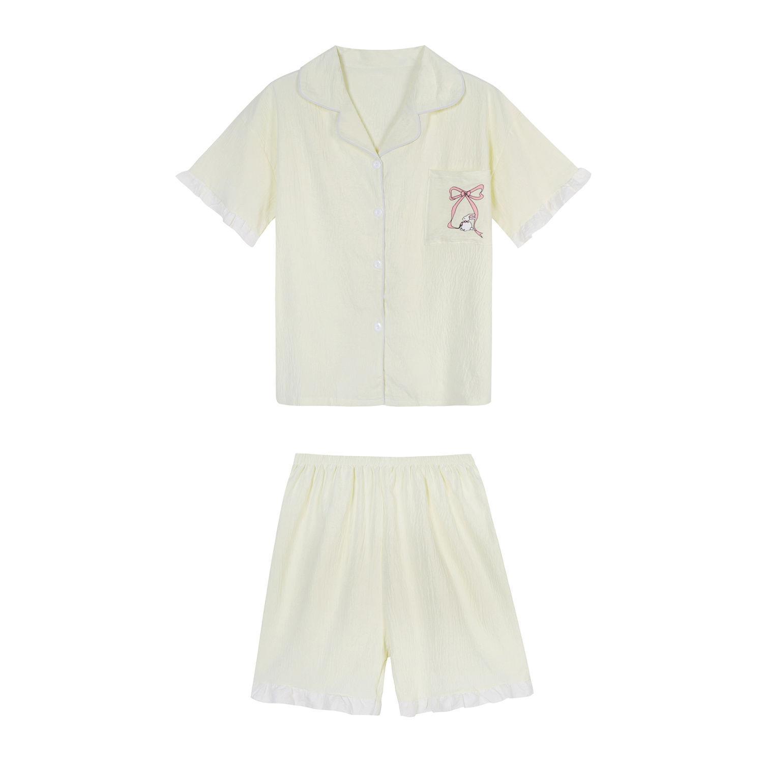 2024 Nova Chegada Pijama Plissado Coelho Feminino Verão Doce Bonito Renda Manga Curta Terno Confortável Exterior Roupas de Casa