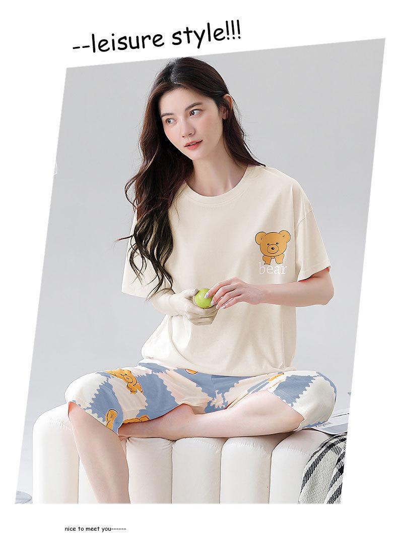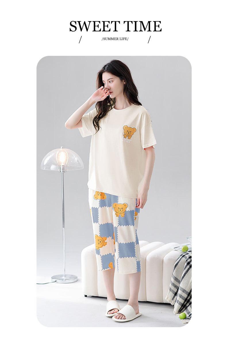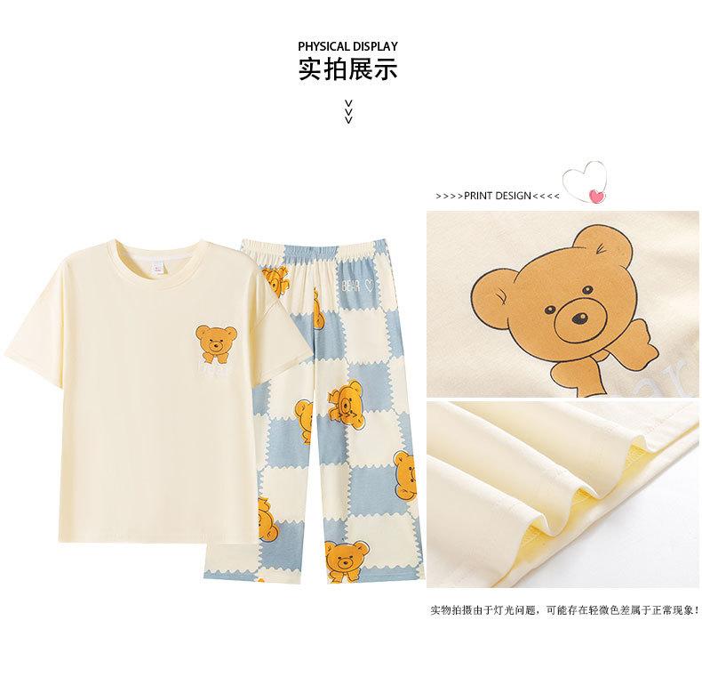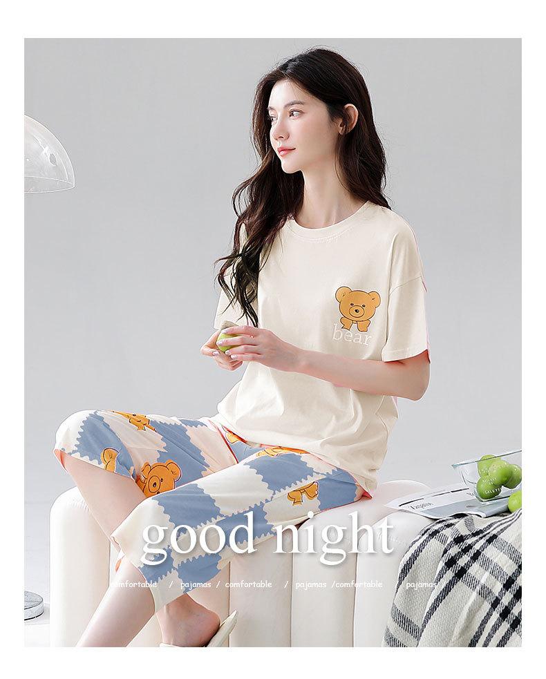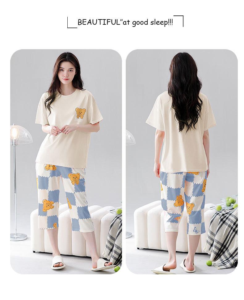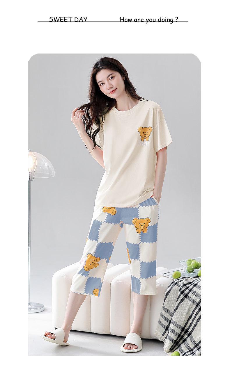 Pijamas de algodão das mulheres verão manga curta calça cropped terno de duas peças cartoon casual fino solto ao ar livre home wear