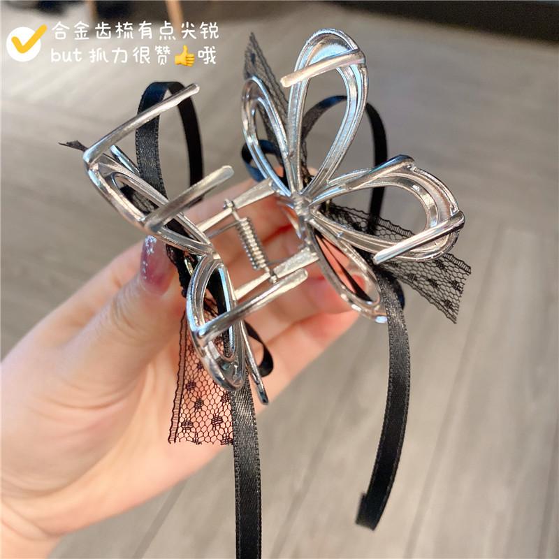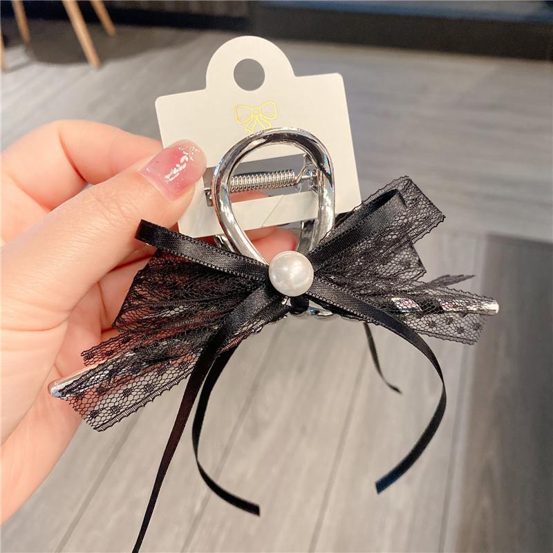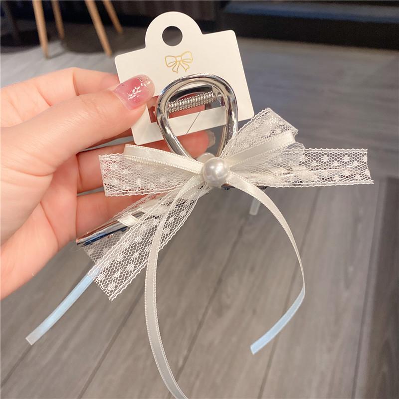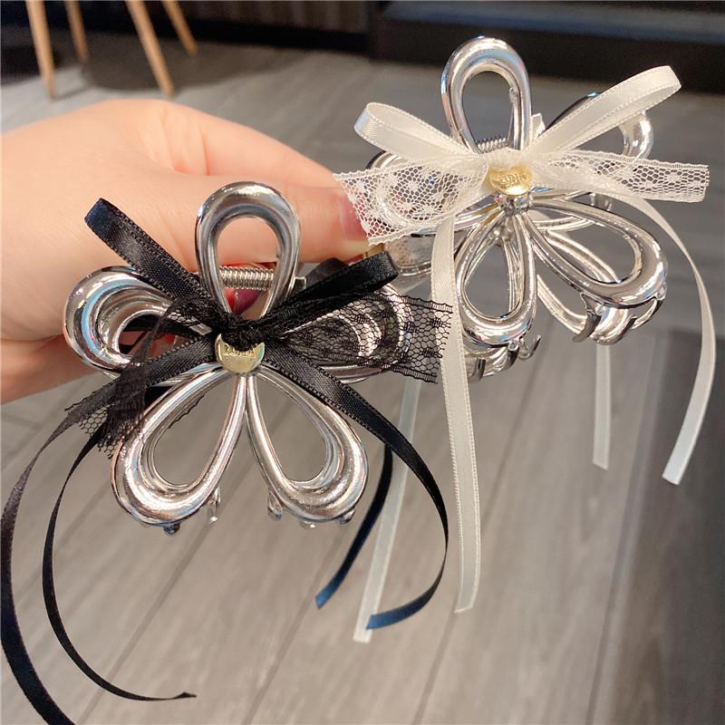 Fairy Style Lace Hair Clip High-end Bow Ribbon Headwear Mulheres Novo High-end prata Horsetail High-grip Clip para o verão