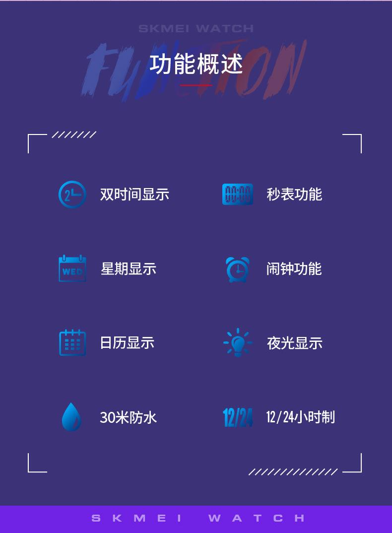 2 Time, stopwatch timing, EL luminous display date, alarm clock, Display Week, hour, 12/24 hour system.
