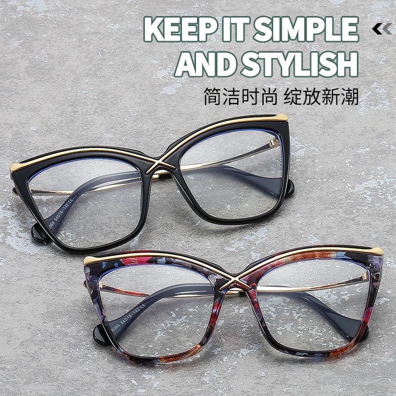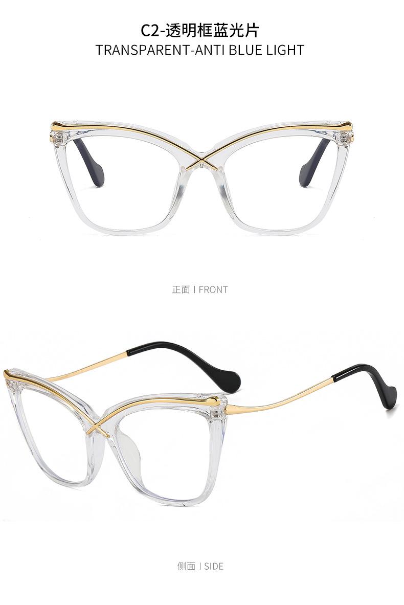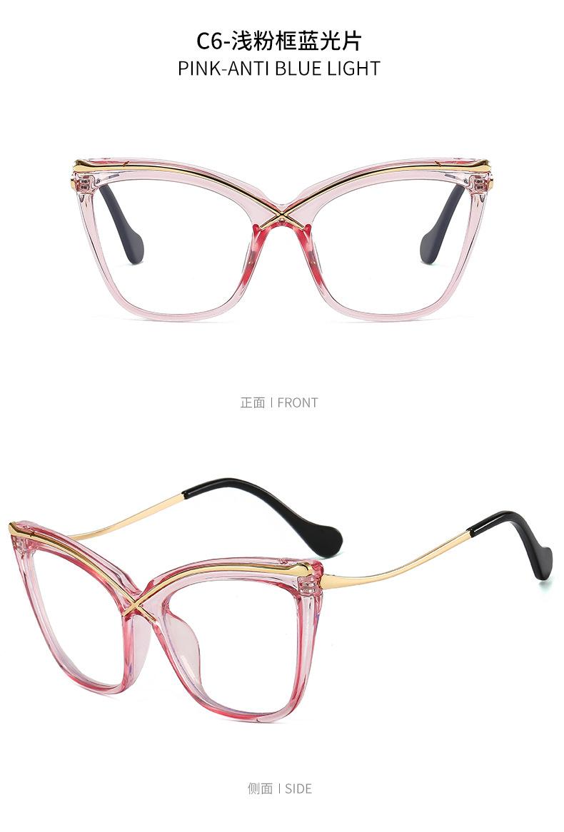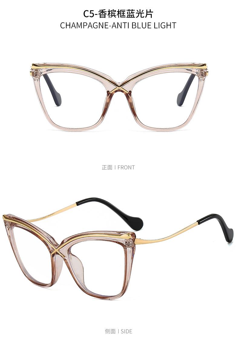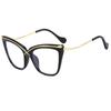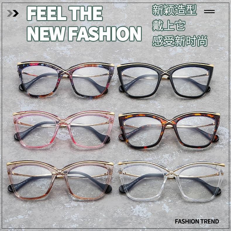 Novo espelho plano de armação grande Cat's Eye metal cruz PC anti-azul óculos de moda combinando espelho óptico europeu e americano