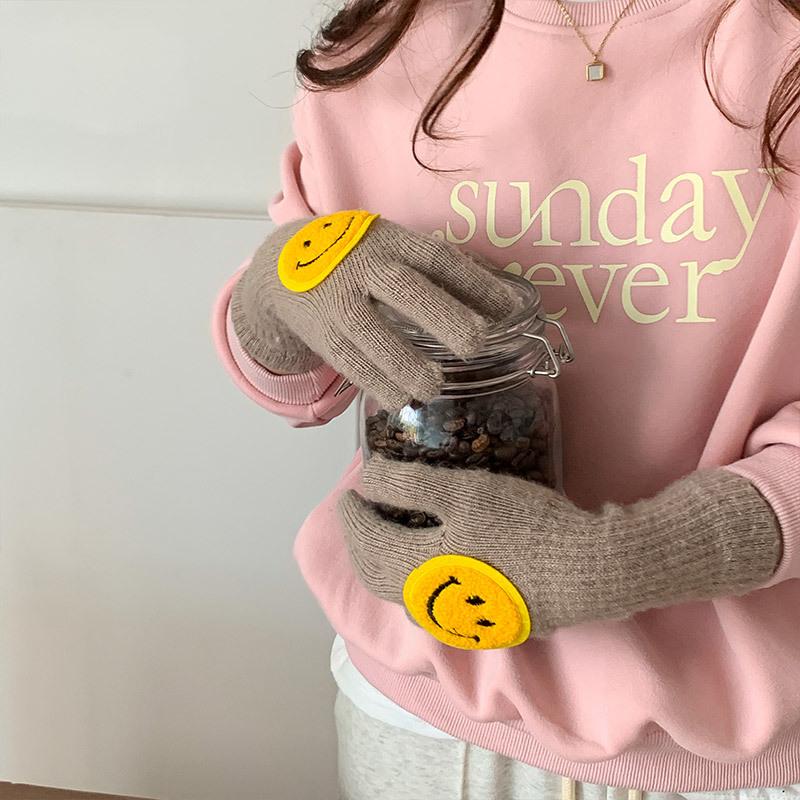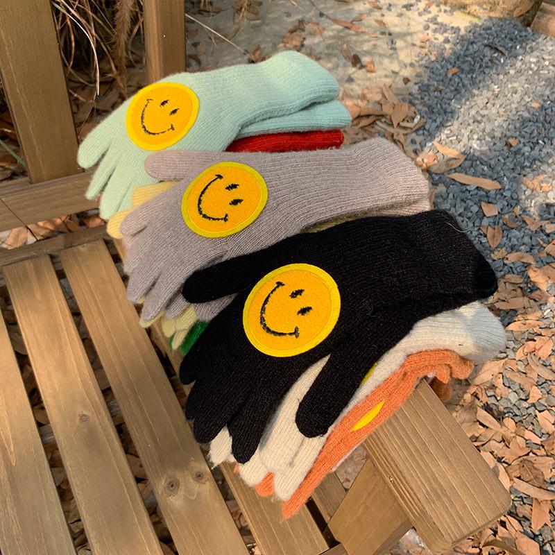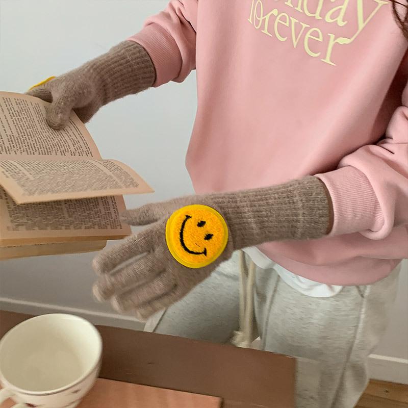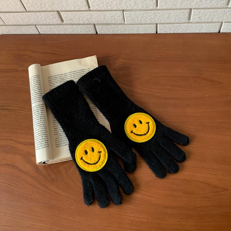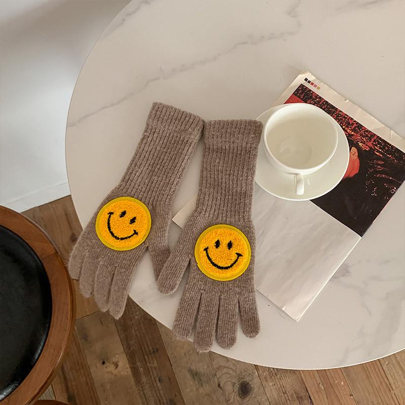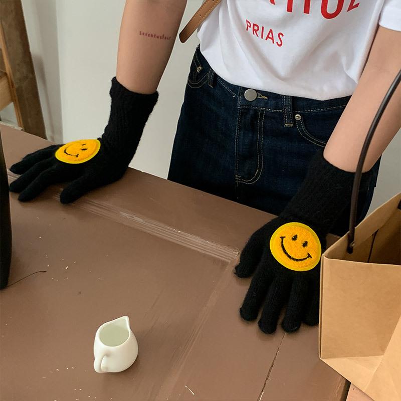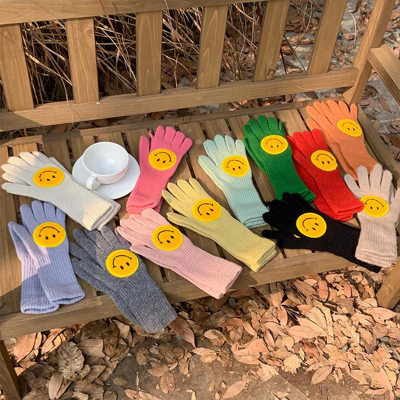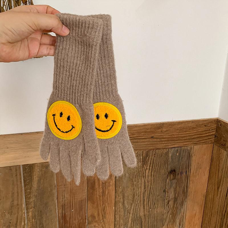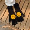 Estilo coreano rosto sorridente bonito rotulagem de lã luvas de malha outono e inverno das mulheres engrossado quente proteção de pulso dedo luvas longas