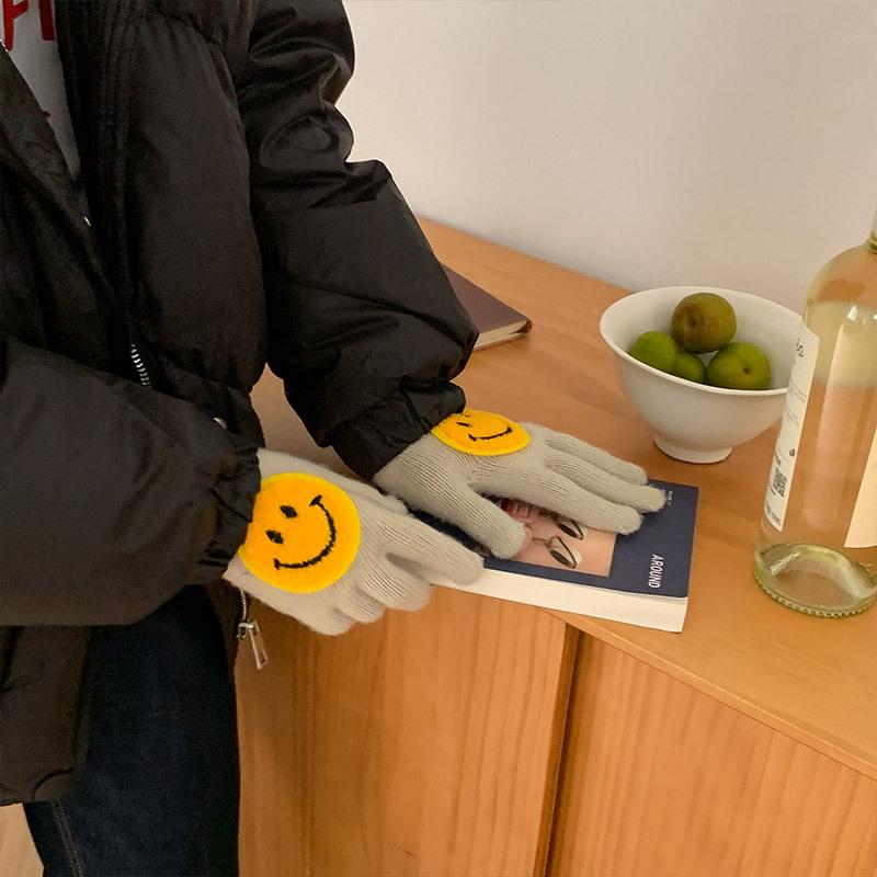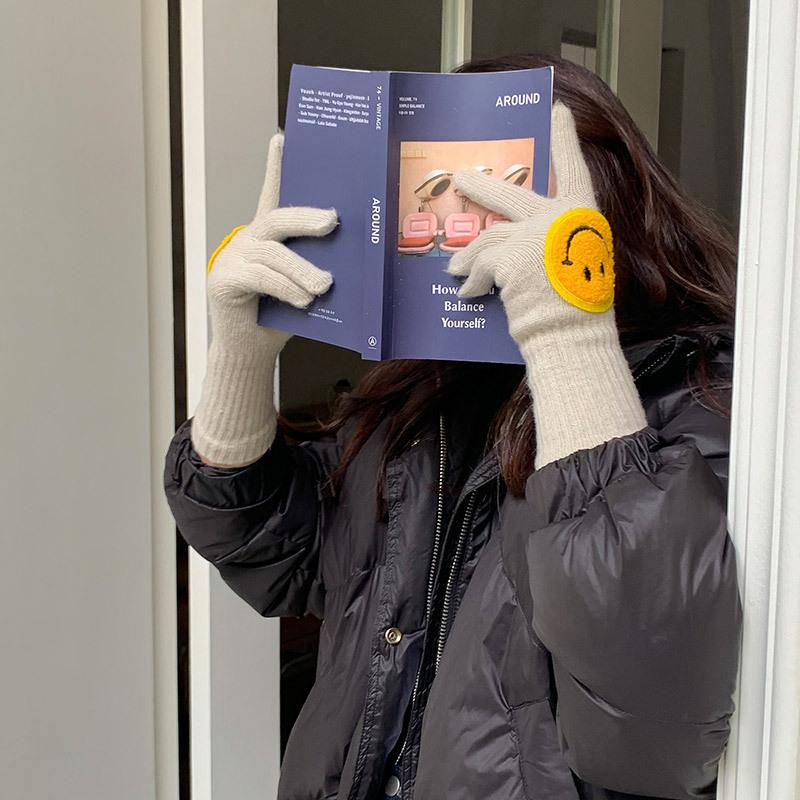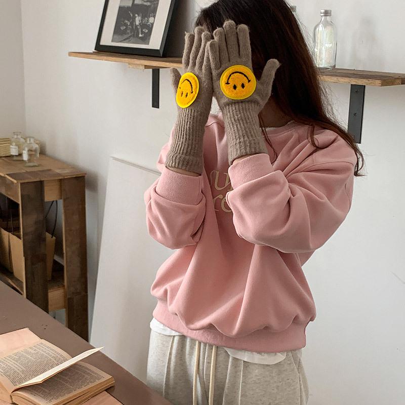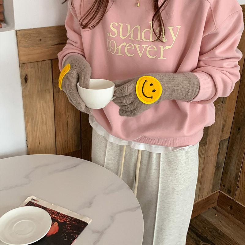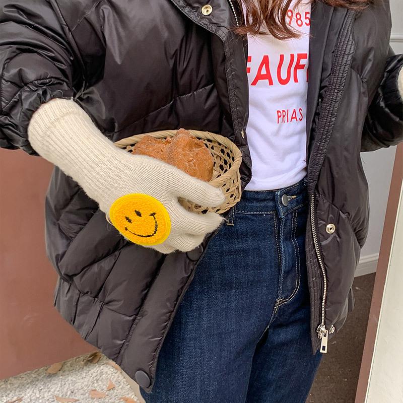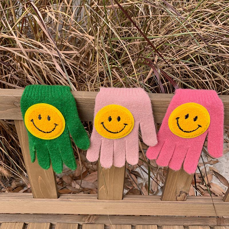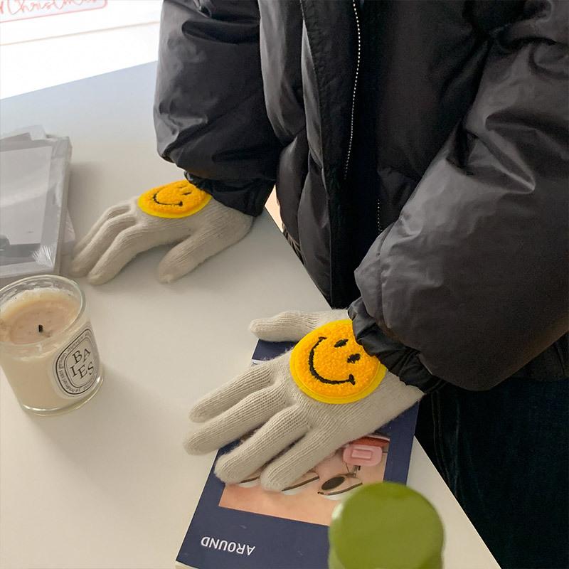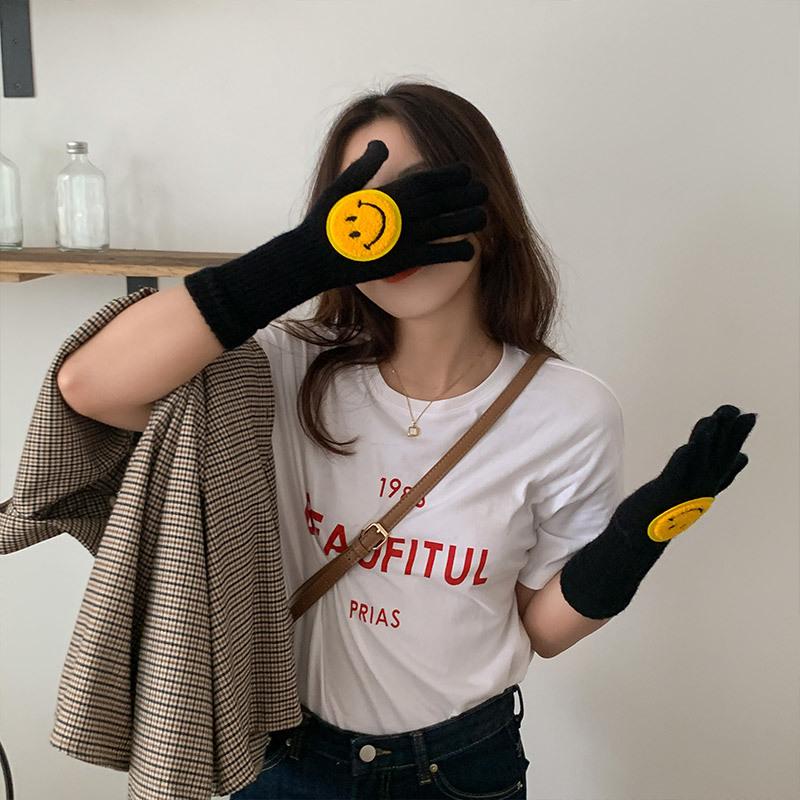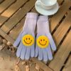 Estilo coreano rosto sorridente bonito rotulagem de lã luvas de malha outono e inverno das mulheres engrossado quente proteção de pulso dedo luvas longas
