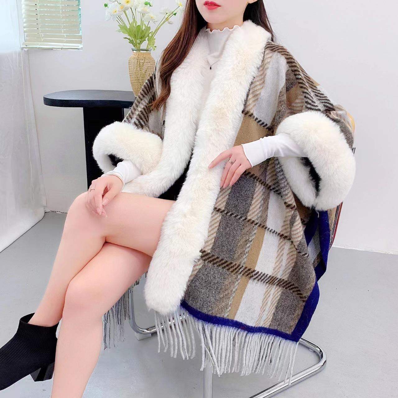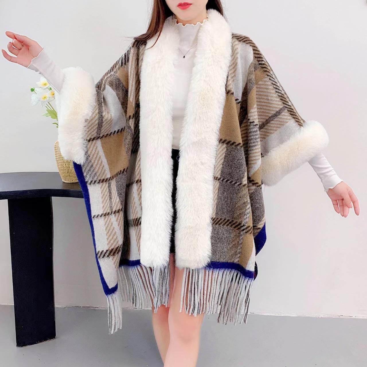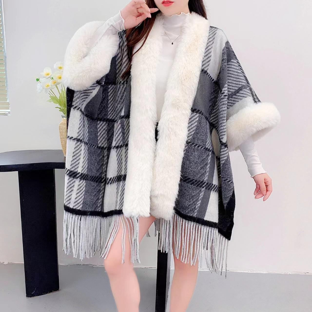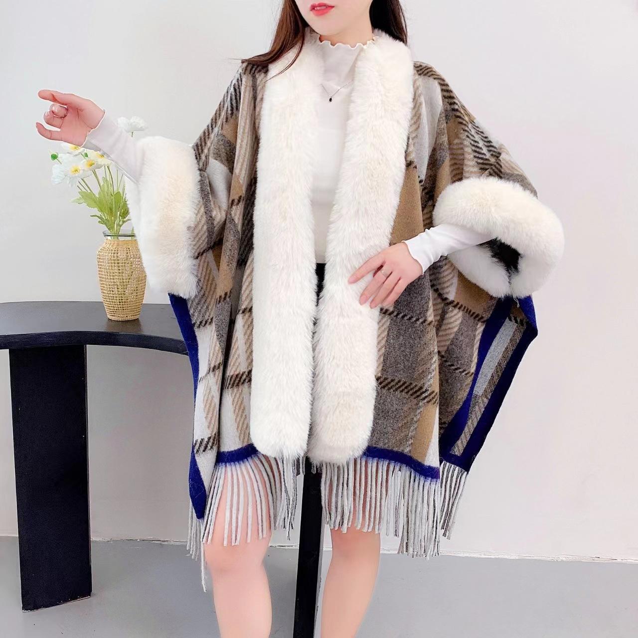 Novo casaco de malha xale feminino com gola de pele grande e espessado, quente e de alta qualidade, capa xadrez para outono e inverno
