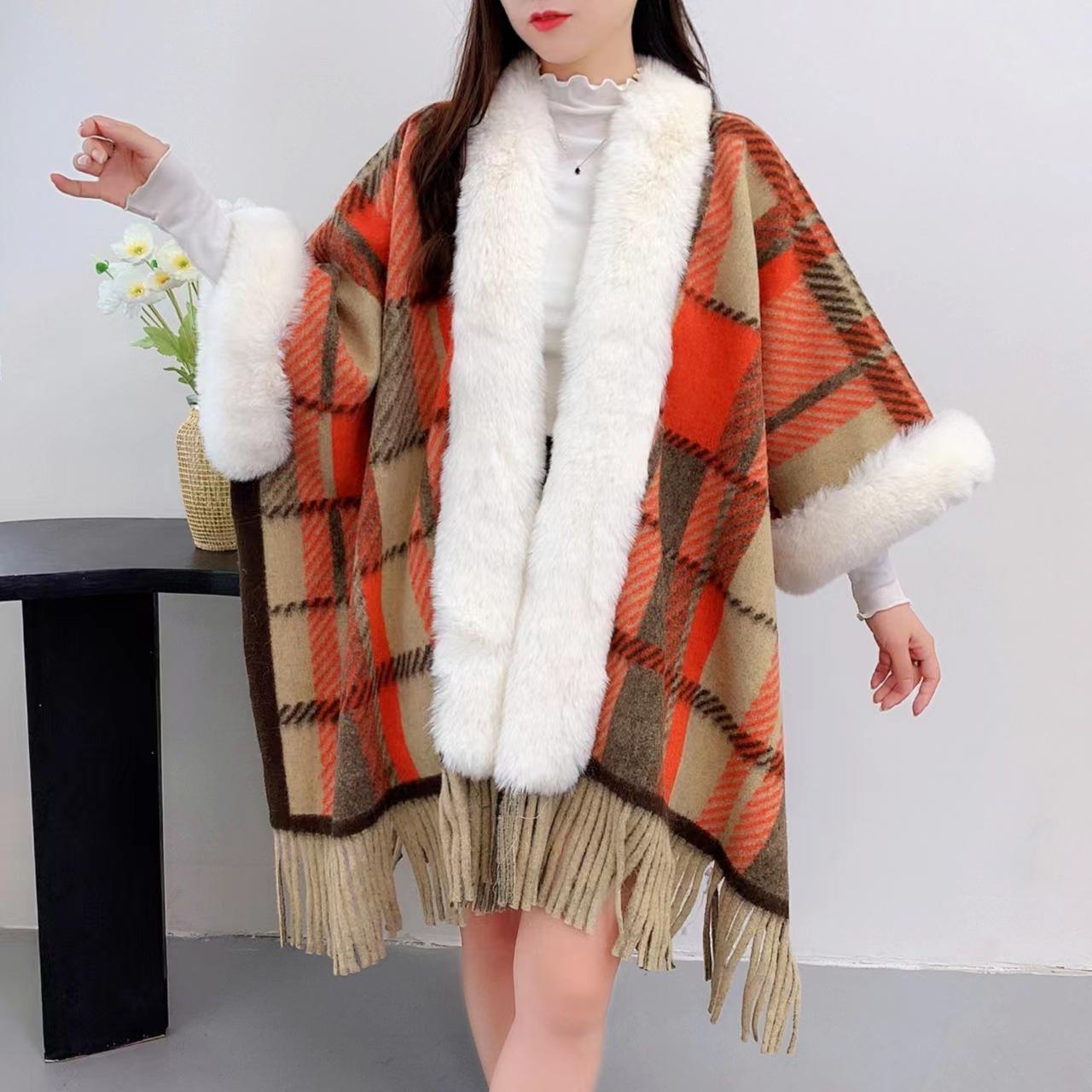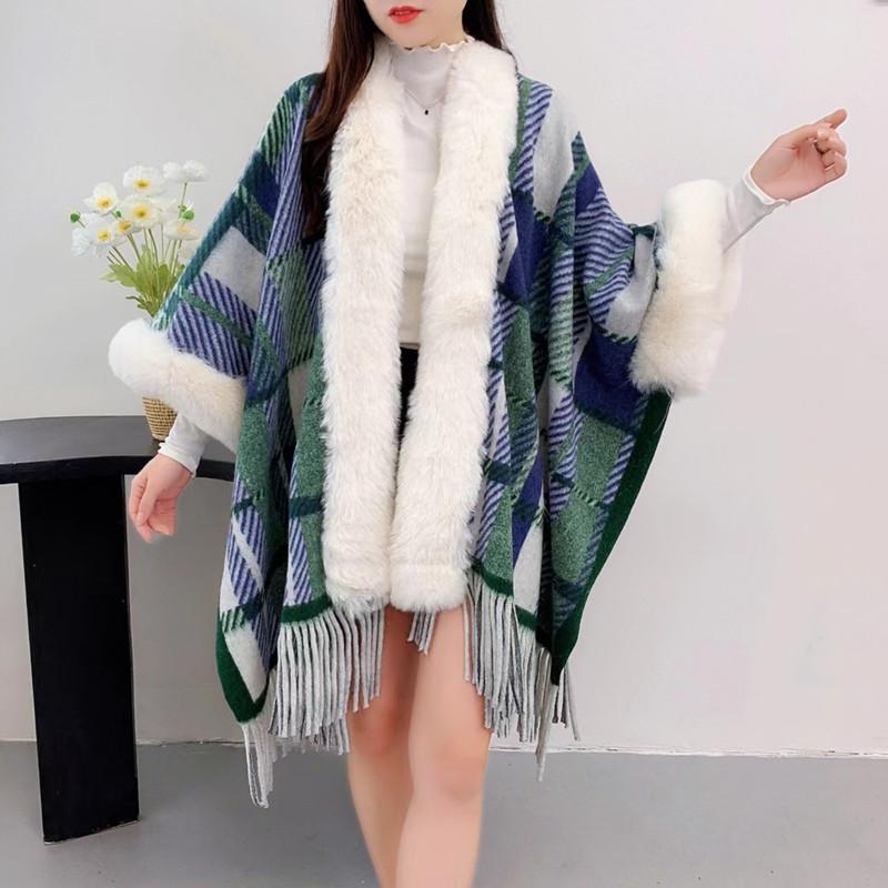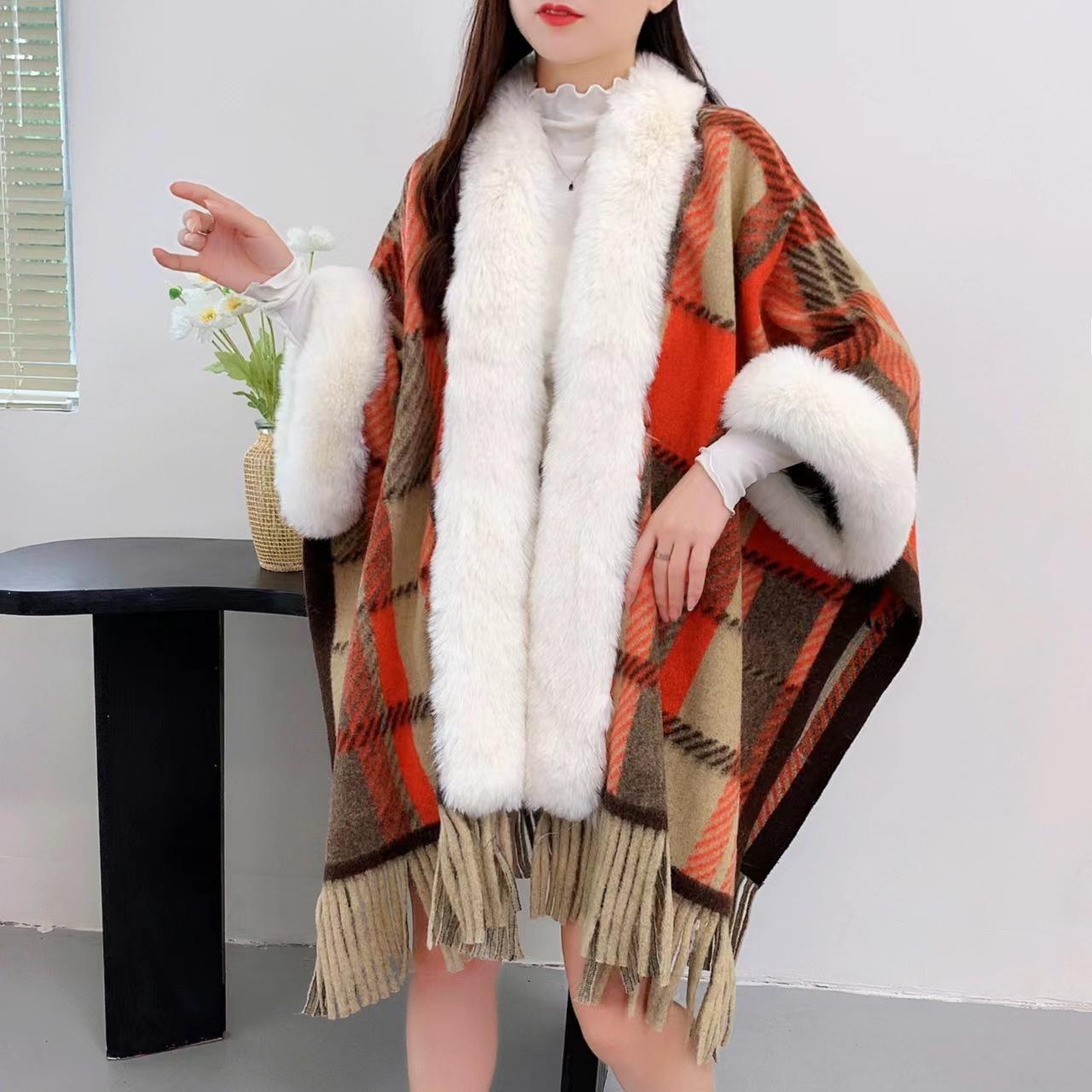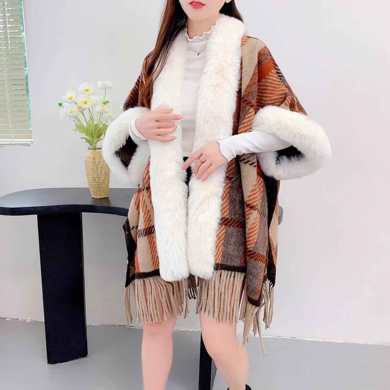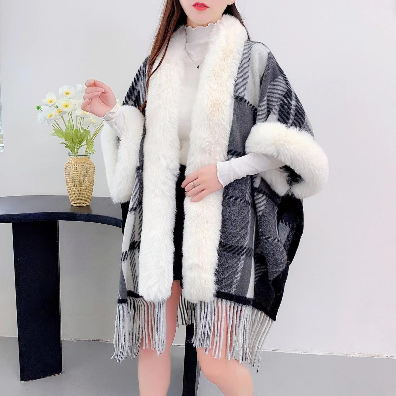 Novo casaco de malha xale feminino com gola de pele grande e espessado, quente e de alta qualidade, capa xadrez para outono e inverno