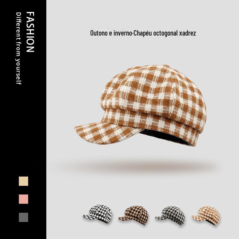 2023 outono e inverno chapéu feminino chapéu octogonal pintor rosto grande estilo coreano britânico boina soft top aba curta Xadrez boné pontiagudo