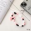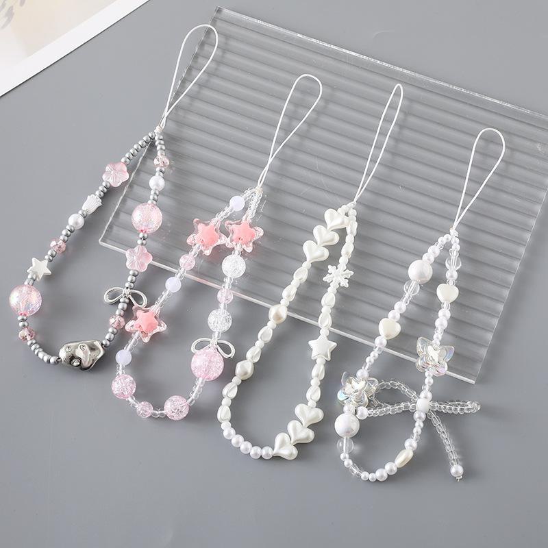 Novo estilo criativo de corrente de telefone móvel com laço de pérolas e coração, pingente misto de contas feito à mão, moderno e versátil, cordão para telefone móvel