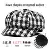 Chapéus de Outono e Inverno para Mulheres Moda Coreana Chapéu Príncipe de Gales Marinho Bordado Letra Rb Boné Quente com Aba Xadrez Chapéu Octogonal