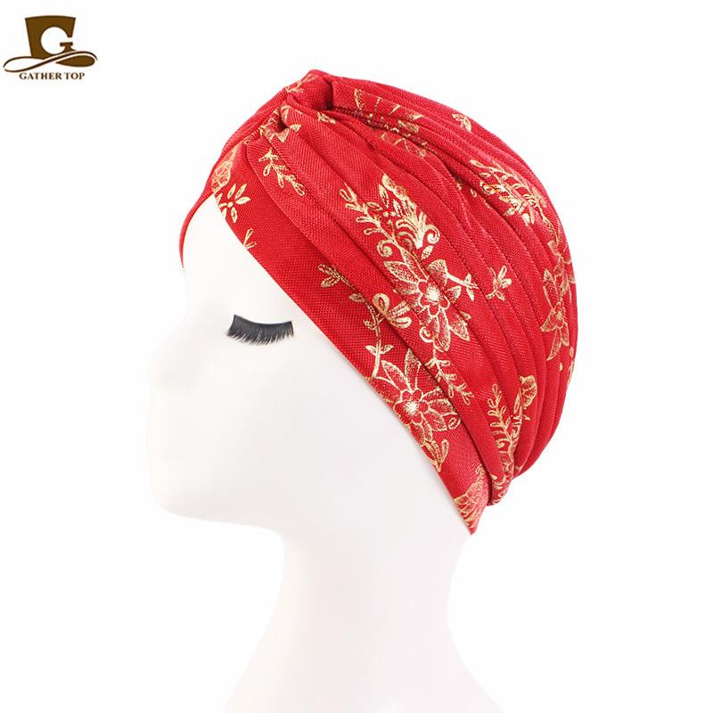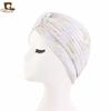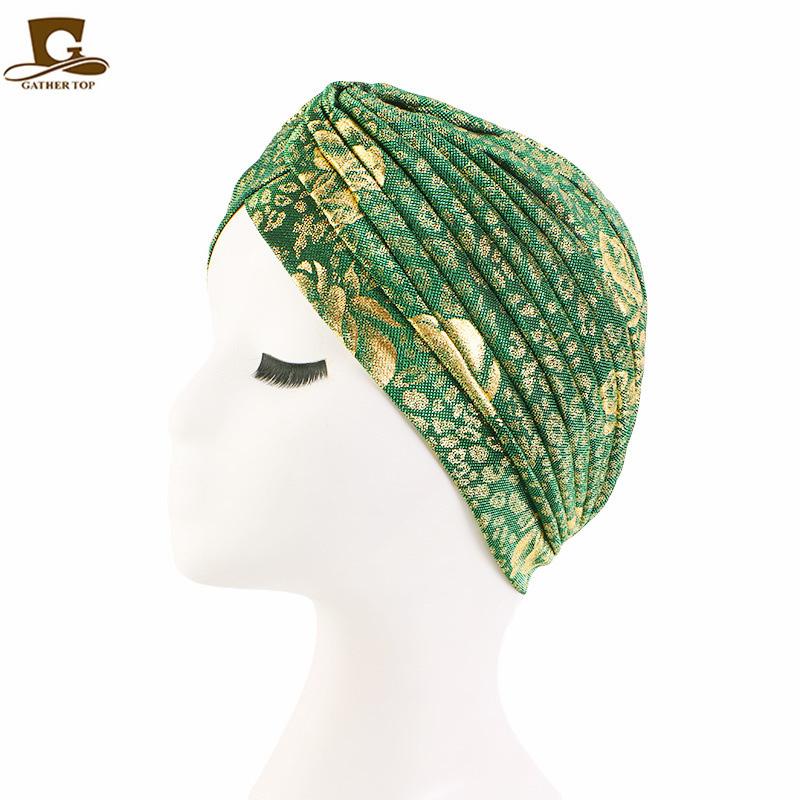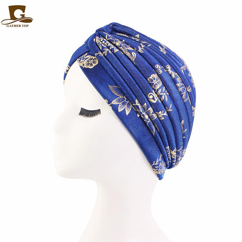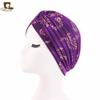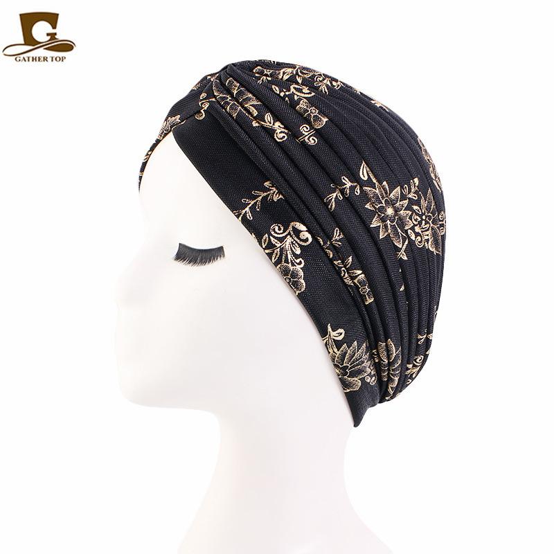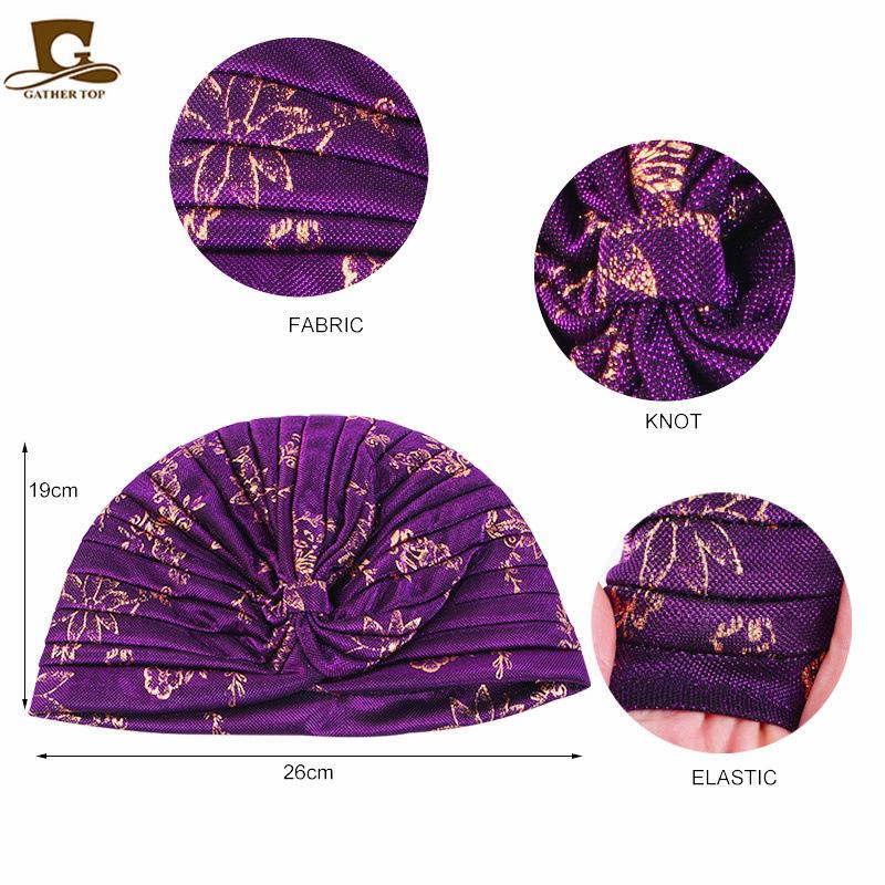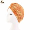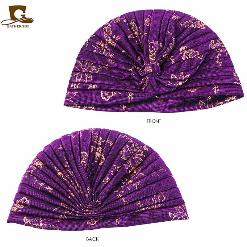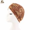Chapéu turbante de seda brilhante enrugada com estampa dourada estilo africano chapéu indiano chapéu étnico muçulmanoJDT-478