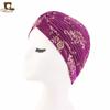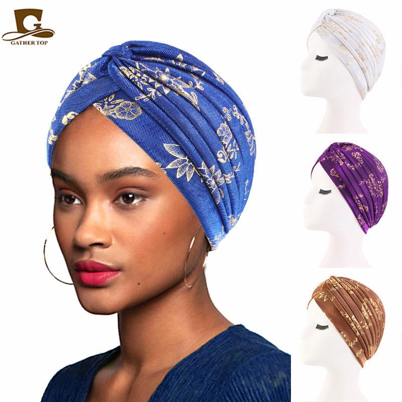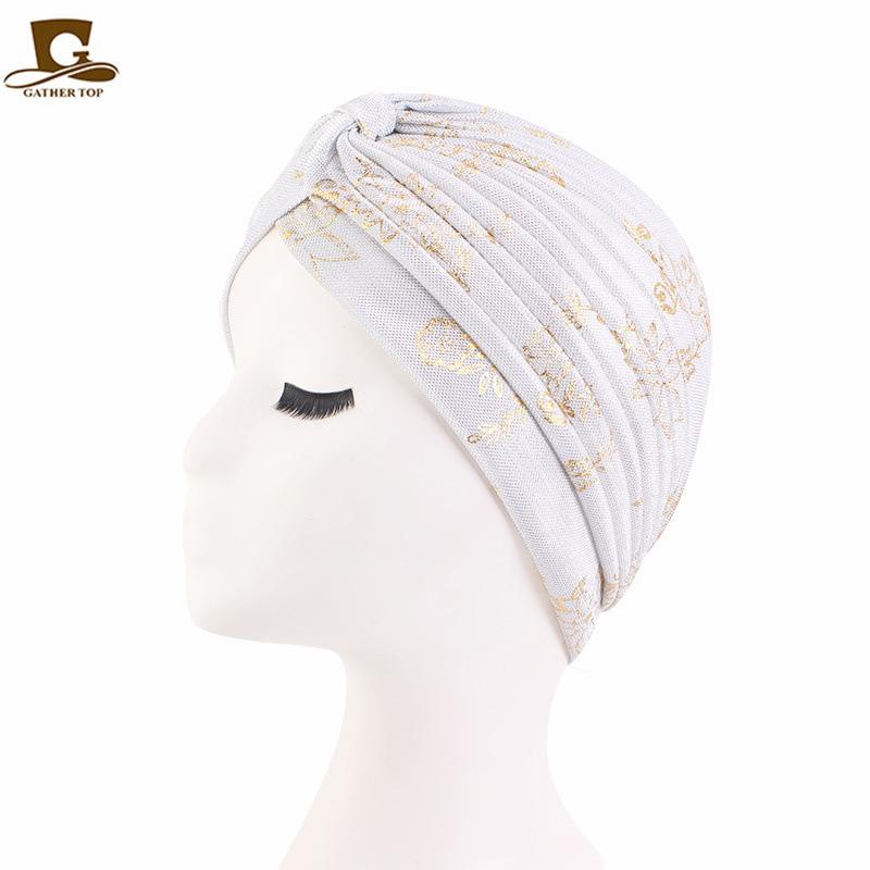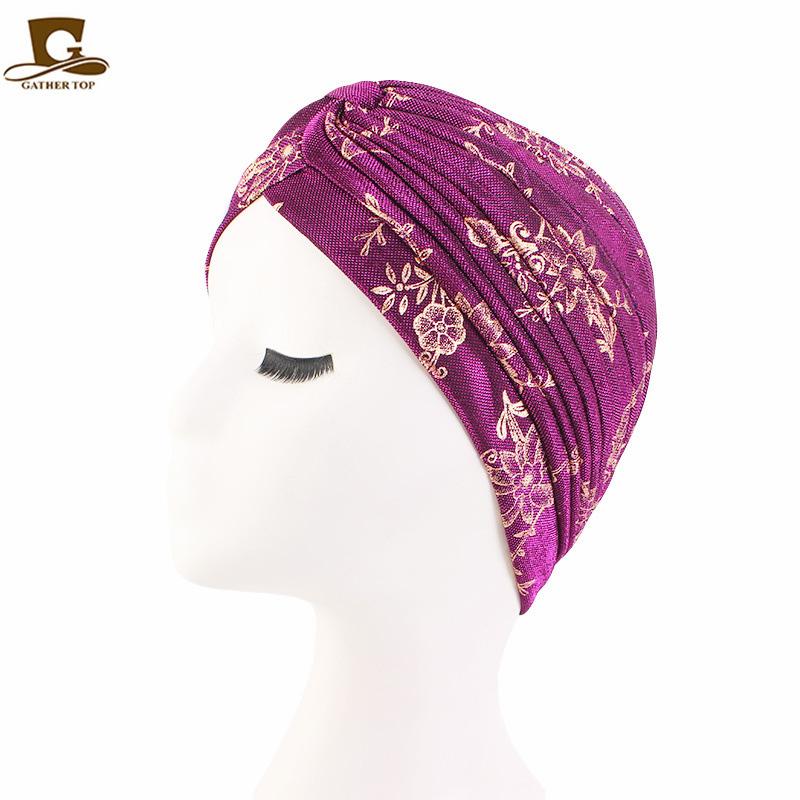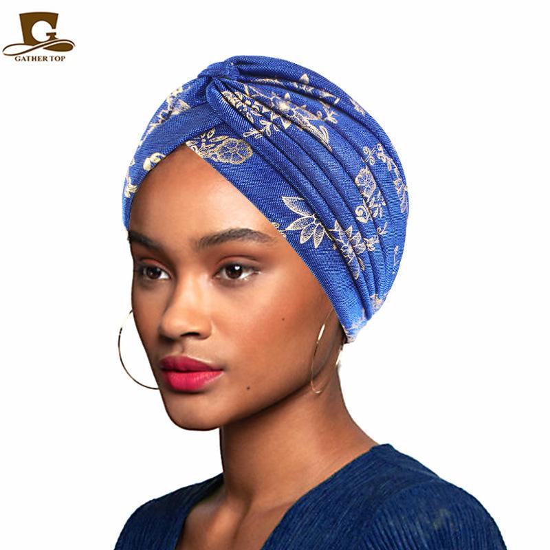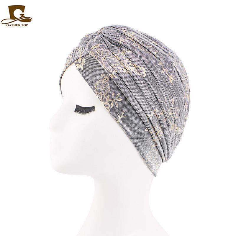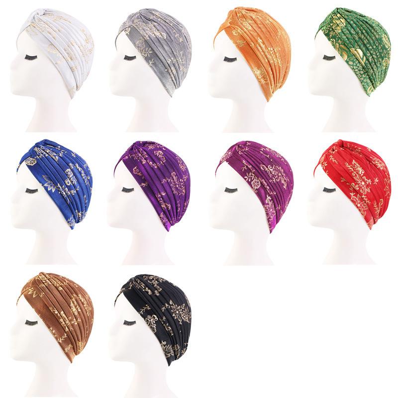 Chapéu turbante de seda brilhante enrugada com estampa dourada estilo africano chapéu indiano chapéu étnico muçulmanoJDT-478