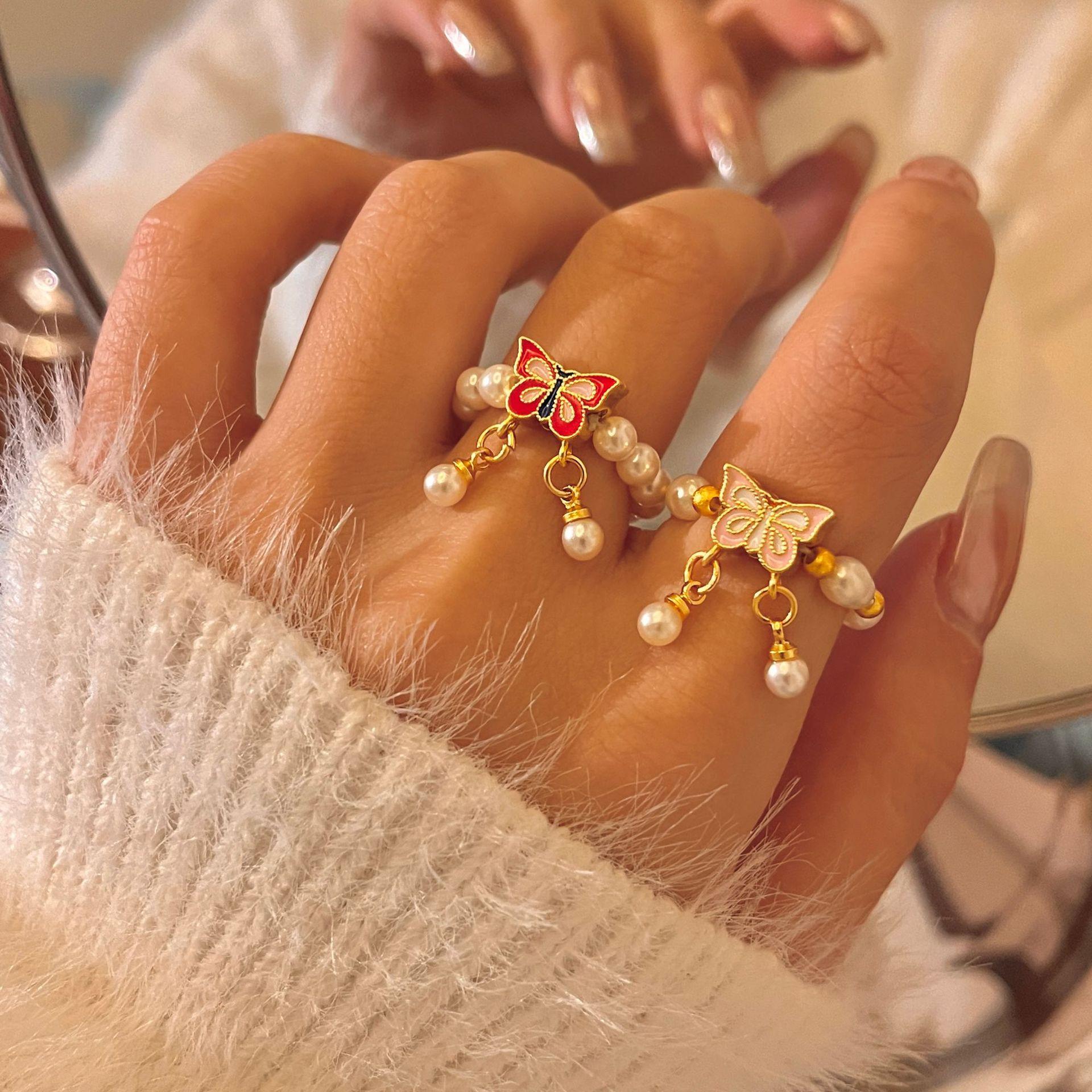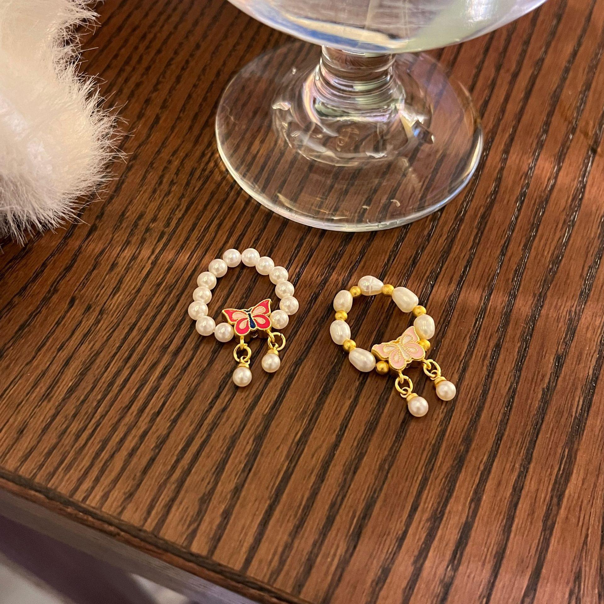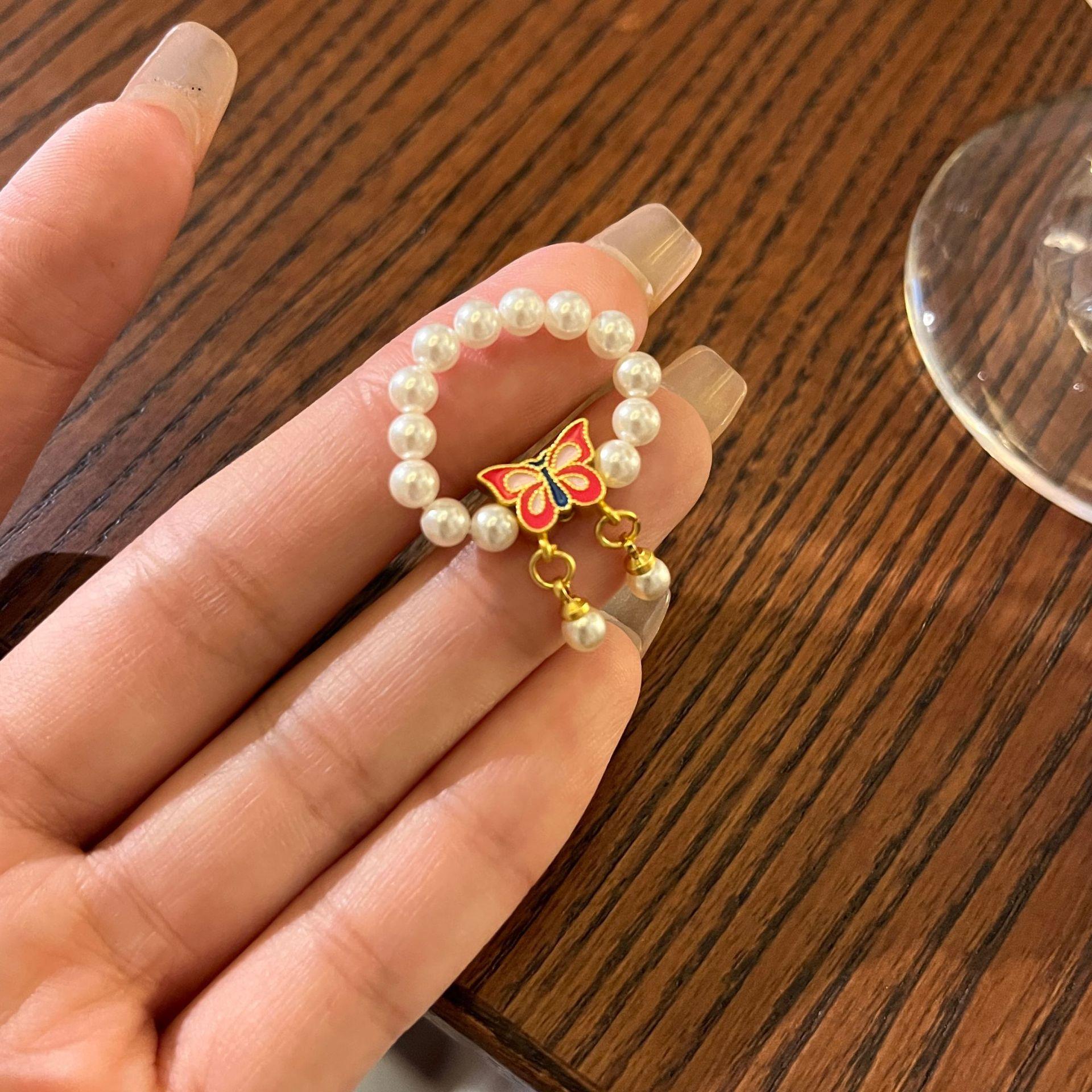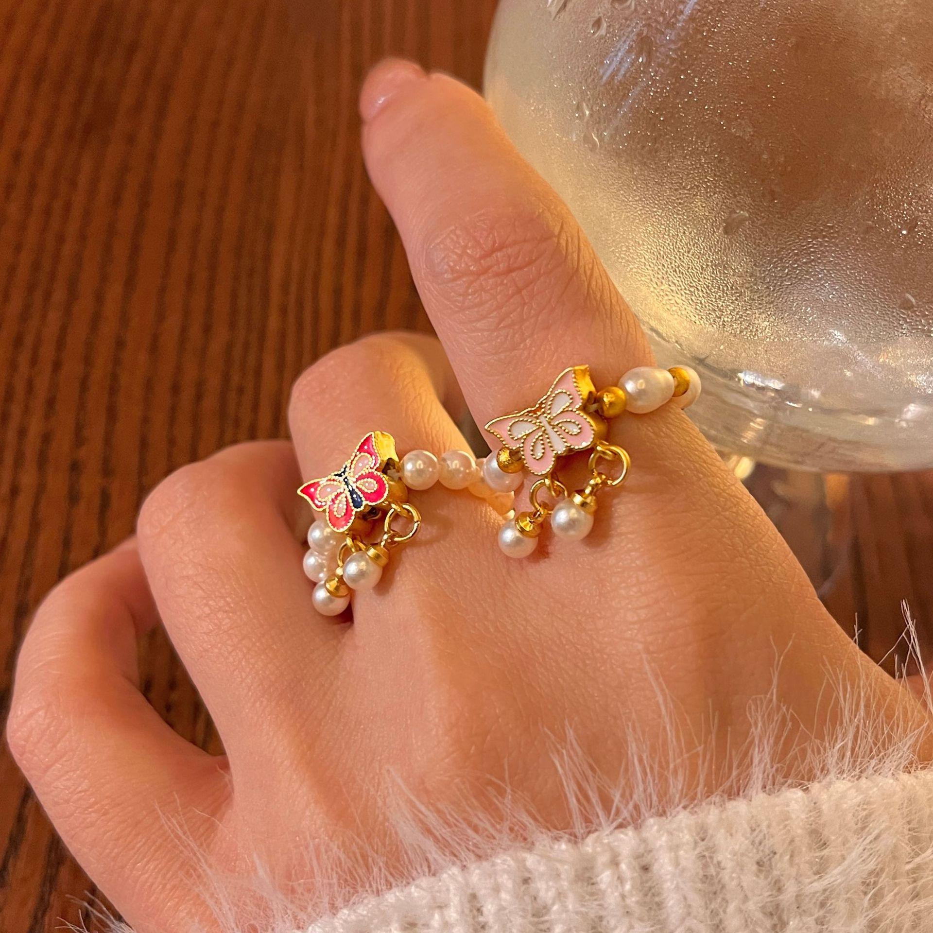 Novo estilo chinês personalizado retro colorido borboleta gota óleo pérola anel elástico empilhado menina doce cool estilo frio