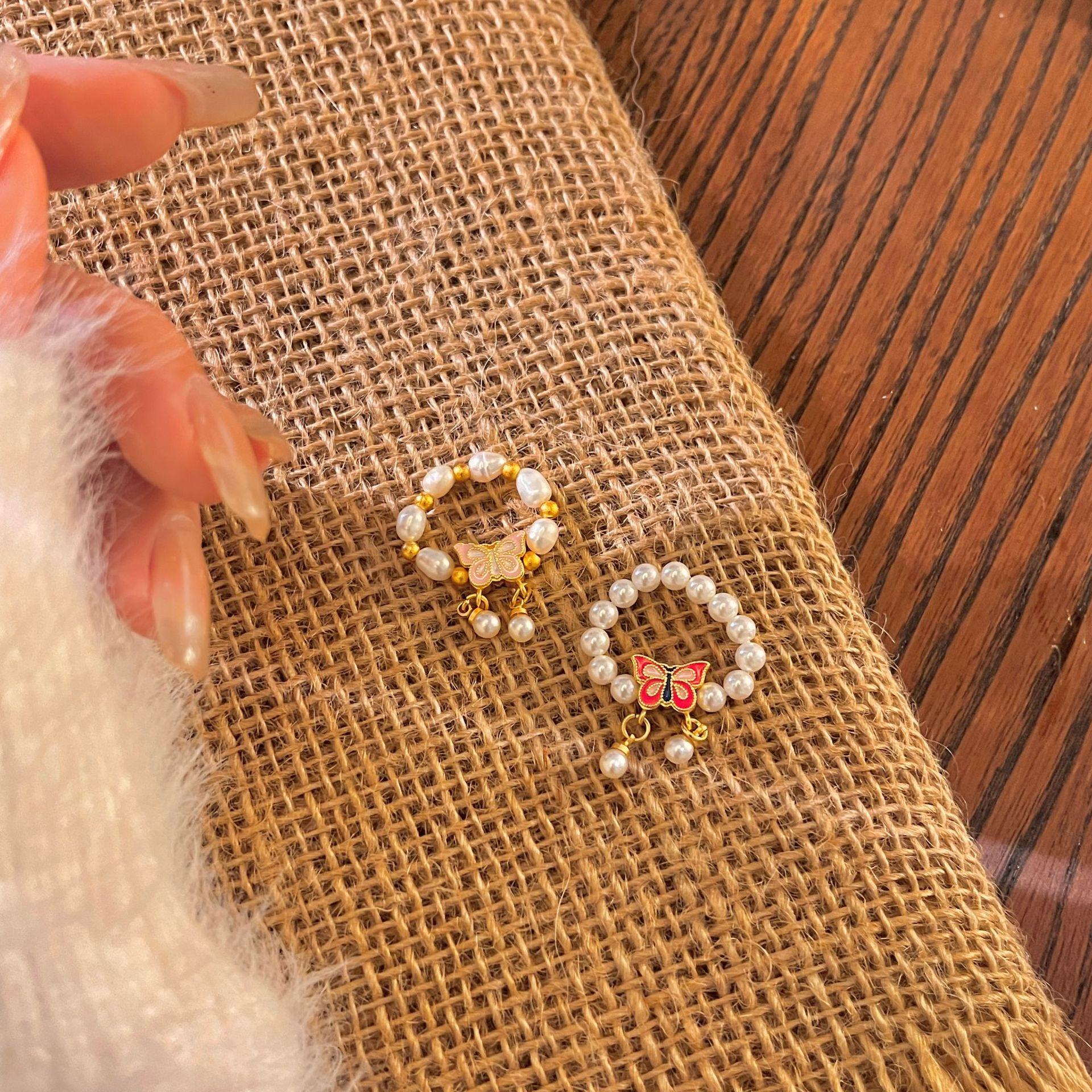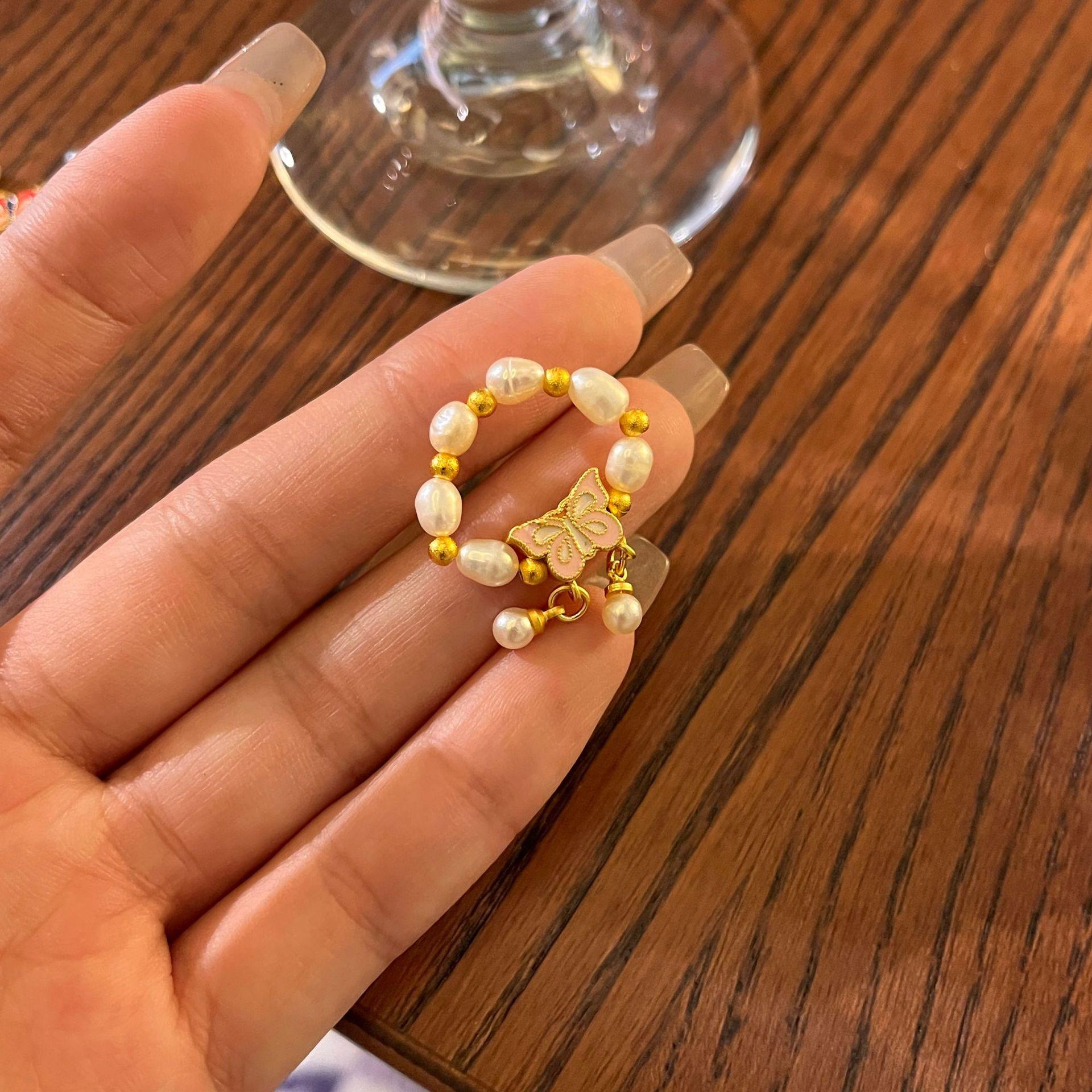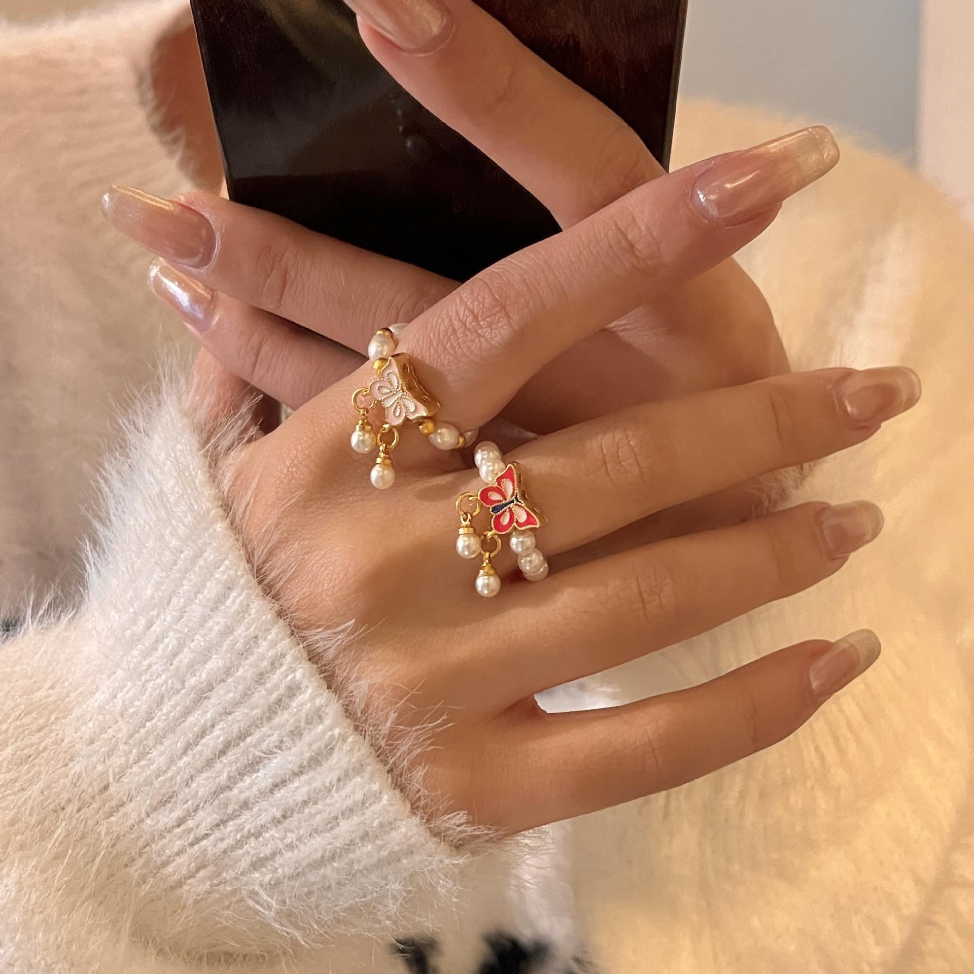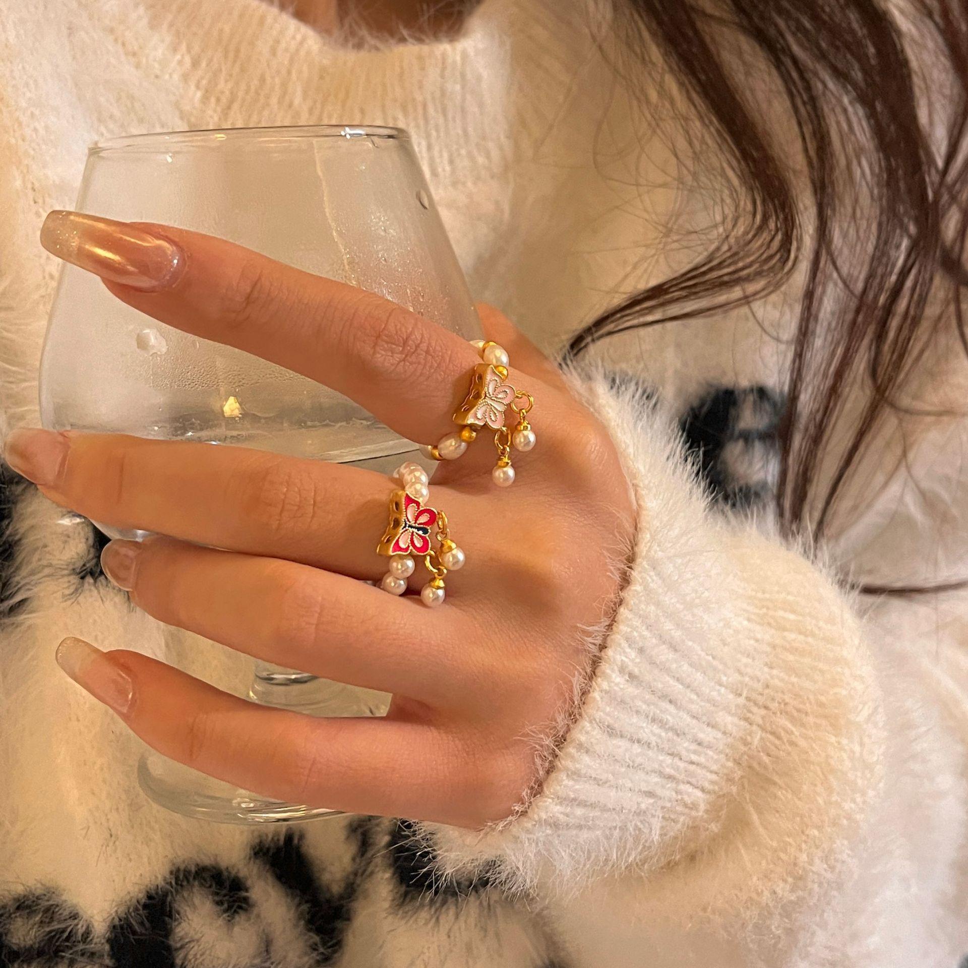 Novo estilo chinês personalizado retro colorido borboleta gota óleo pérola anel elástico empilhado menina doce cool estilo frio