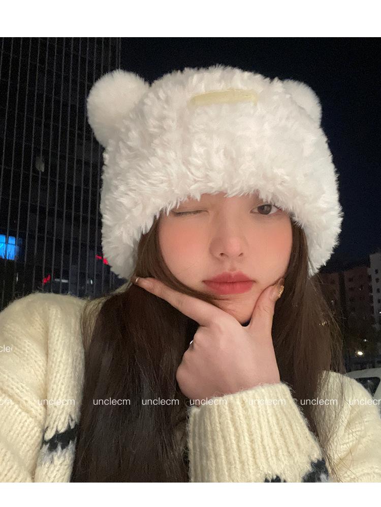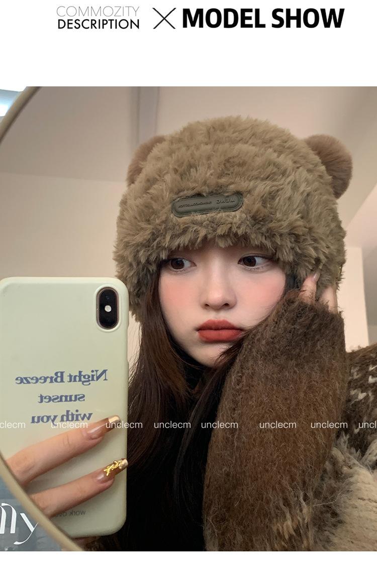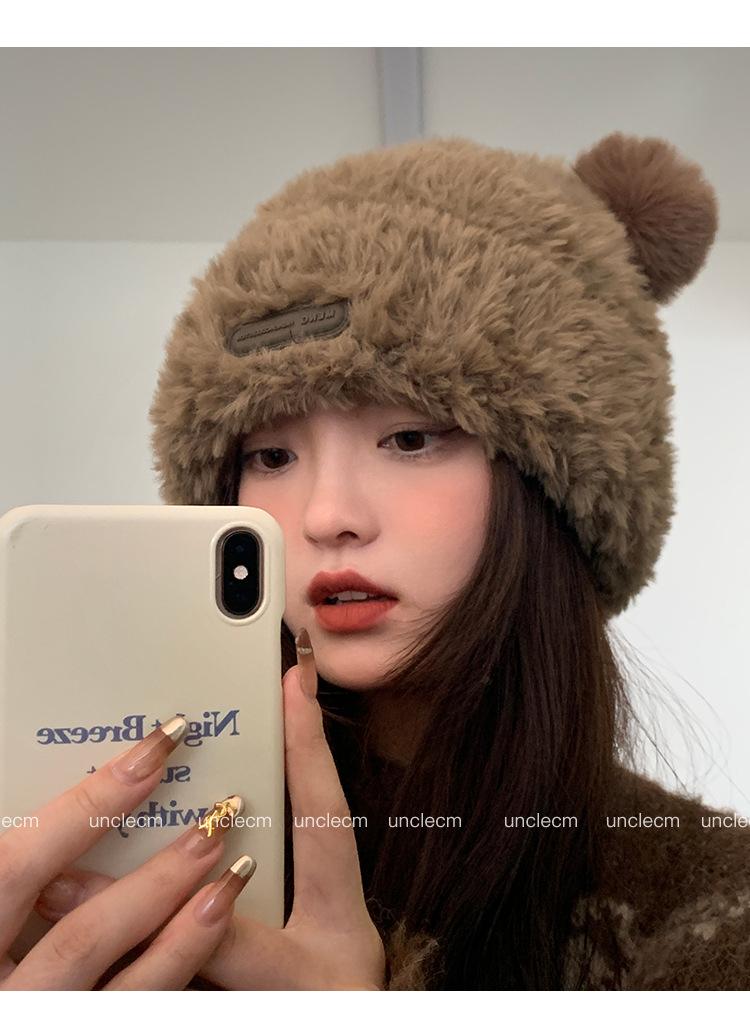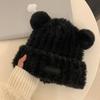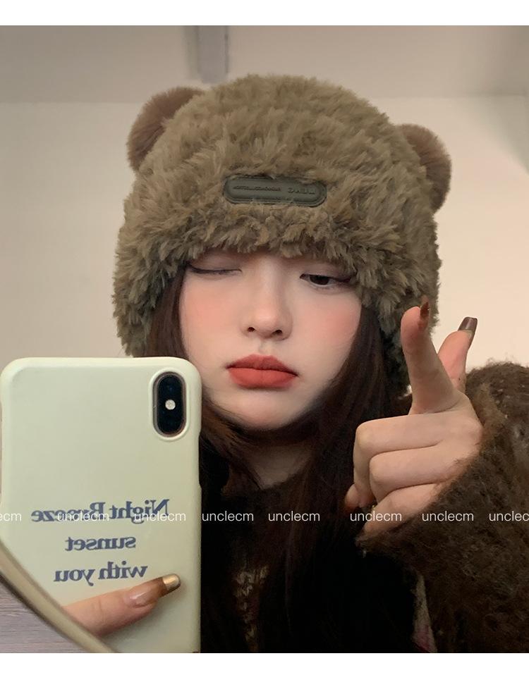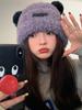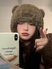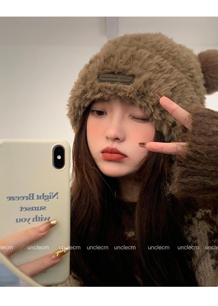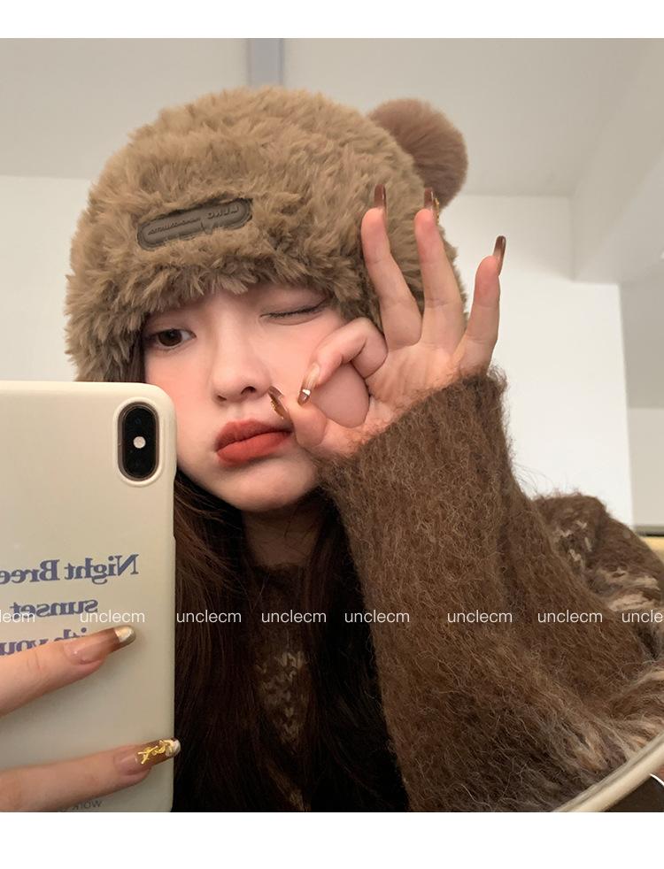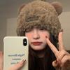 Bonito urso de pelúcia tricotado lã chapéu para mulheres outono e inverno engrossado quente pele sintética pullover earmuffs marrom