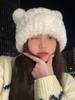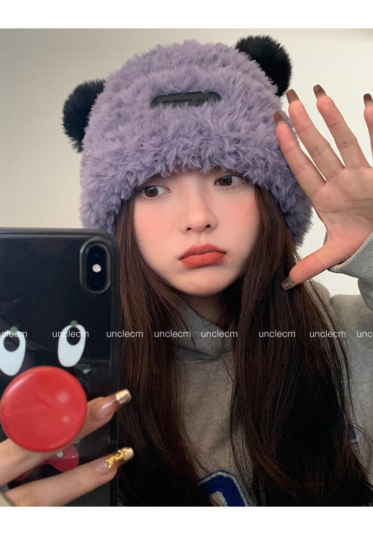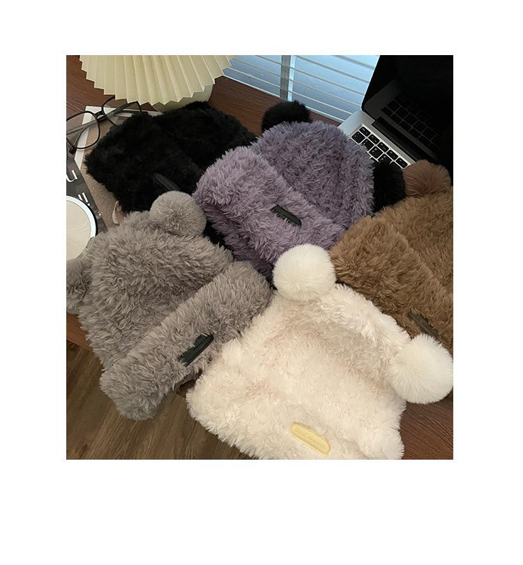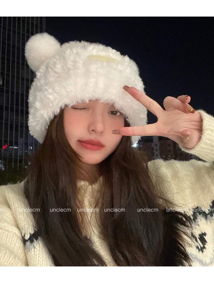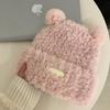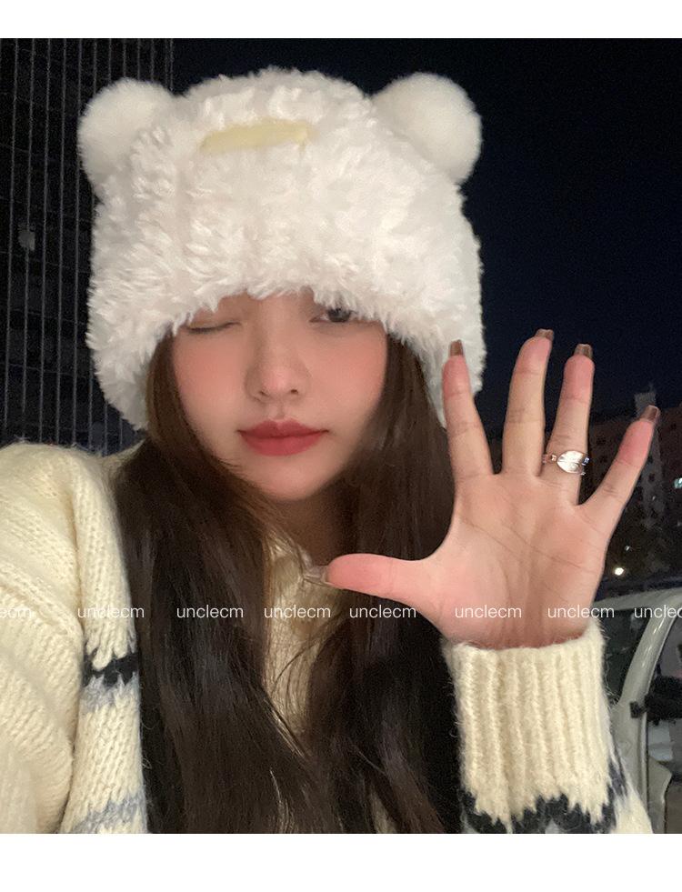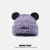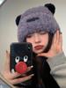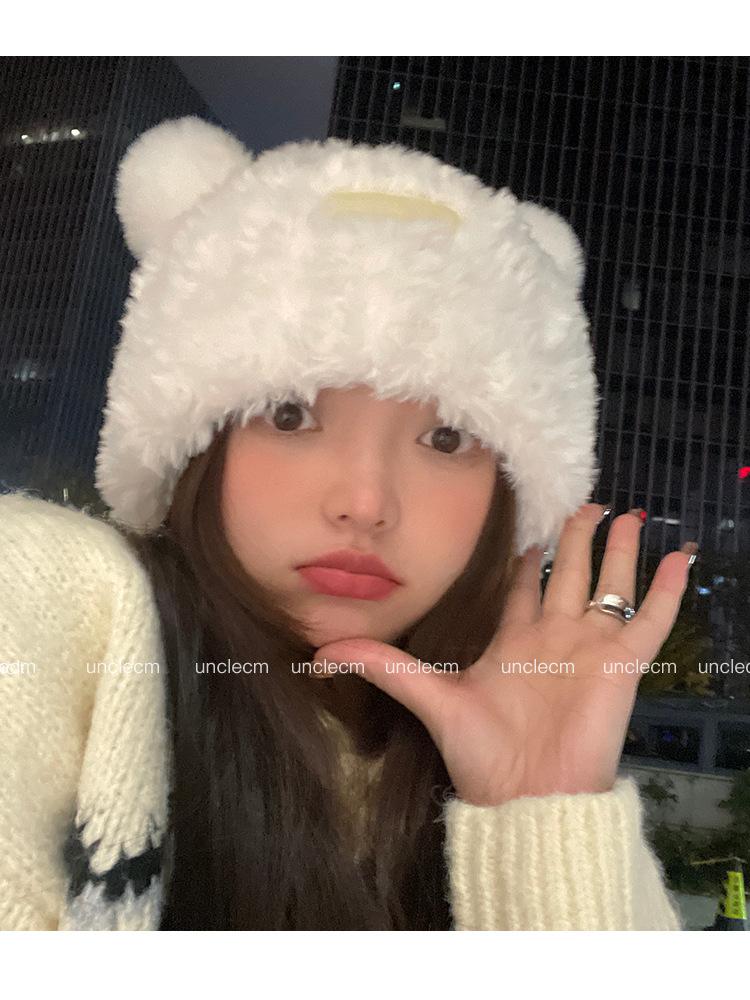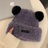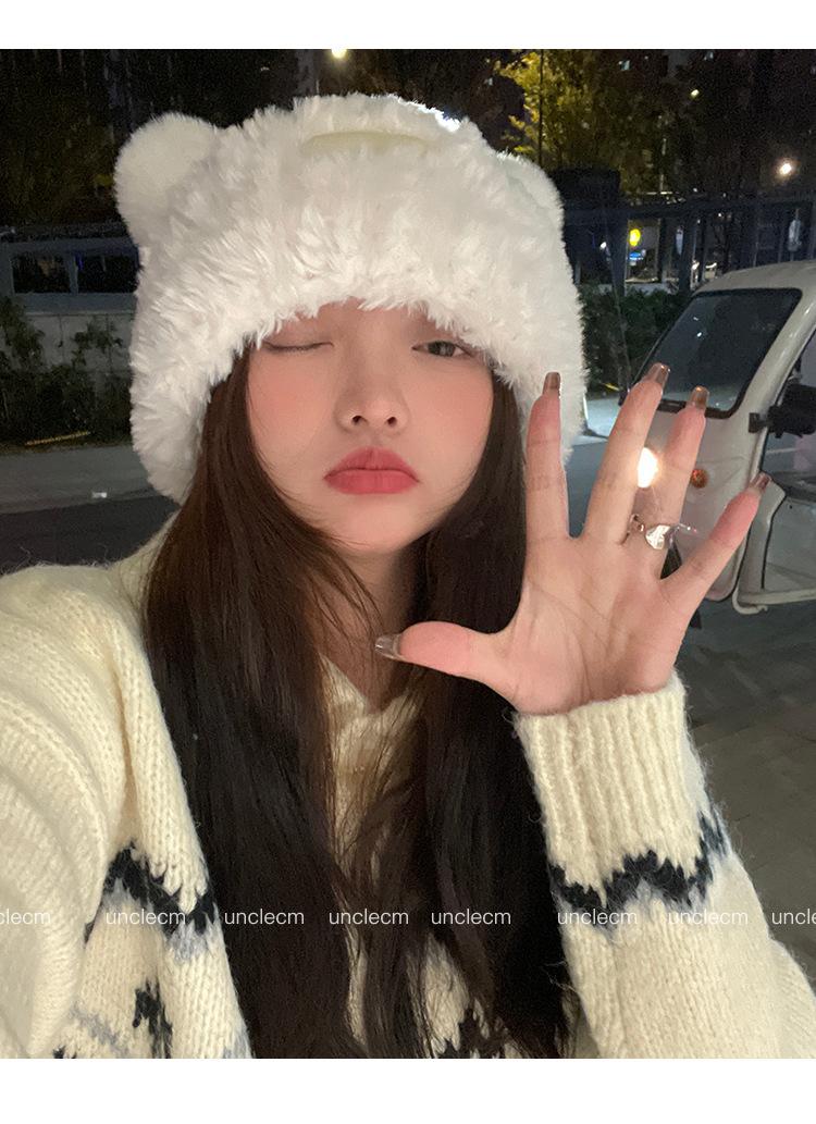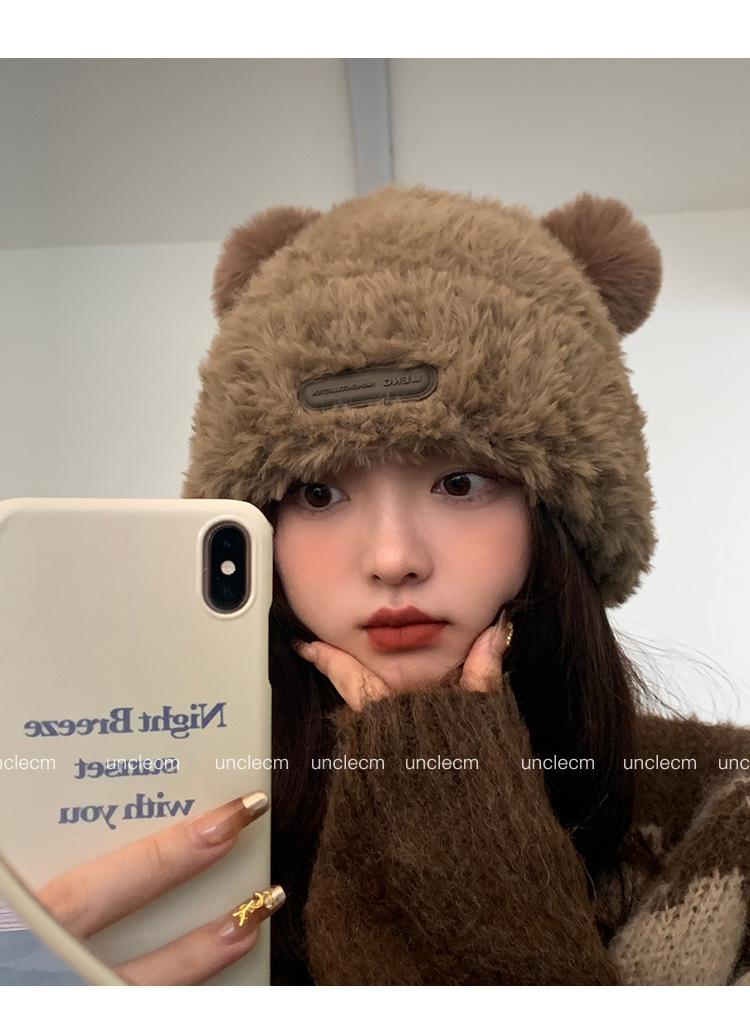 Bonito urso de pelúcia tricotado lã chapéu para mulheres outono e inverno engrossado quente pele sintética pullover earmuffs marrom