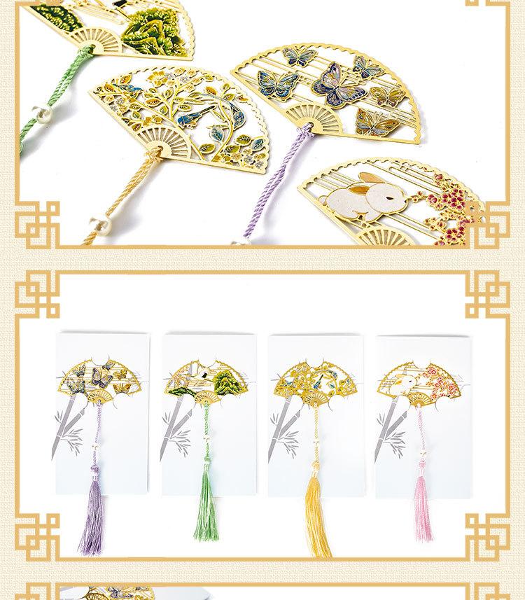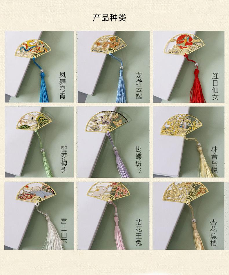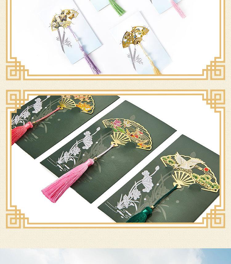 Marcador de página de metal em leque redondo estilo chinês, borla de latão, material retrô para estudantes, marcadores de presente, estoque grande
