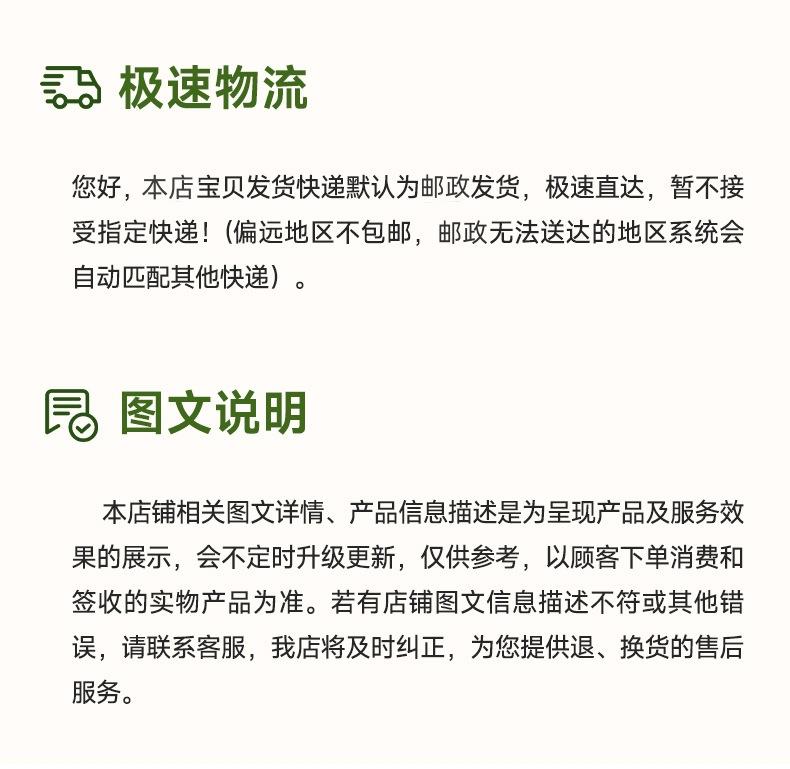 | 1. [Sobre questões de embalagem] Como cada marca muda e atualiza sua embalagem de tempos em tempos todos os anos, a loja não é notificada a tempo, resultando na impossibilidade de alterar as imagens vinculadas a tempo. Geralmente há um período de transição entre a embalagem antiga e a nova. A embalagem dos produtos enviados pode ser inconsistente com as imagens vinculadas. Consulte o produto real recebido. Eles são todos autênticos e podem ser usados com confiança. 2. [Sobre entrega expressa] O sistema de entrega da nossa loja corresponde automaticamente à entrega expressa apropriada: Postal Express, Yunda Express e ZTO Express. Nenhuma entrega expressa é especificada. Caso precise agilizar a entrega pelo SF Express, entre em contato com o atendimento ao cliente a tempo de negociar e compensar a diferença para entrega. 3. [Sobre danos] O armazém verificará as mercadorias antes de enviá-las. Itens frágeis serão embalados e enviados com segurança. Podem ocorrer danos durante entregas expressas múltiplas. Certifique-se de verificar as mercadorias a tempo após recebê-las. Se houver algum dano, tire uma foto e entre em contato com o atendimento ao cliente dentro de 24 horas após receber a mercadoria e guarde a caixa, caso contrário ela não poderá ser processada. 4. [Sobre devoluções] Se você não precisar mais das mercadorias após recebê-las, oferecemos 7 dias de devolução incondicional sem qualquer motivo, desde que as mercadorias não afetem a venda secundária (exceto para algumas mercadorias especiais, como garantia temporária e liberação oferta). Para devoluções não relacionadas à qualidade, o comprador deverá arcar com os custos de envio do comerciante. Entre em contato com o atendimento ao cliente para consulta específica. 5. [Sobre interceptar o correio] Se o correio do pedido foi realmente enviado, o comprador solicita apenas um reembolso e o correio é interceptado, o comprador precisa arcar com os custos de envio de ida e volta. Entre em contato com o atendimento ao cliente para negociações específicas. |