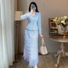 Vestido Estilo Chanel Primavera e Outono 2024 Primavera Novo Elegante Celebridade Bolo Saia Folha de Lótus Festa Conjunto de Duas Peças