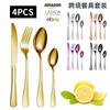 Conjunto de Talheres de Aço Inoxidável 1010 Transfronteiriço da Amazon Hotel Estilo Western Faca de Bife, Garfo e Colher Banhados a Ouro 4 Peças Principais