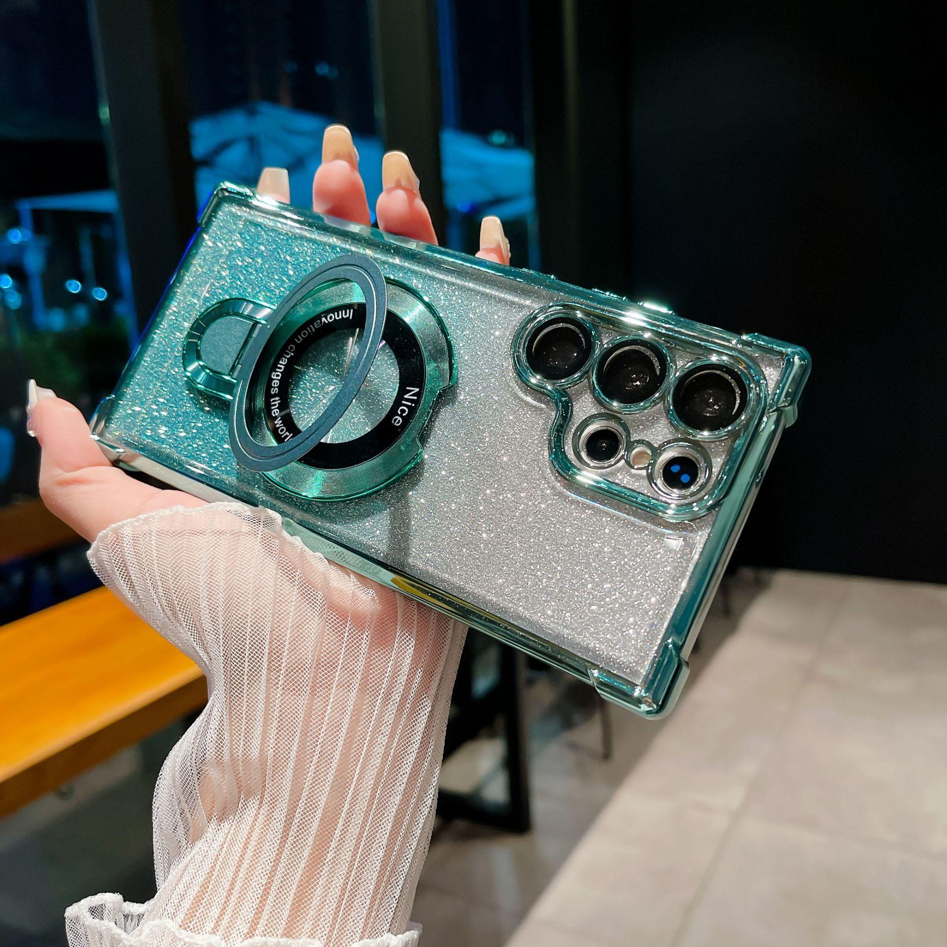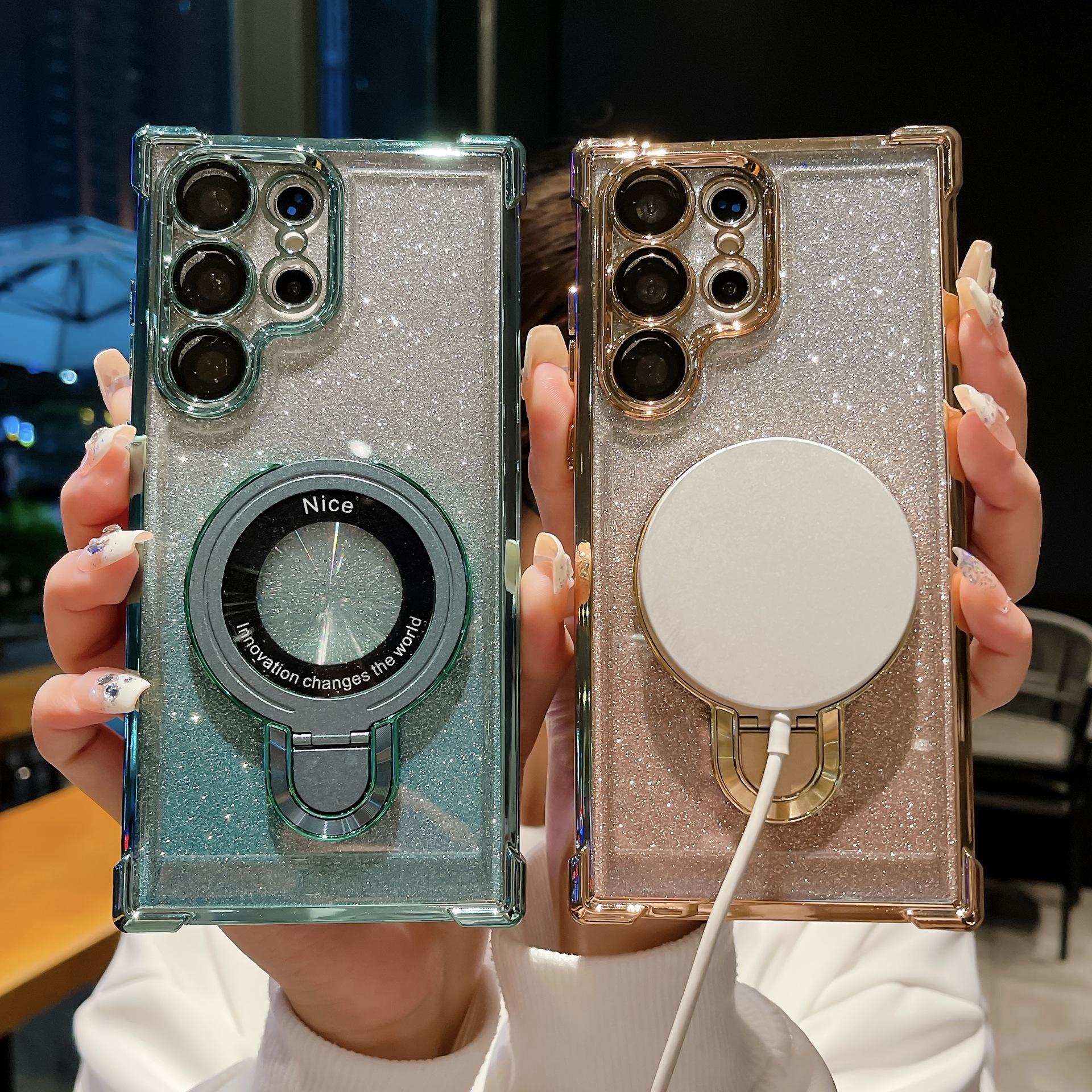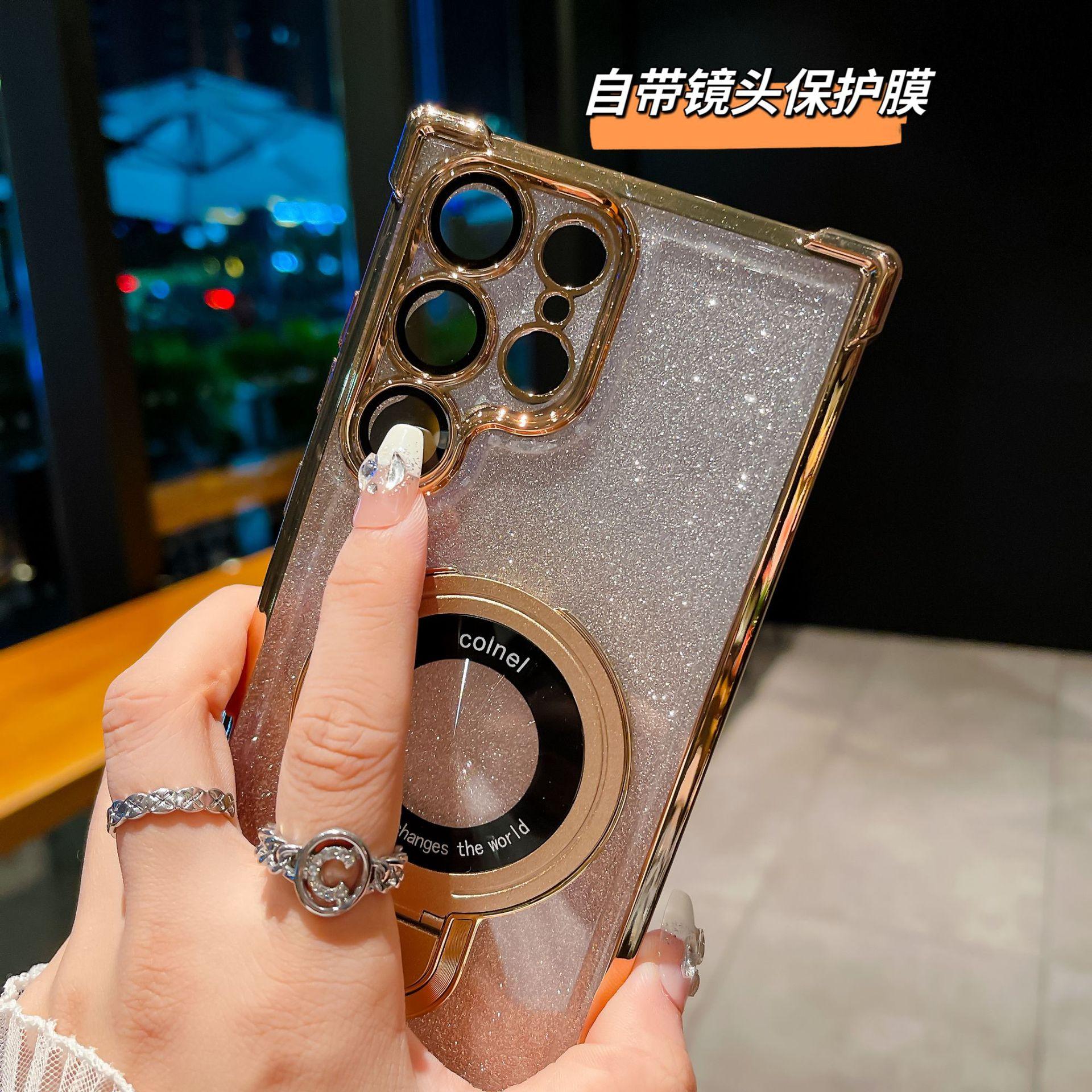 Adequado para Samsung S24Ultra Suporte Magnético Capa de Celular Galvanizada Airbag de Quatro Cantos S23Fe Glitter Gradiente Capa Macia +