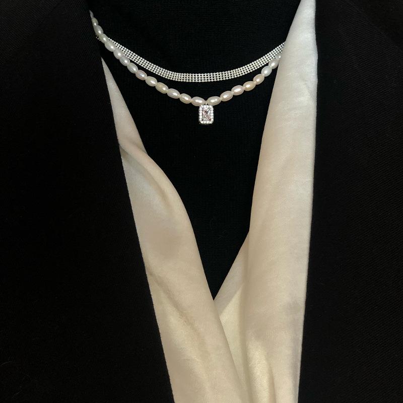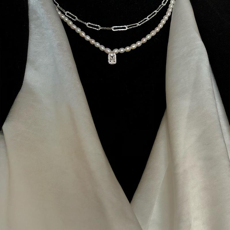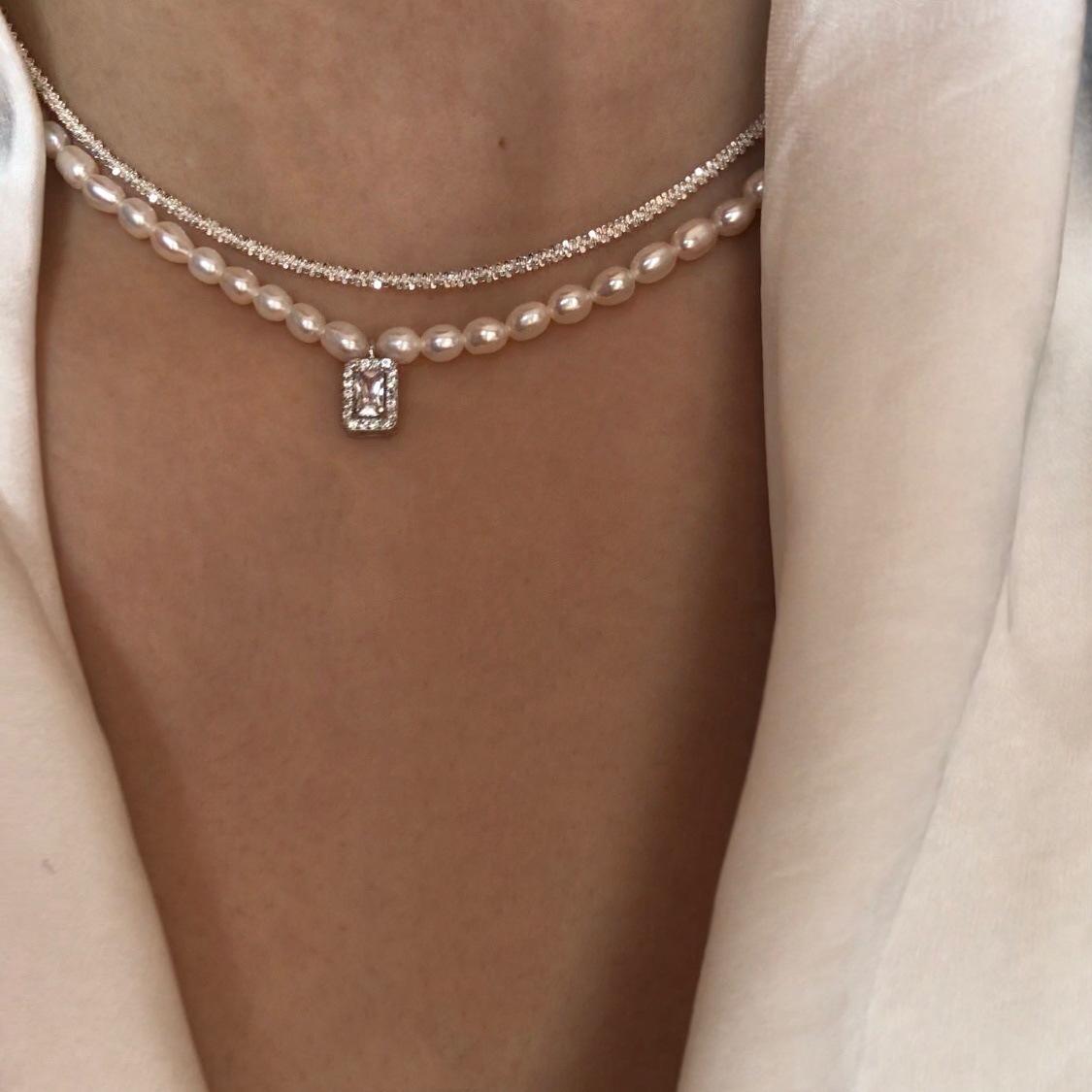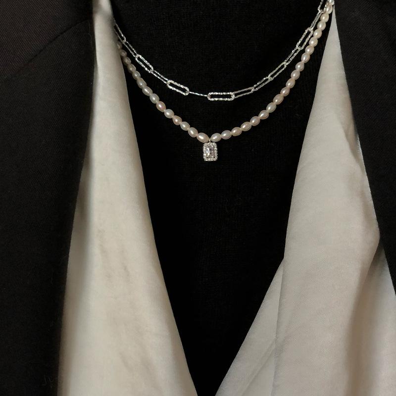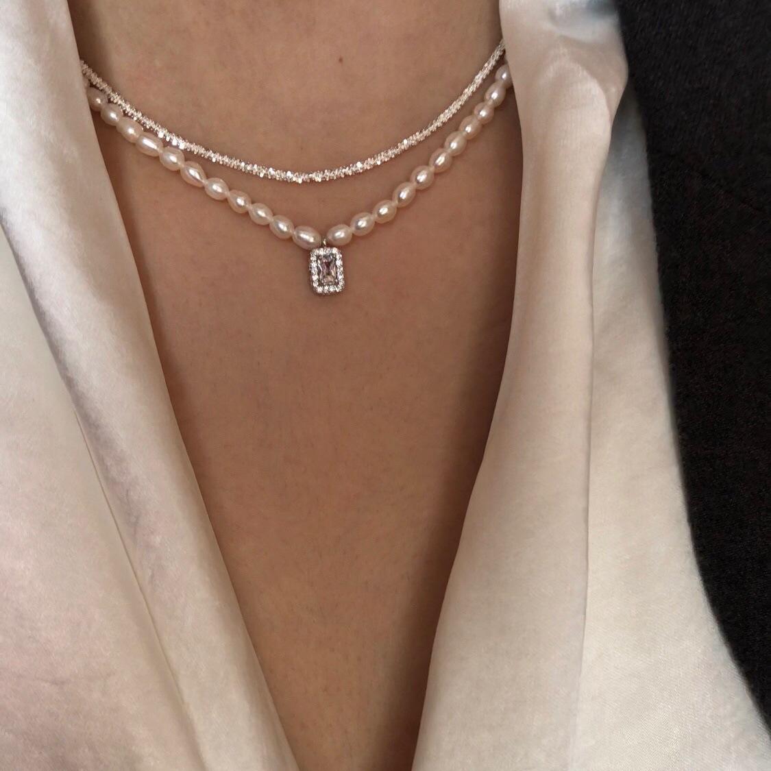 925 Sterling Silver Arroz Grão Pérola de Água Doce Colar de Diamante Quadrado Vintage Sobreposto Luz de Luxo Elegante Clavícula Cadeia Colar Cadeia