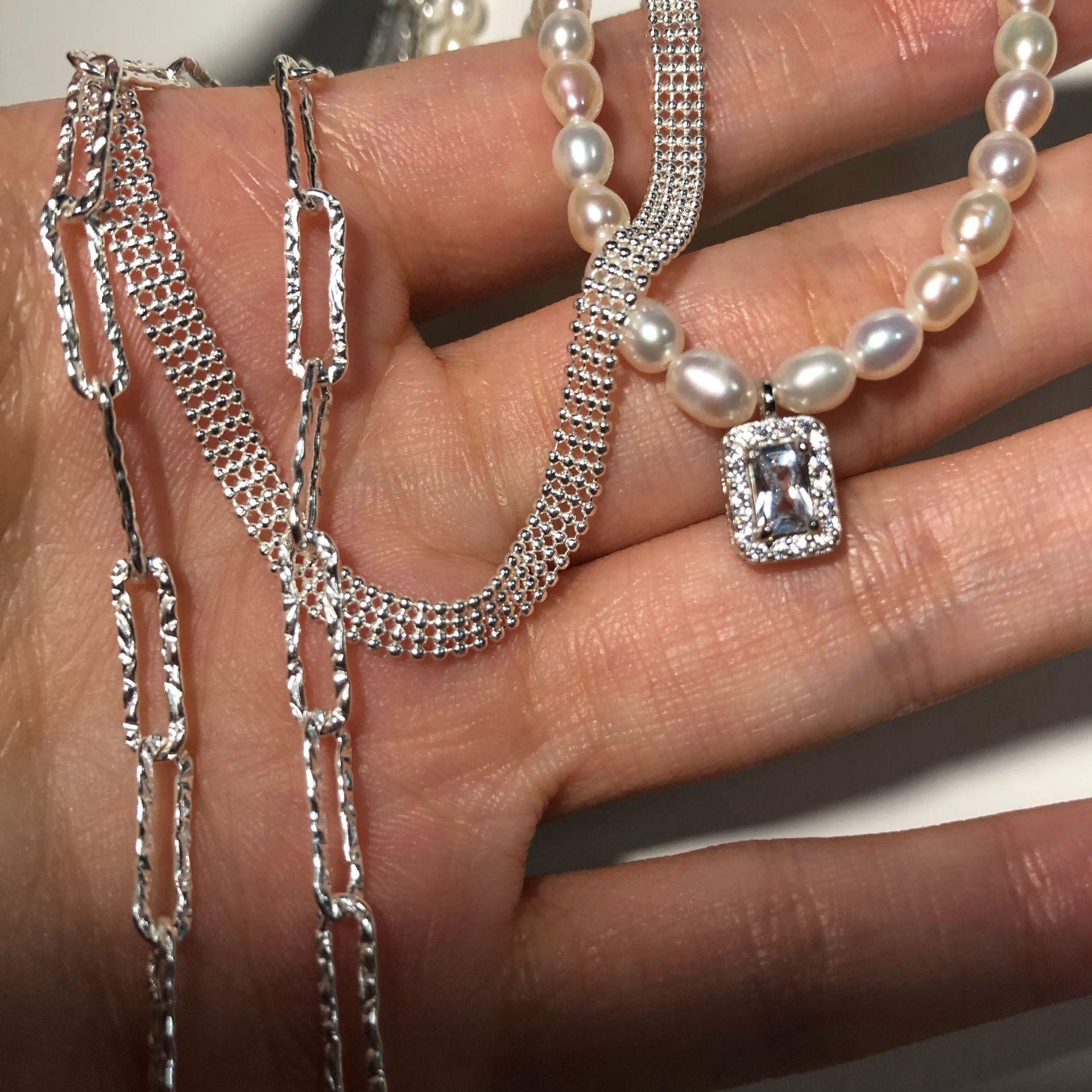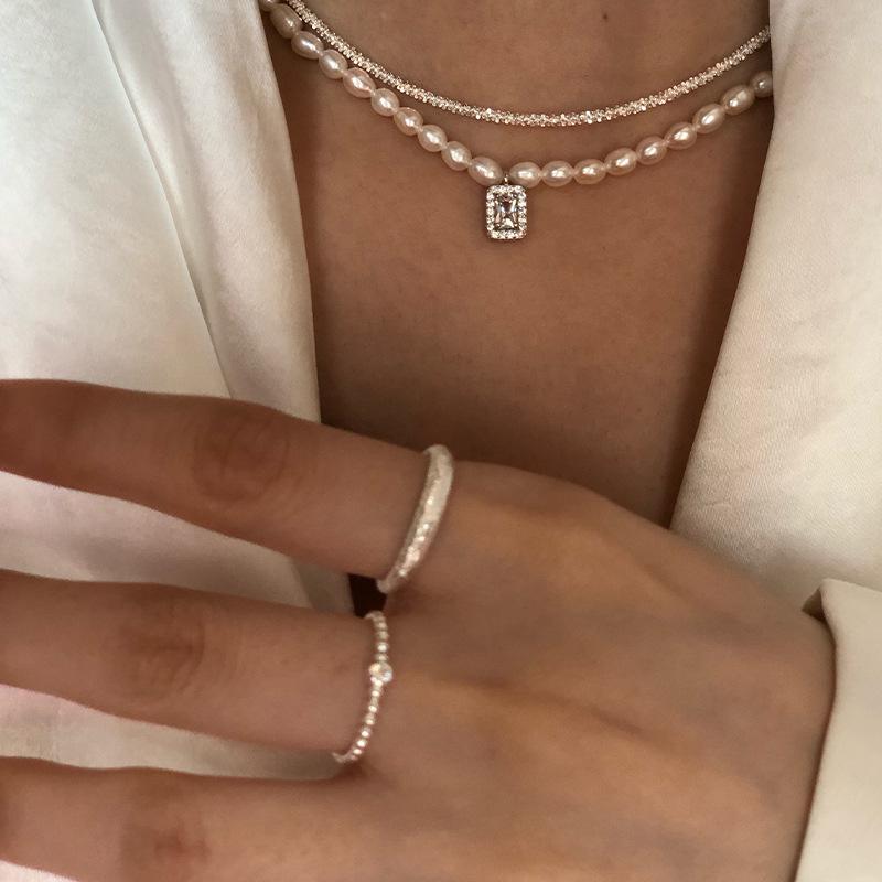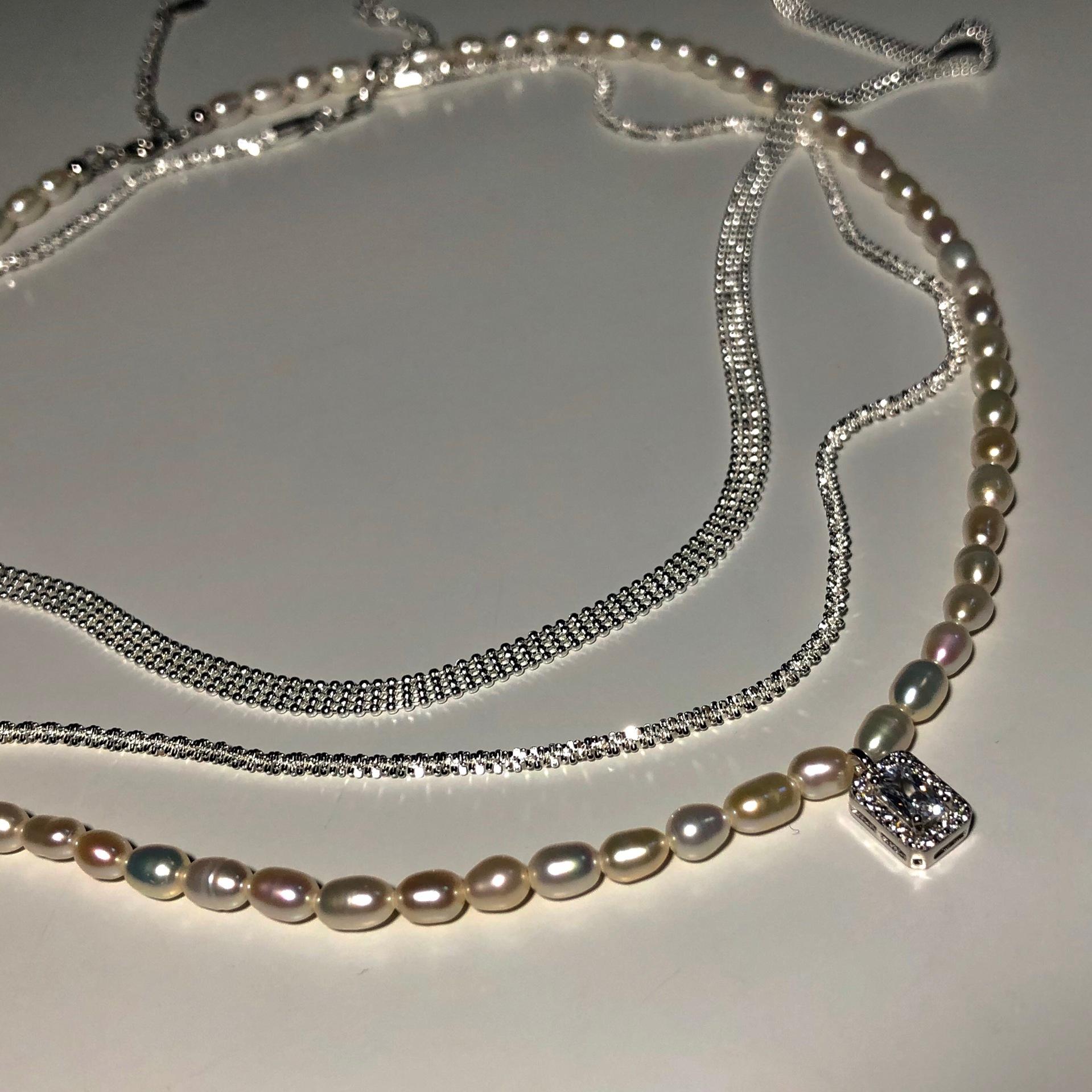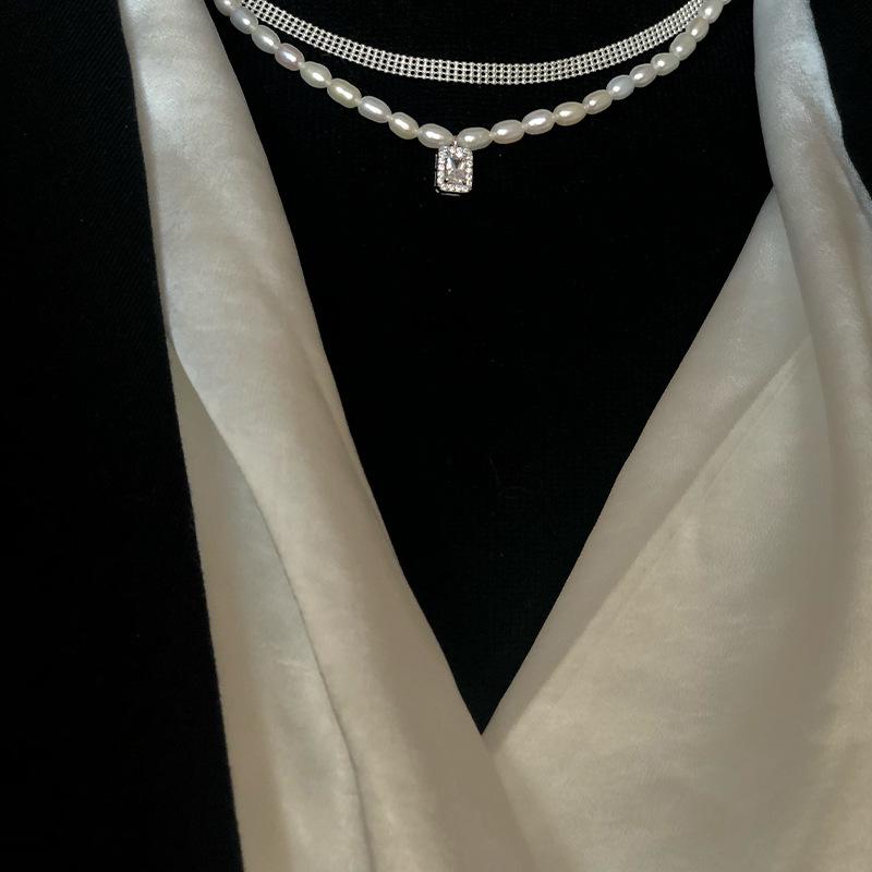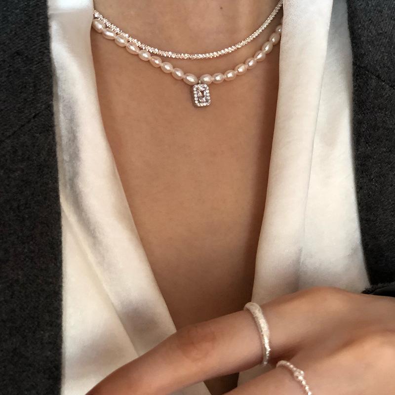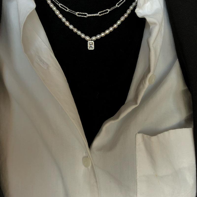 925 Sterling Silver Arroz Grão Pérola de Água Doce Colar de Diamante Quadrado Vintage Sobreposto Luz de Luxo Elegante Clavícula Cadeia Colar Cadeia