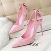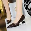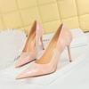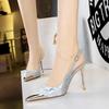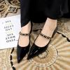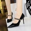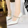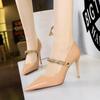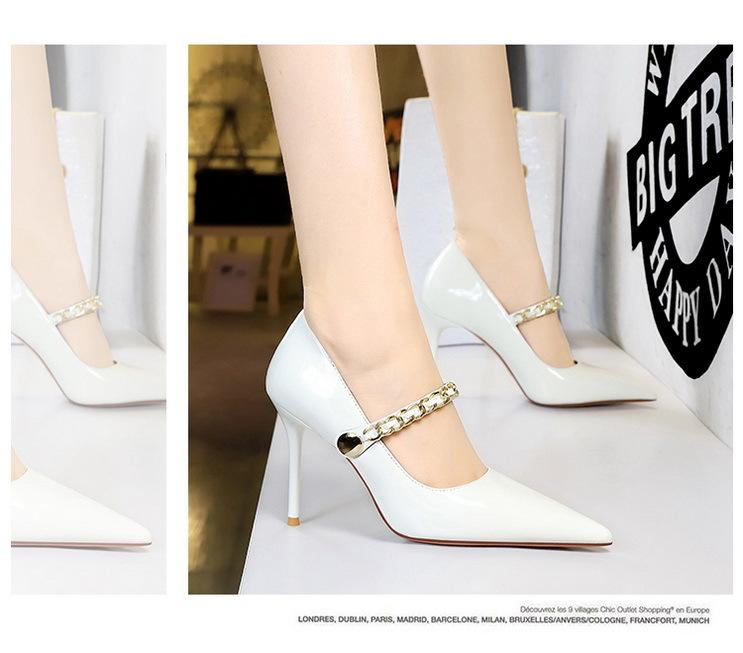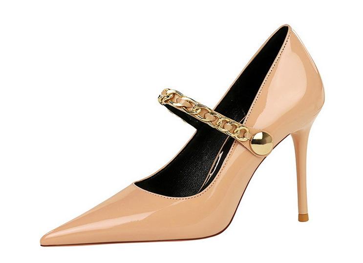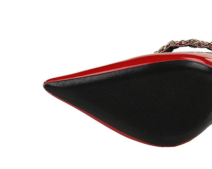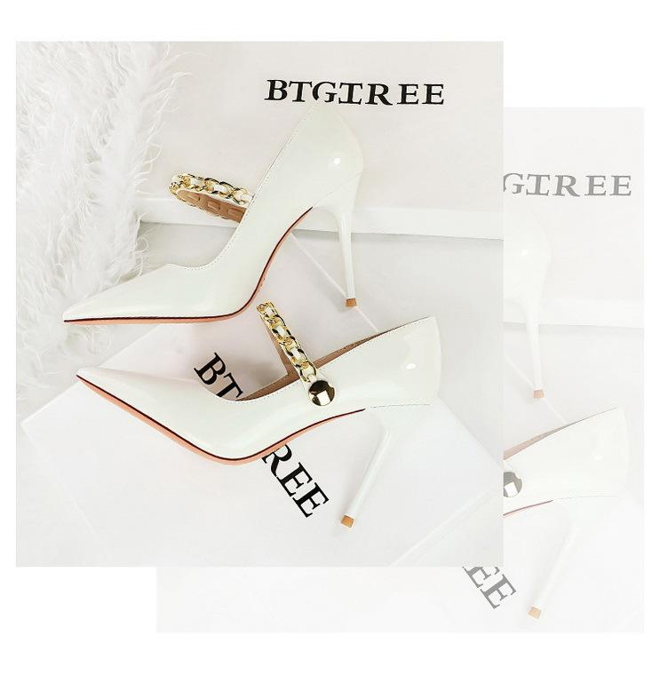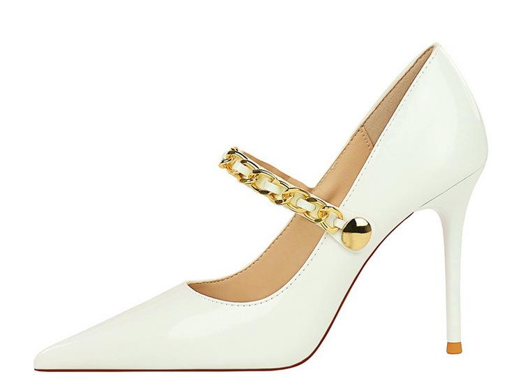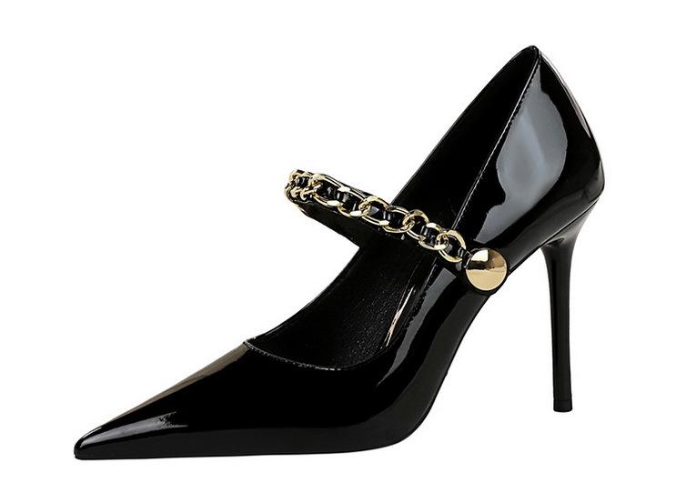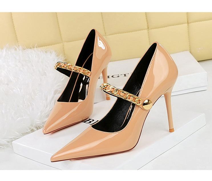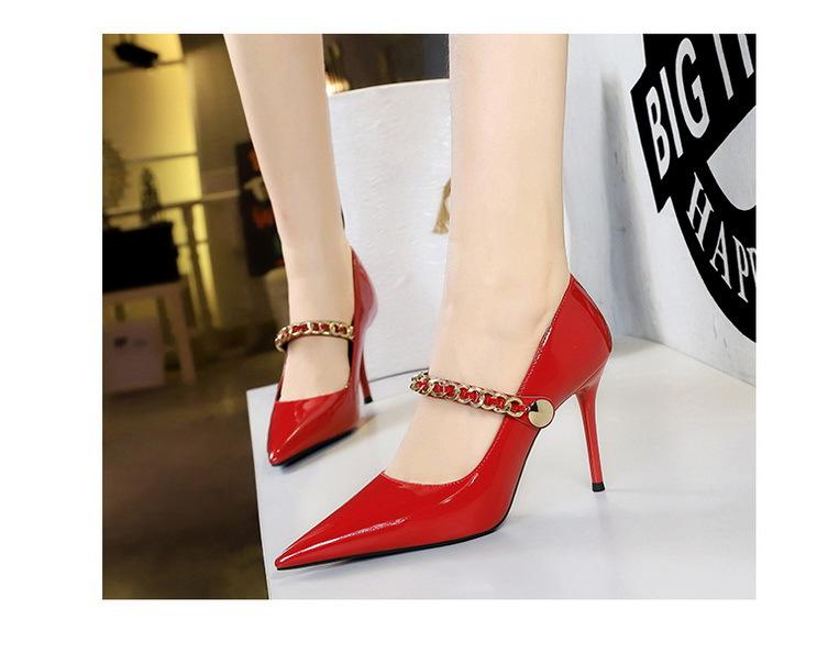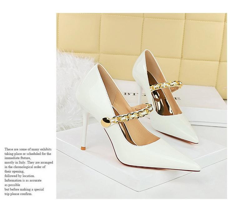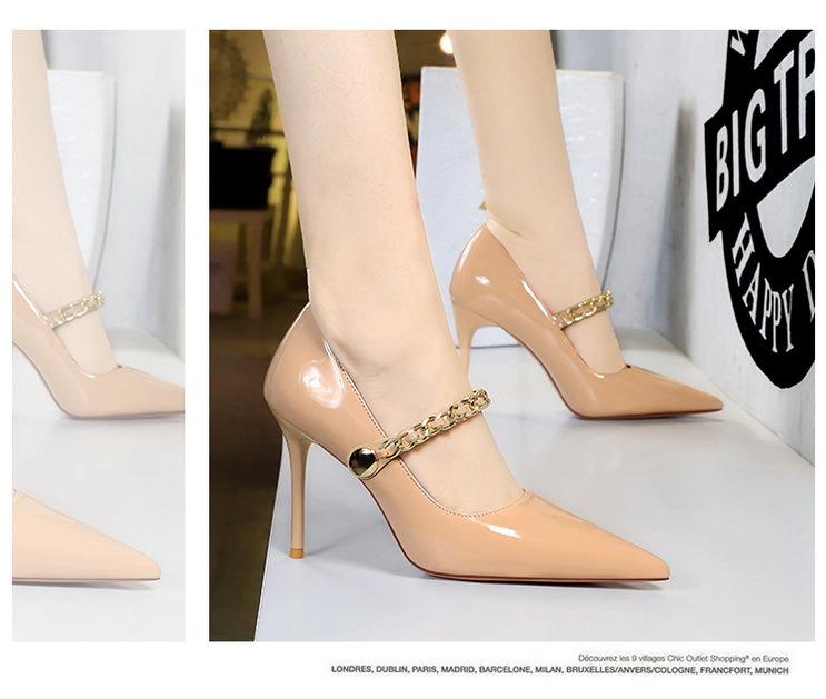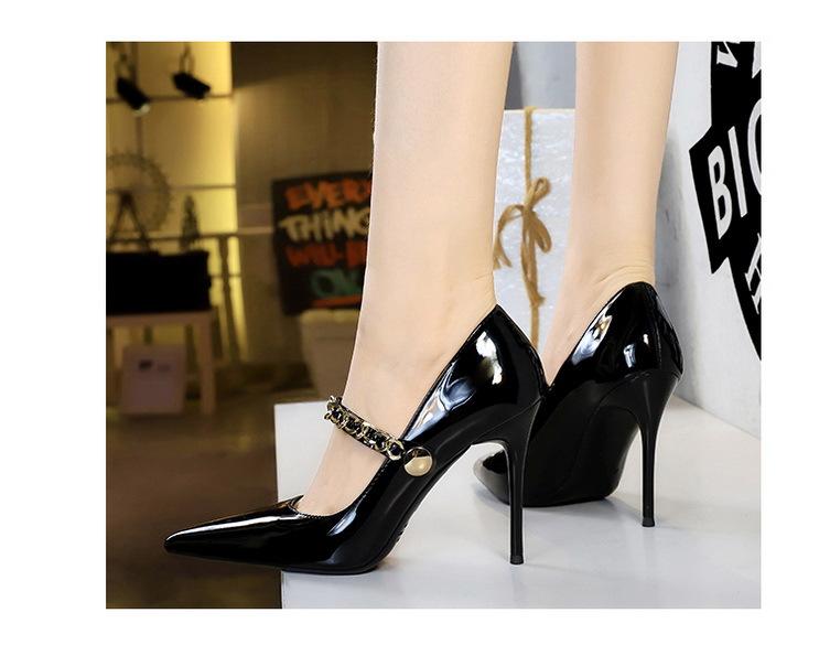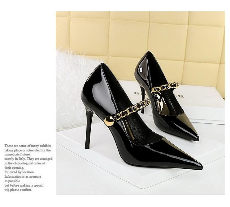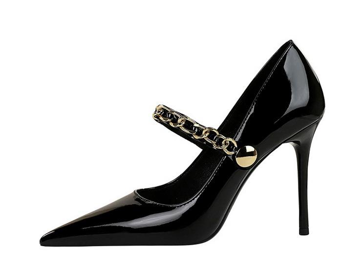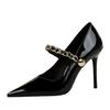 Elementos populares: saltos altos super altos da moda estilo europeu e americano, couro envernizado brilhante, corrente de ouro, corrente de metal, cinto único