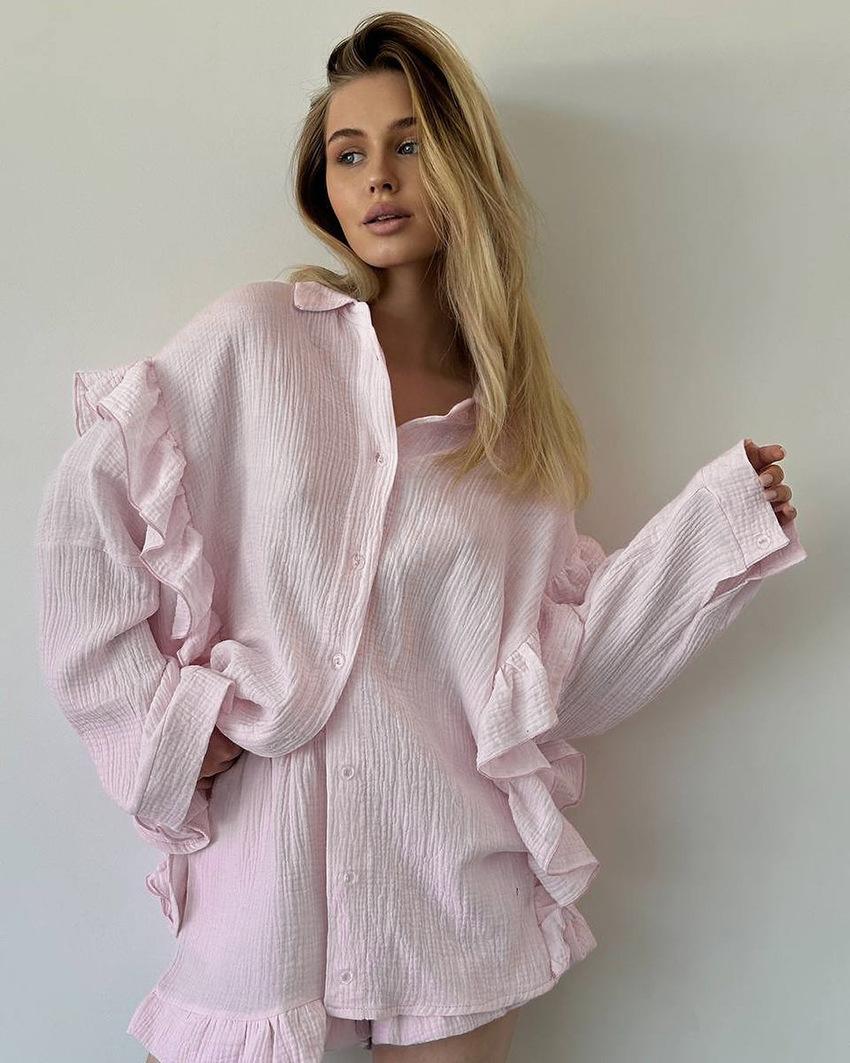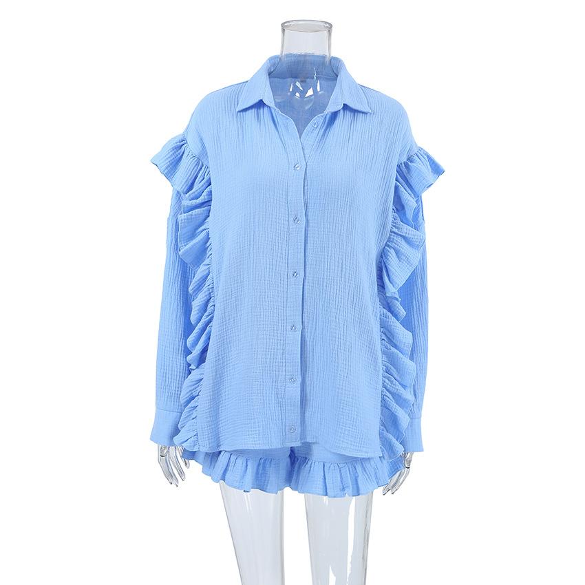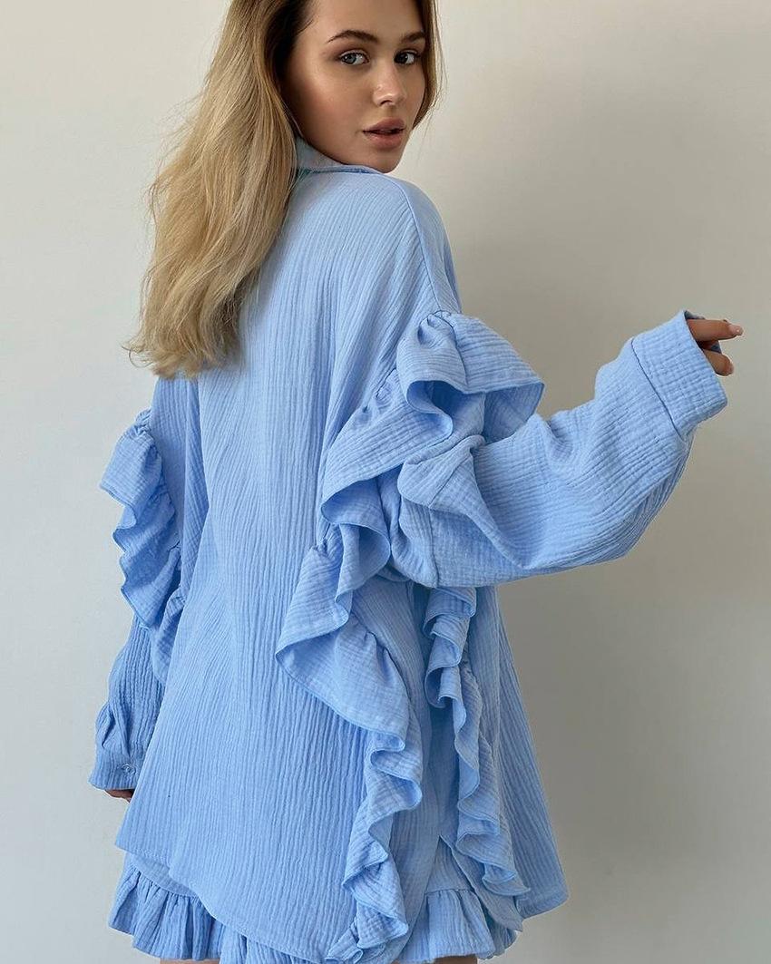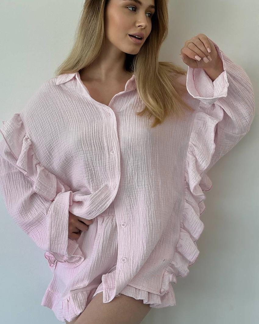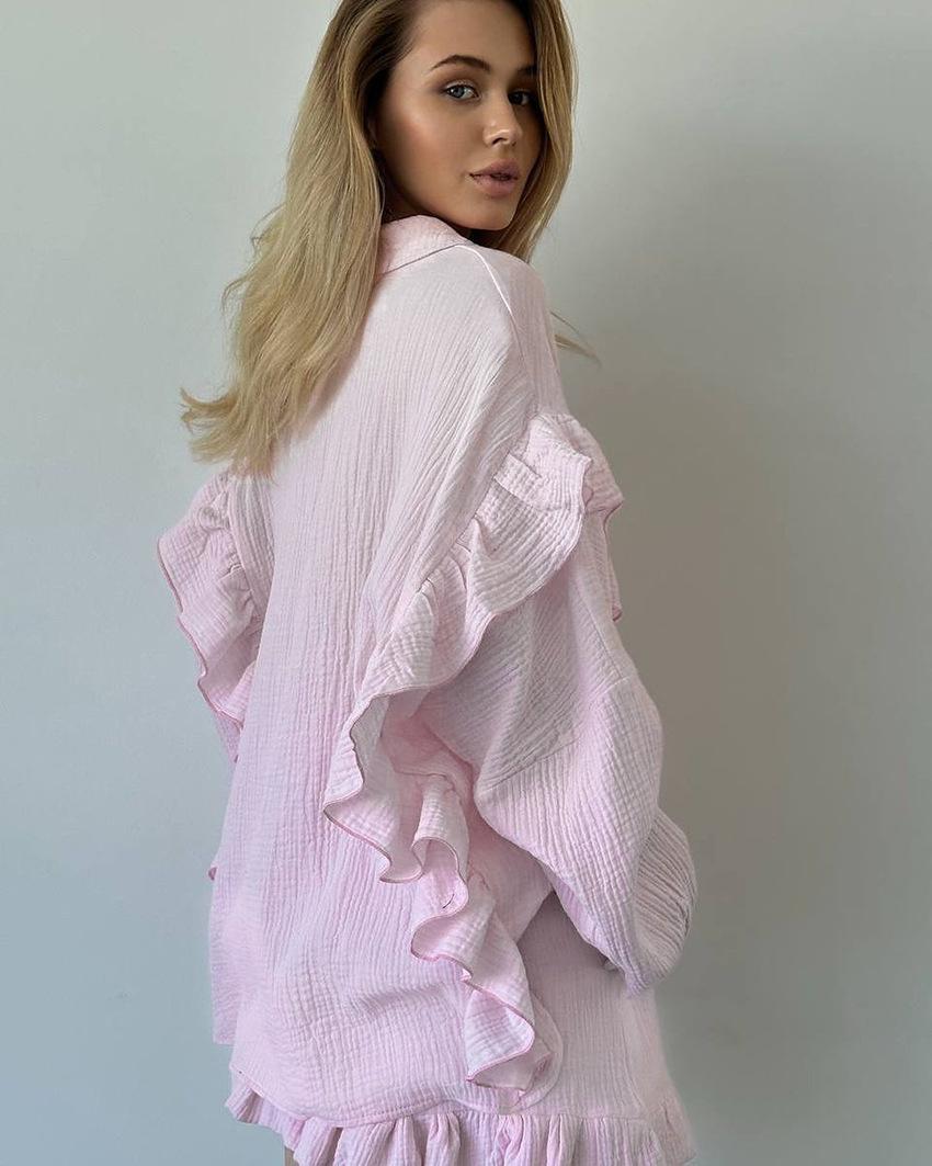 Pijamas de mujer transpirables de manga larga con volantes de algodón de moda de otoño y verano de 2024 en Europa y Estados Unidos, ropa de hogar transfronteriza.