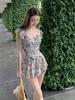 2025 Novo Maiô Floral de Uma Peça Feminino Boxer Babados Conservador Menininha Alça Halter Cintura Alta Cobrindo a Barriga Águas Termais