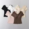 Renda Gola Quadrada Floral Ombro Camiseta de manga curta Verão Feminino Hot Girl Sexy Gola Baixa Slim-fit Top Curto