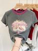 Camiseta curta de manga curta estampada com gola contrastante feminina 2024 verão novo desenho animado gola redonda ombro camiseta de meia manga