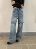 [9Hour] Jeans com Design Falso de Duas Peças 2025 Outono Retrô Desgastado Calças de Perna Larga para Mulheres A9093