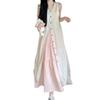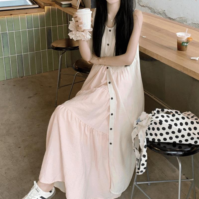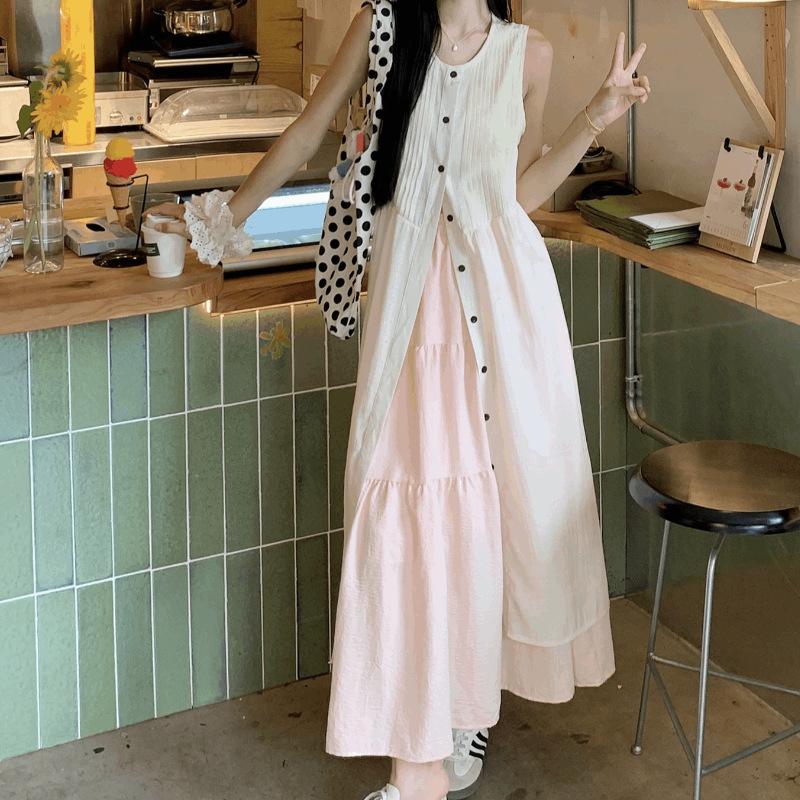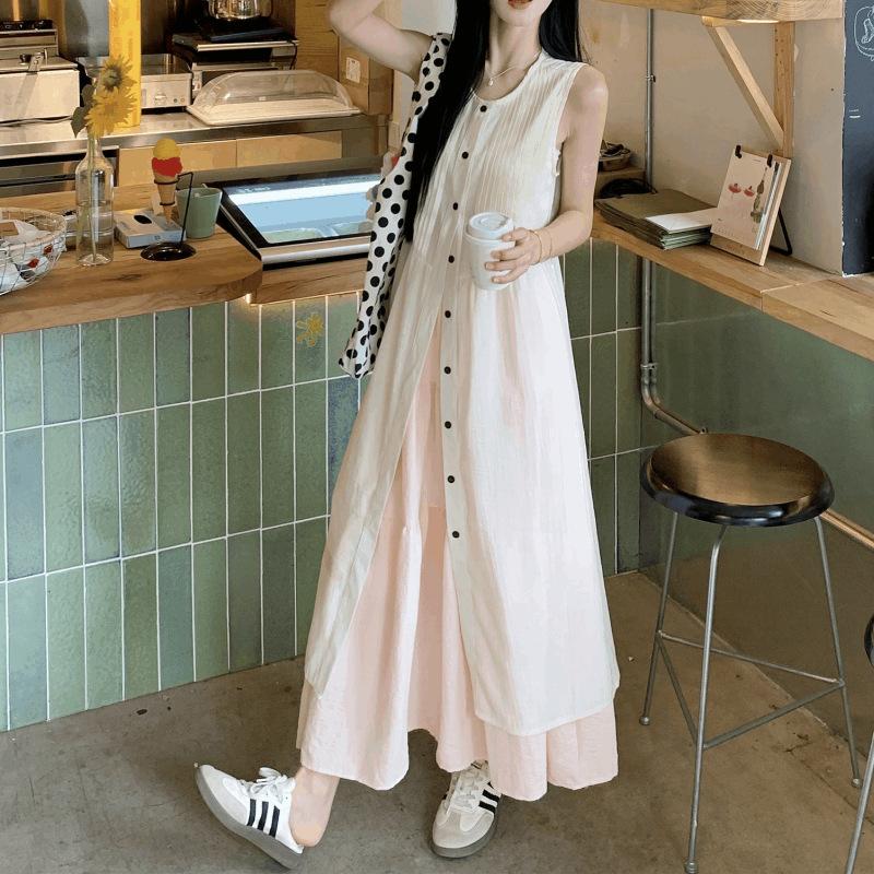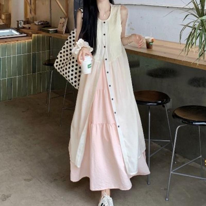 Terno da moda sem mangas, vestido de camisa plissada, feminino, verão 2025, saia de cintura alta, saia longa, conjunto de duas peças